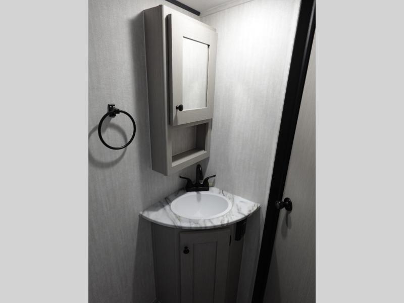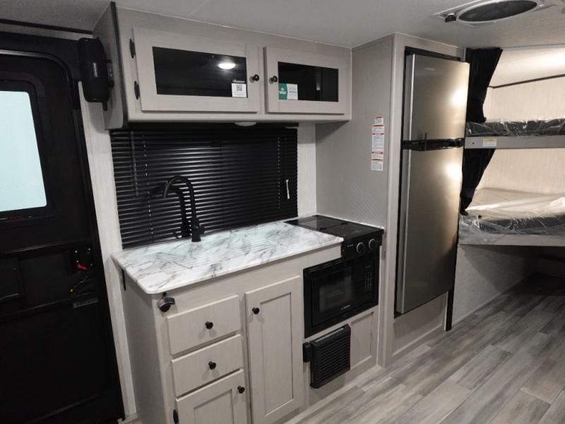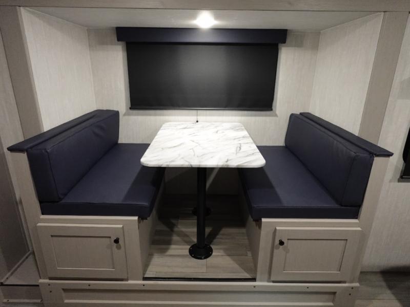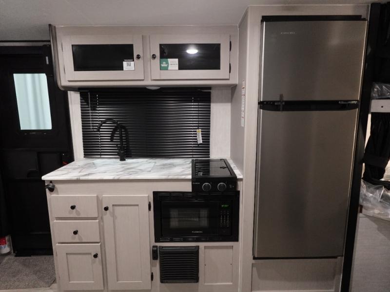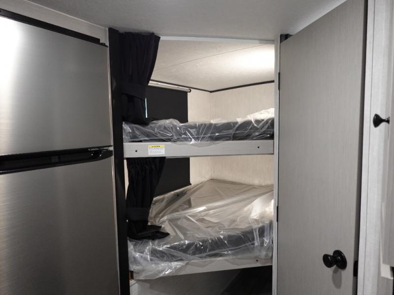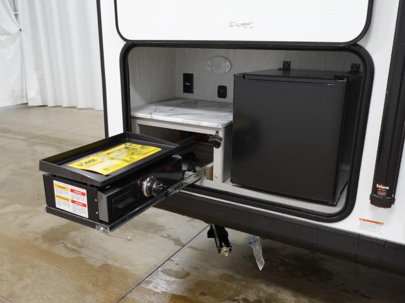 You and a few friends or family members can camp comfortably in this travel trailer! It features a front queen bed with wardrobes on either side to keep your clothes out of the way. Two others can sleep on the rear corner upper double bed and lower flip up double bed. After you have fried up some eggs on the two burner cooktop and heated up a piece of banana bread in the microwave, you can head to the booth dinette slide to enjoy it. There is even a pantry to store your coffee grounds and snacks. Now that your bellies are full, you can freshen up in the rear corner bathroom with the tub/shower.