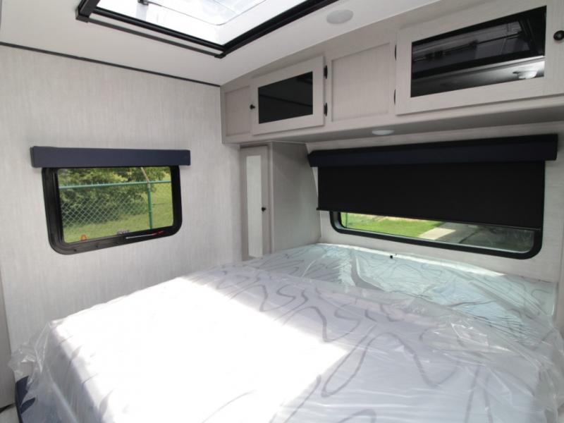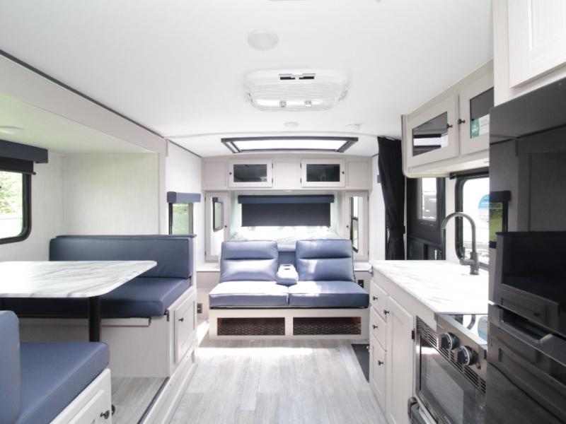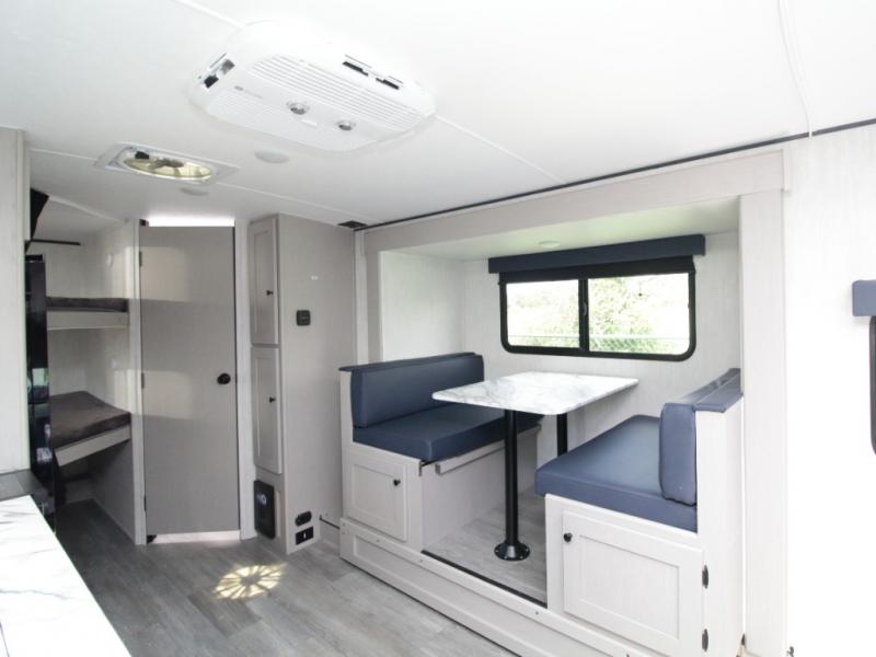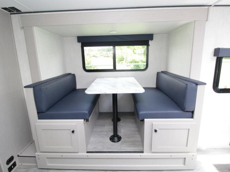 The front of the trailer features a walk-around queen bed with storage on both sides, or you can upgrade to the optional Murphy bed to create more daytime living space. The booth dinette slide-out adds interior room for meals, games, or working on the go, and also converts into additional sleeping space.