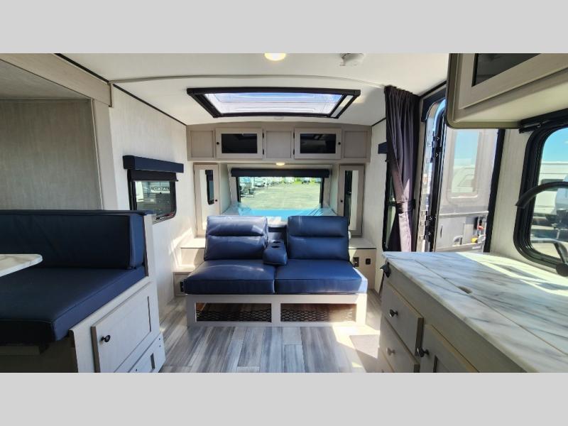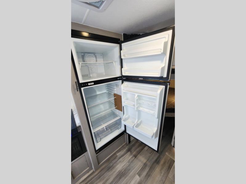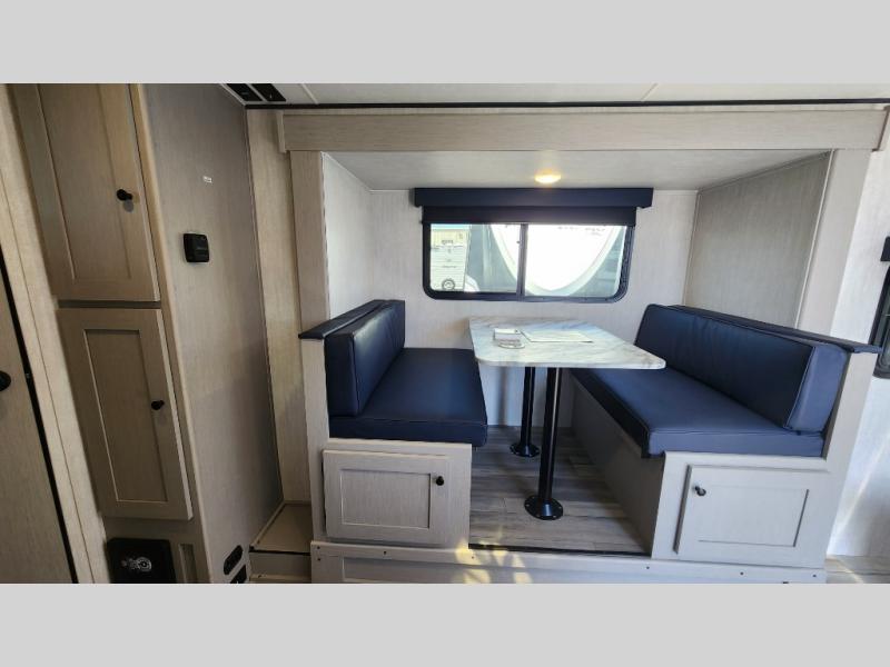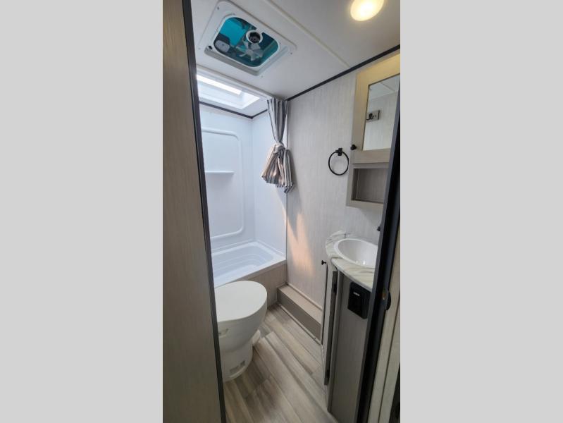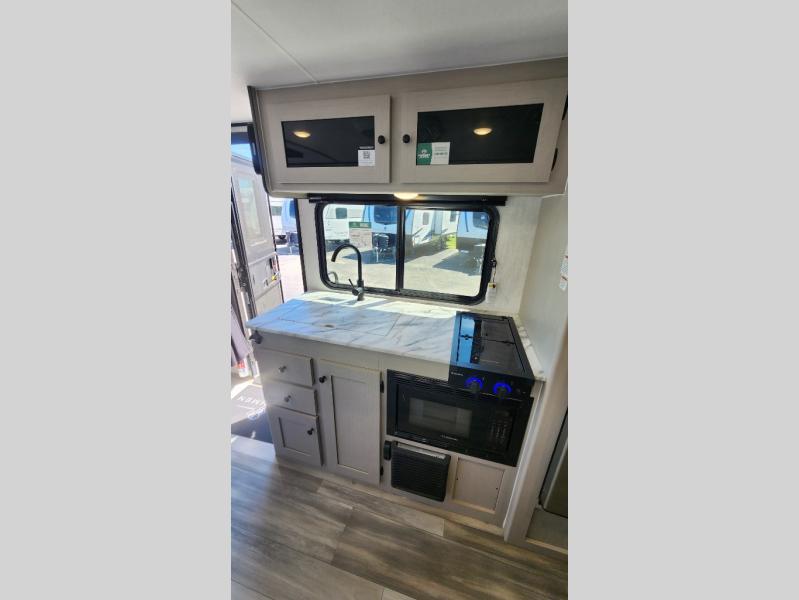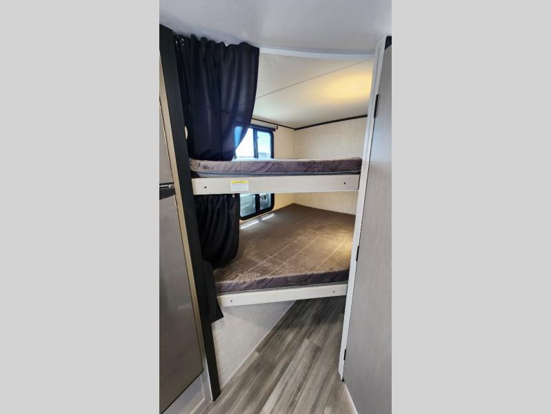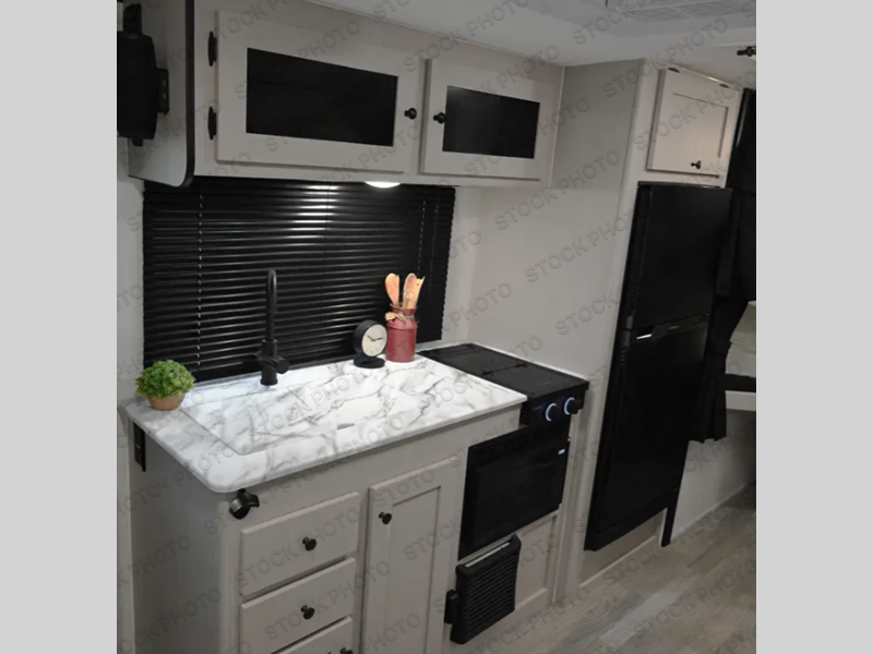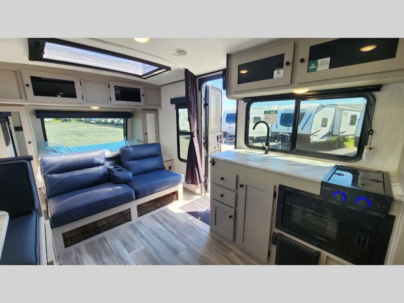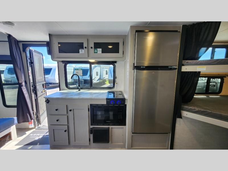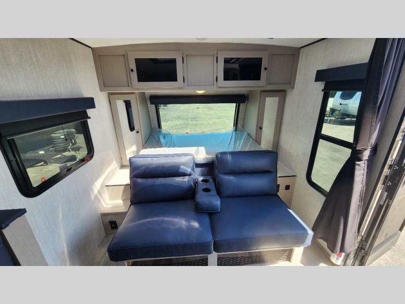 You and a few friends or family members can camp comfortably in this travel trailer! It features a front queen bed with wardrobes on either side to keep your clothes out of the way or you can switch it out for the optional Murphy bed for more versatility. Two others can sleep on the rear corner upper double bed and lower flip up double bed. After you have fried up some eggs on the two burner cooktop and heated up a piece of banana bread in the microwave, you can head to the booth dinette slide to enjoy it. There is even a pantry to store your coffee grounds and snacks. Now that your bellies are full, you can freshen up in the rear corner bathroom with the tub/shower.