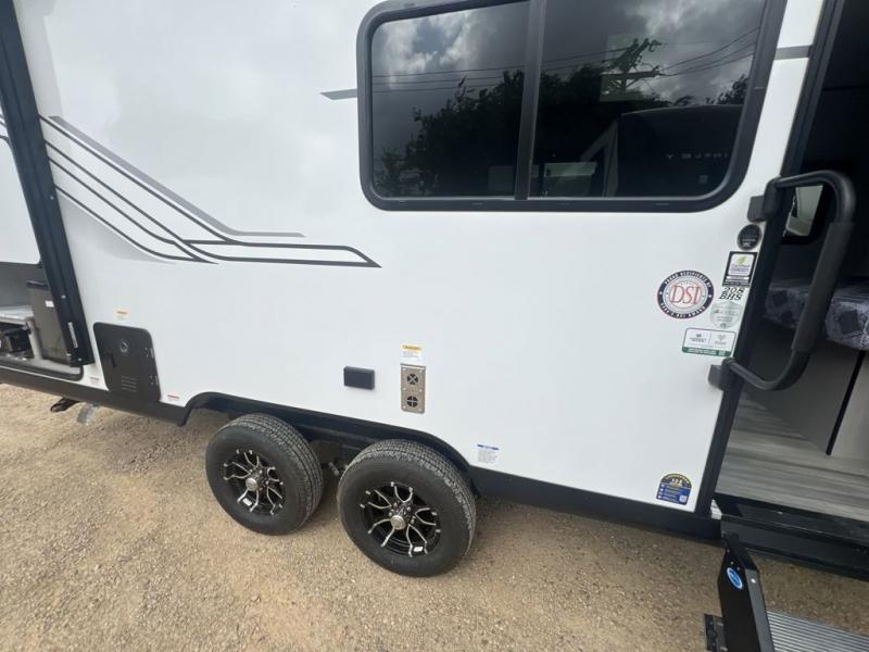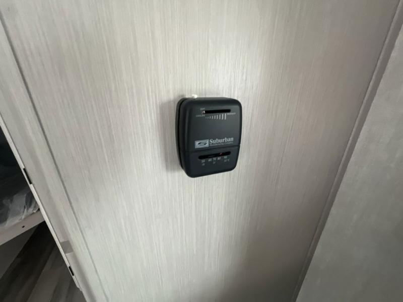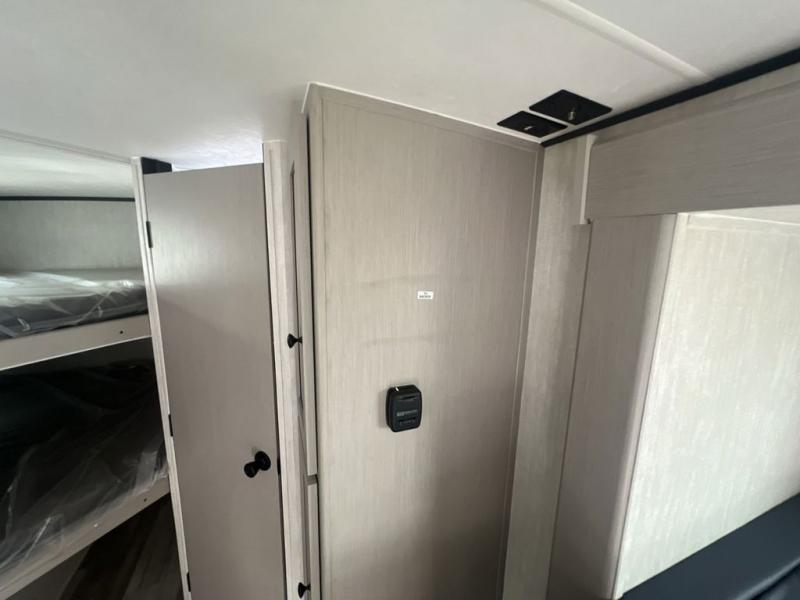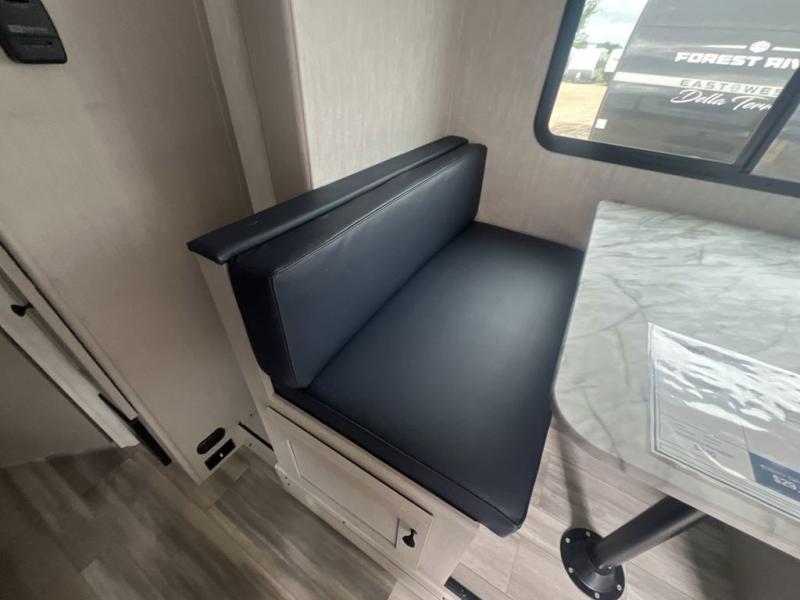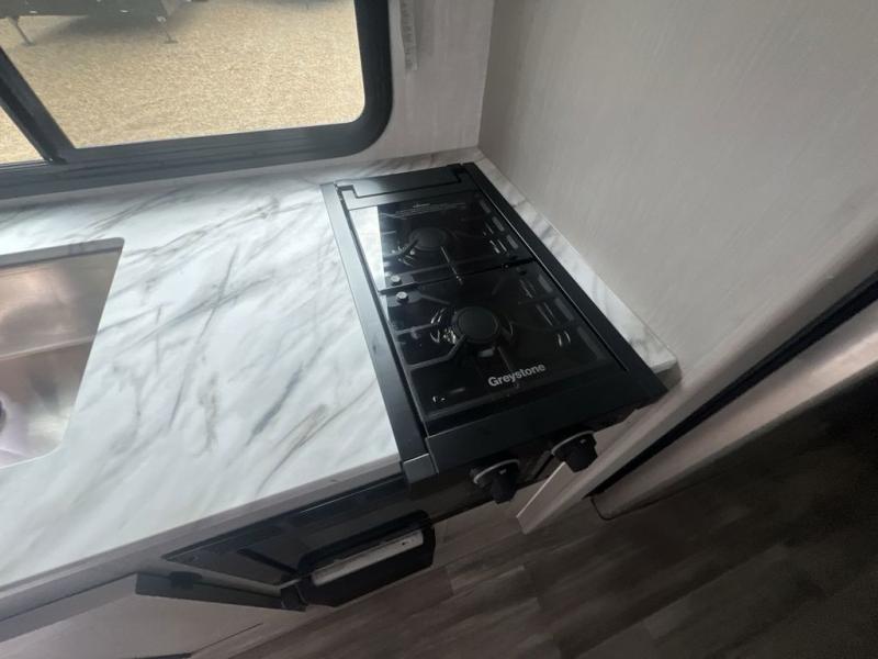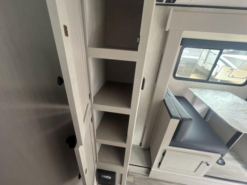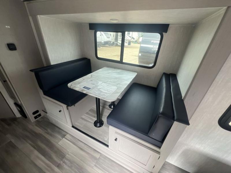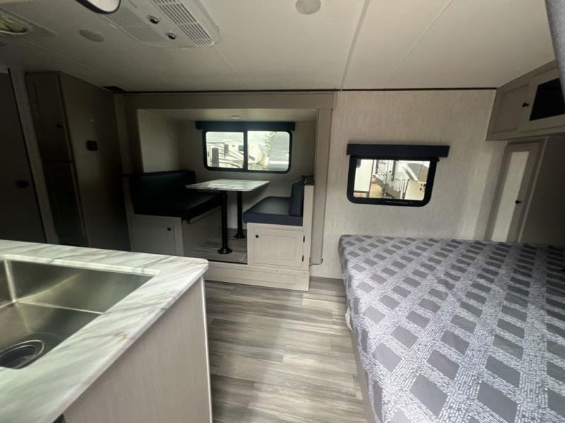 You and a few friends or family members can camp comfortably in this travel trailer! It features a front queen bed with wardrobes on either side to keep your clothes out of the way or you can switch it out for the optional Murphy bed for more versatility. Two others can sleep on the rear corner upper double bed and lower flip up double bed. After you have fried up some eggs on the two burner cooktop and heated up a piece of banana bread in the microwave, you can head to the booth dinette slide to enjoy it. There is even a pantry to store your coffee grounds and snacks. Now that your bellies are full, you can freshen up in the rear corner bathroom with the tub/shower.