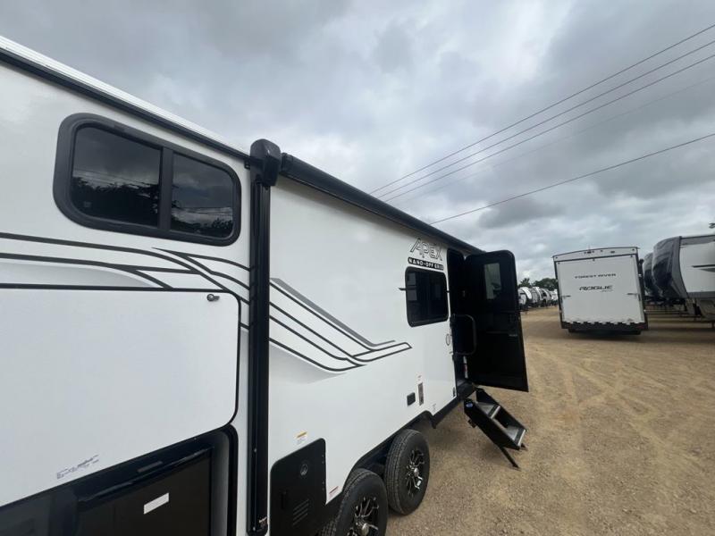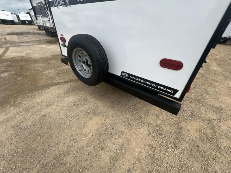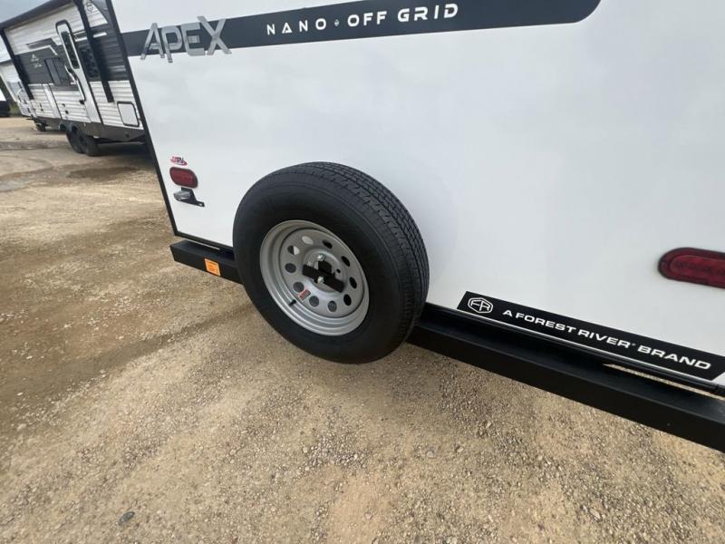 You will find comfort, convenience, and a sturdy construction with each of these Coachmen RV Apex Nano travel trailers! They are held together with an aluma-cage construction, an I-beam chassis, plus vacuum-bonded laminated dual Azdel fiberglass walls for double the protection against the elements. The 200-watt solar panel with a 30 amp control charger is included within the Off-Grid Package, along with two 20 lb. LP tanks, a high velocity power roof vent, plus 12V outlets to keep you powered up. More exterior feature include a hot/cold shower, four stabilizer jacks, a power awning with LED lighting, and magnetic baggage door catches to easily pack and unload your gear. You will love the interior of your Apex Nano with Congoleum residential flooring, one-piece seamless edge countertops, matte black hardware in the galley, and a hand-crafted wood medicine cabinet in the bath.