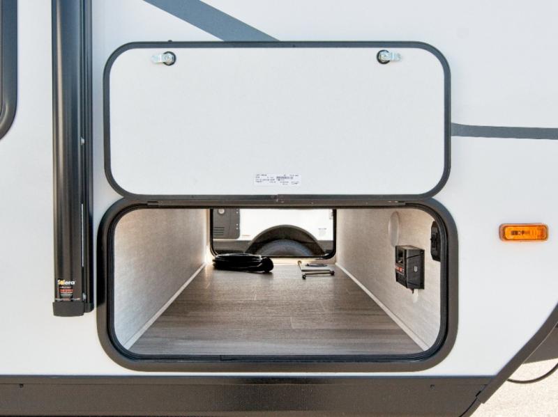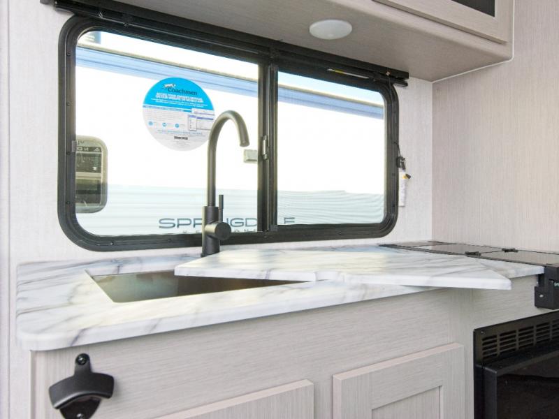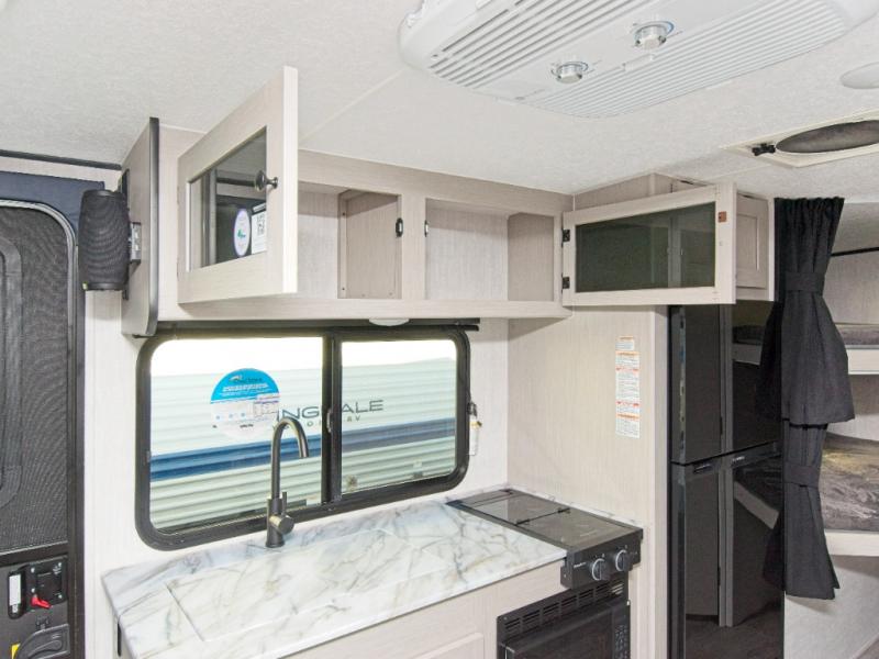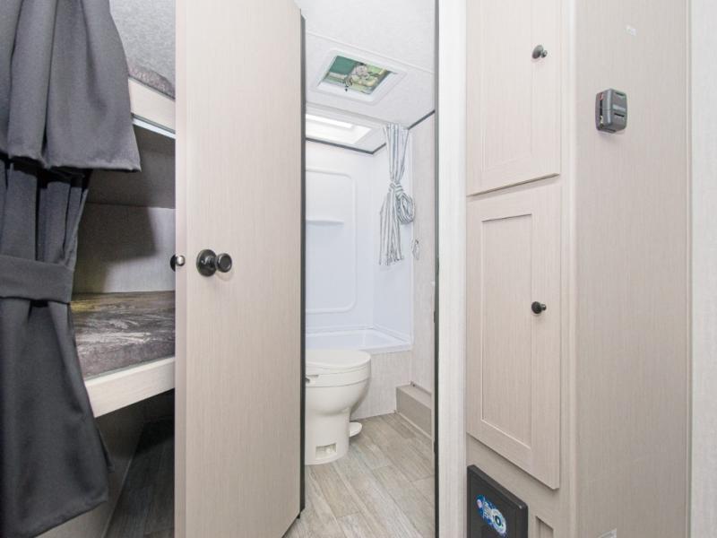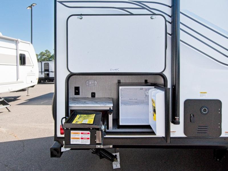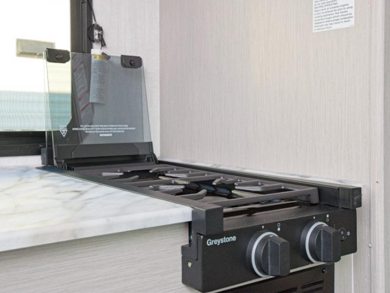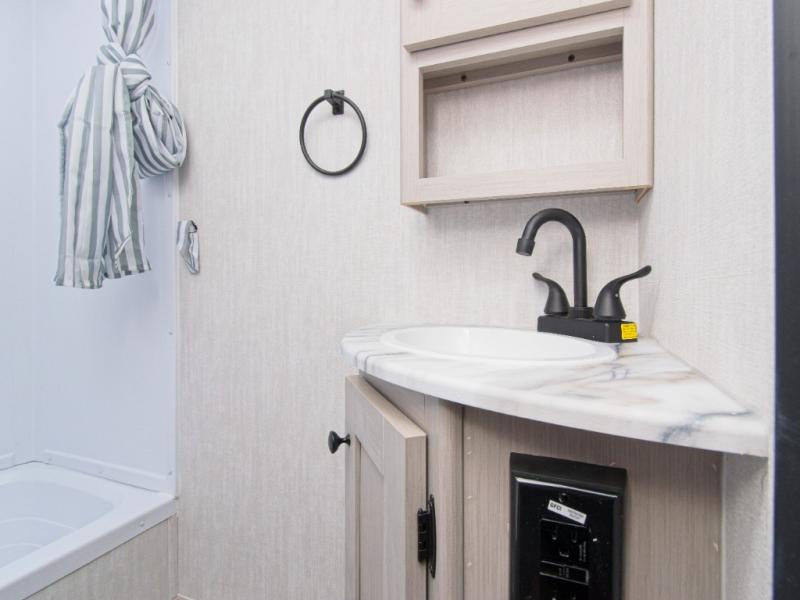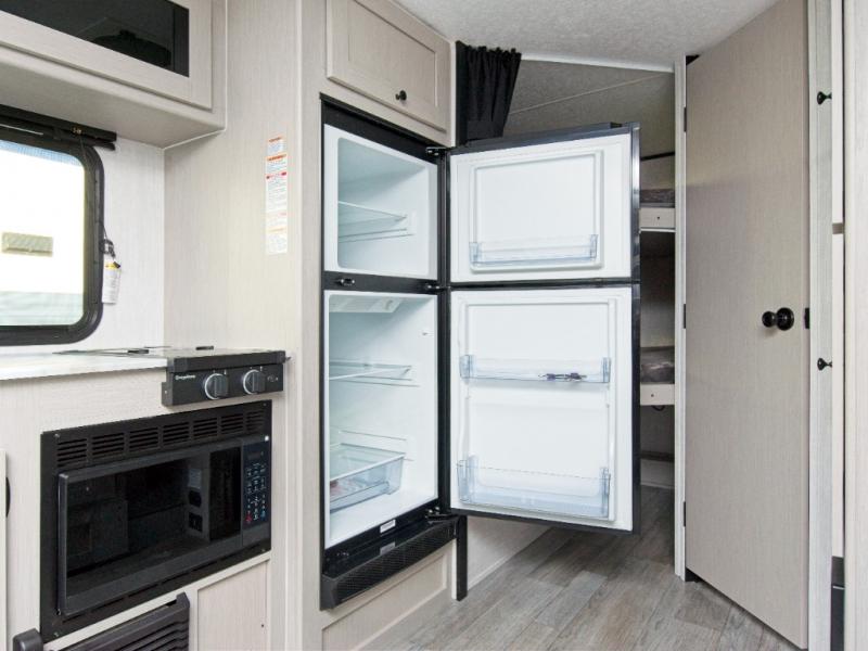 Prepare meals with the two-burner cooktop and microwave, then enjoy them at the dinette. A pantry keeps your snacks and essentials organized, and the rear corner bathroom with a tub/shower combo makes cleanup easy after a day outdoors.