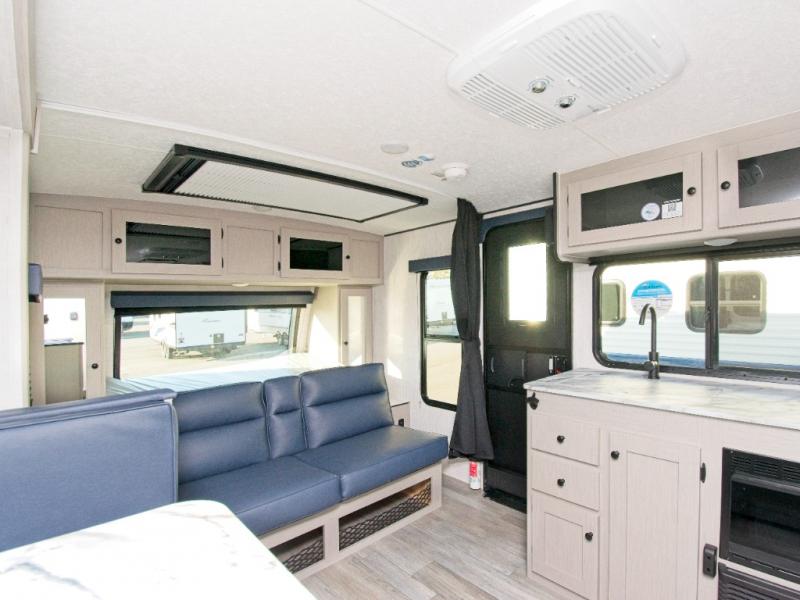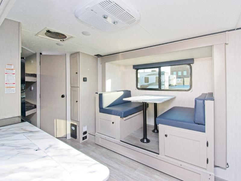 - The booth dinette slide-out creates additional room to dine, relax, or sleep.