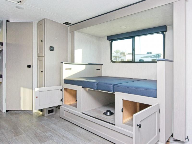 - Rear double-over-double bunks provide room for two more campers, with a flip-up lower bunk for extra gear or sleeping space.