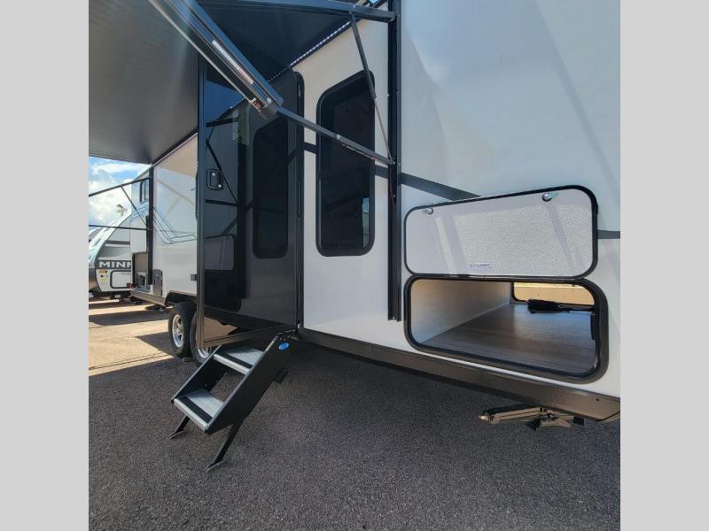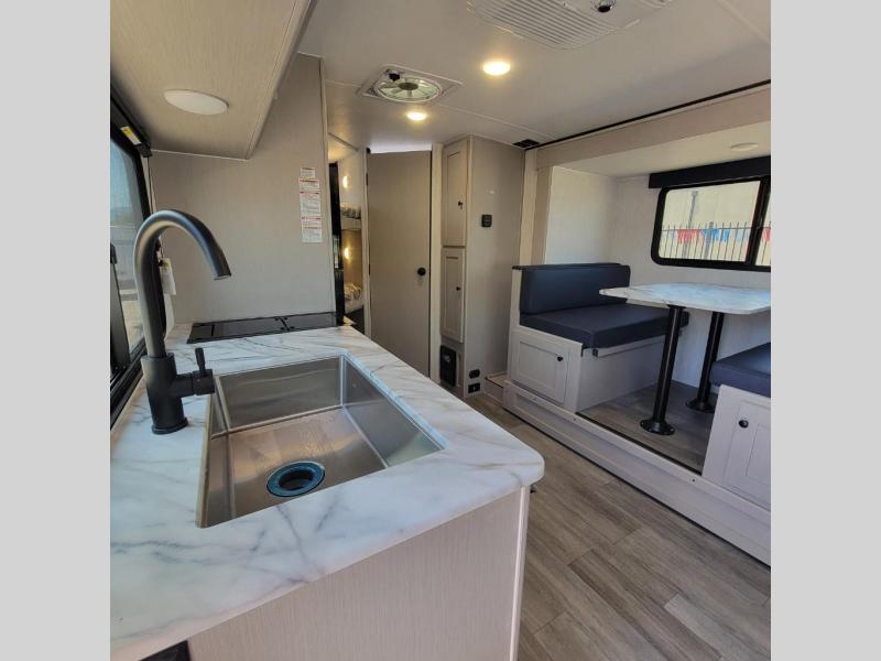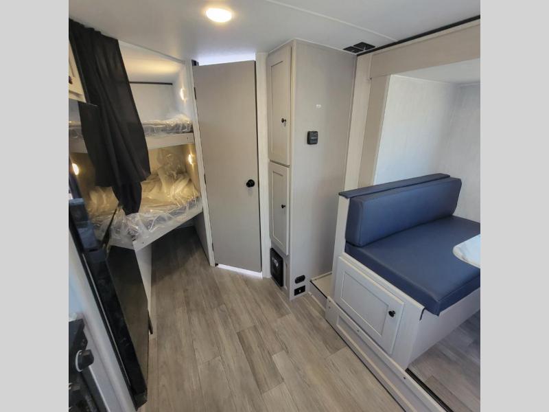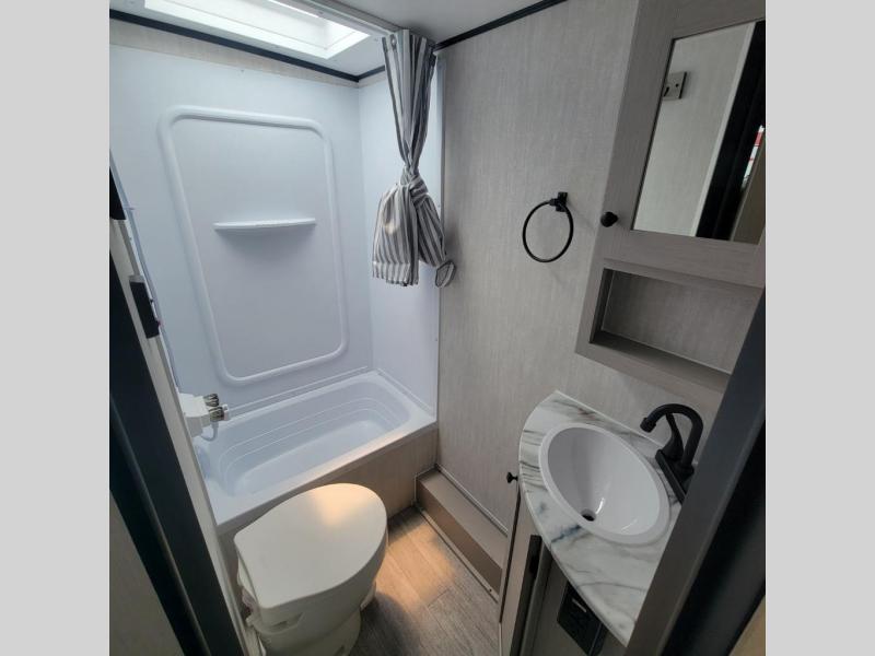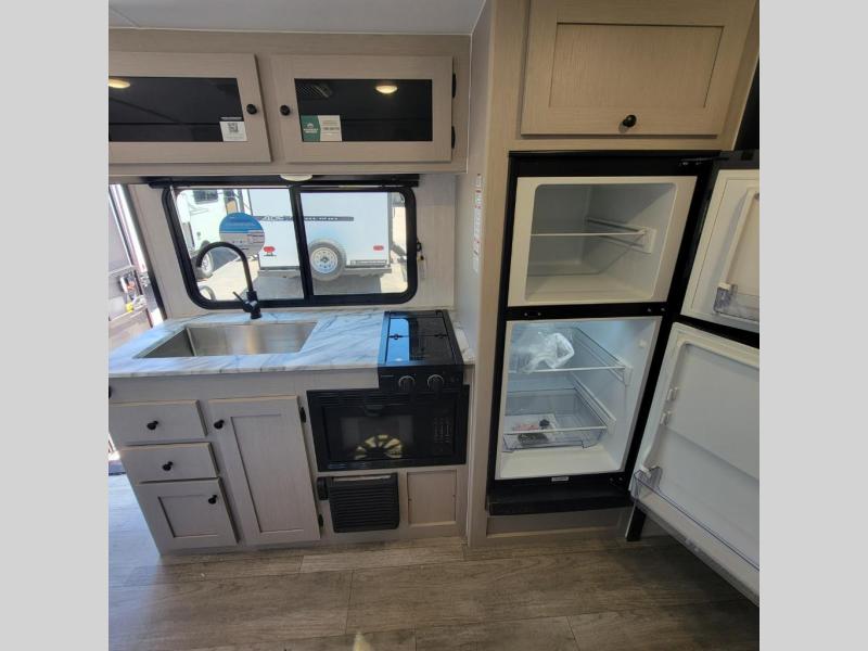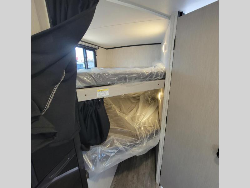 You and a few friends or family members can camp comfortably in this travel trailer! It features a front queen bed with wardrobes on either side to keep your clothes out of the way or you can switch it out for the optional Murphy bed for more versatility. Two others can sleep on the rear corner upper double bed and lower flip up double bed. After you have fried up some eggs on the two burner cooktop and heated up a piece of banana bread in the microwave, you can head to the booth dinette slide to enjoy it. There is even a pantry to store your coffee grounds and snacks. Now that your bellies are full, you can freshen up in the rear corner bathroom with the tub/shower.