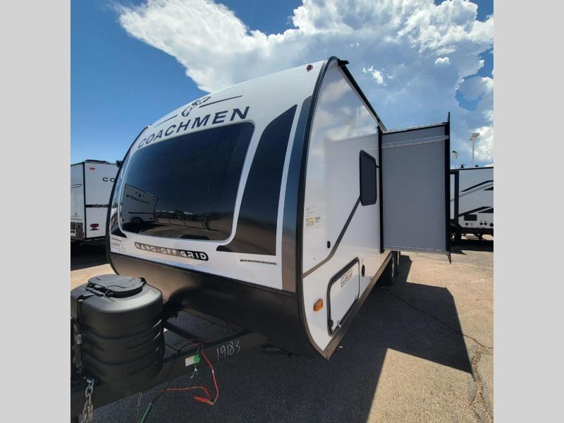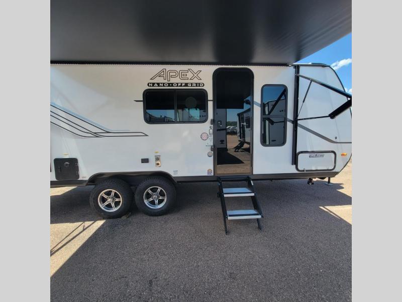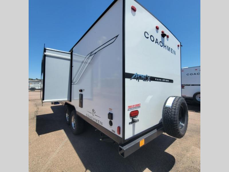 You will find comfort, convenience, and a sturdy construction with each of these Coachmen RV Apex Nano travel trailers! They are held together with an aluma-cage construction, an I-beam chassis, plus vacuum-bonded laminated dual Azdel fiberglass walls for double the protection against the elements. The 200-watt solar panel with a 30 amp control charger is included within the Off-Grid Package, along with two 20 lb. LP tanks, a high velocity power roof vent, plus 12V outlets to keep you powered up. More exterior feature include a hot/cold shower, four stabilizer jacks, a power awning with LED lighting, and magnetic baggage door catches to easily pack and unload your gear. You will love the interior of your Apex Nano with Congoleum residential flooring, one-piece seamless edge countertops, matte black hardware in the galley, and a hand-crafted wood medicine cabinet in the bath.
