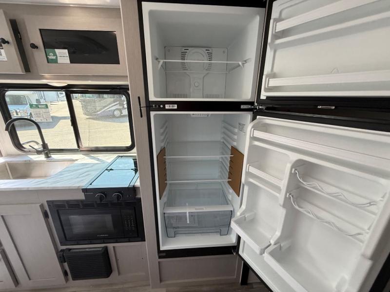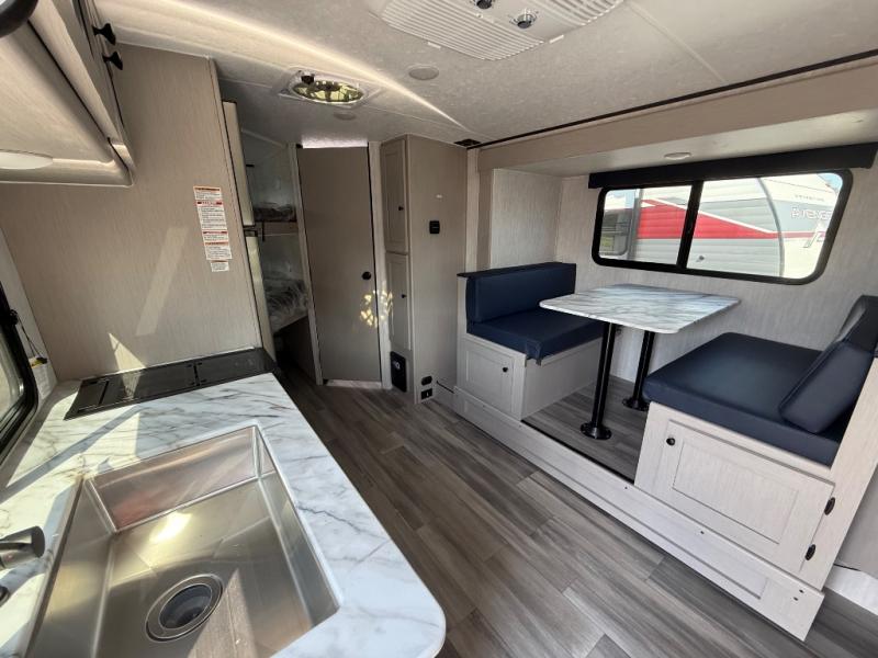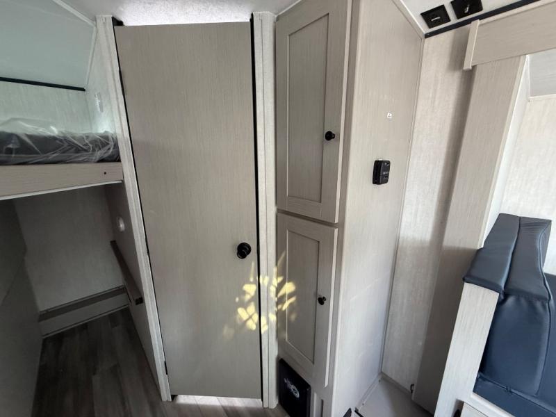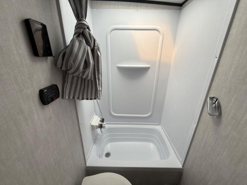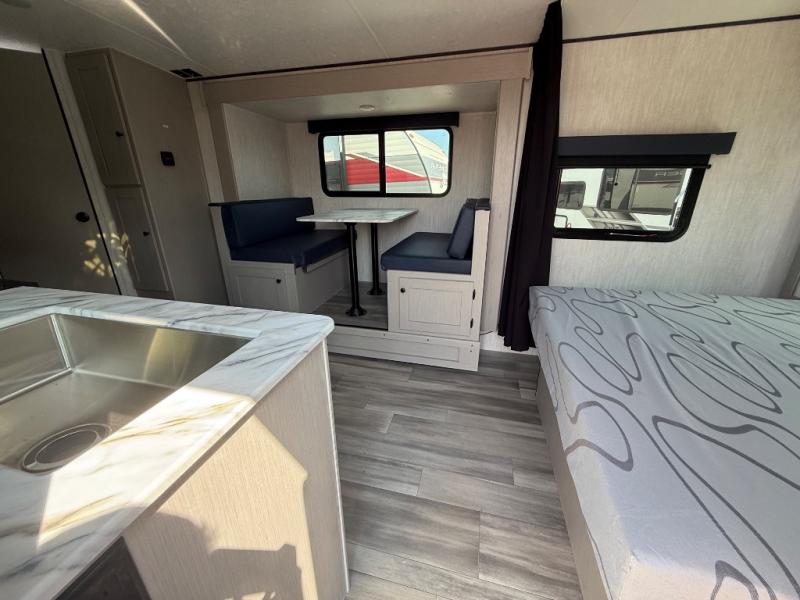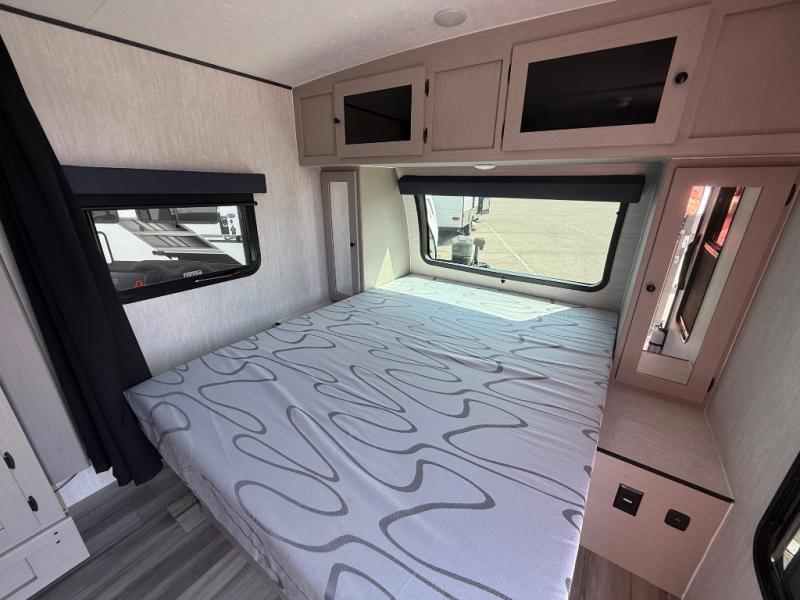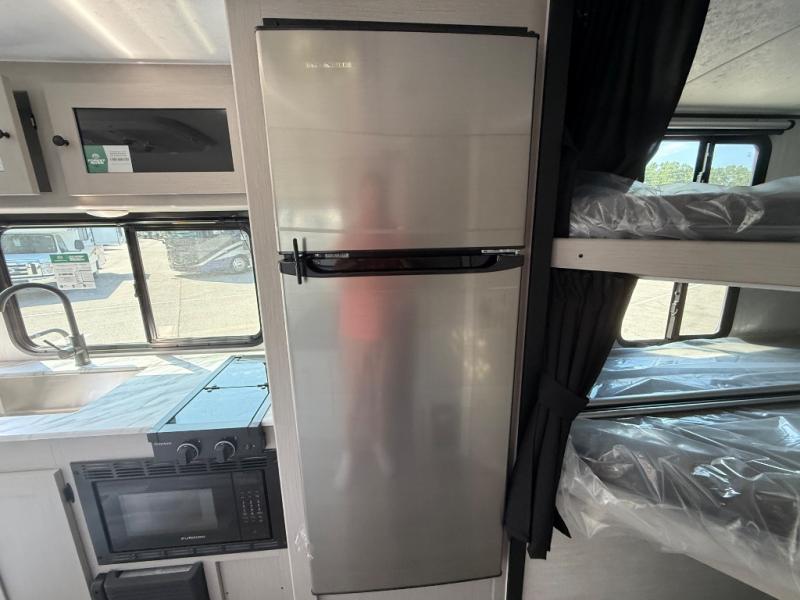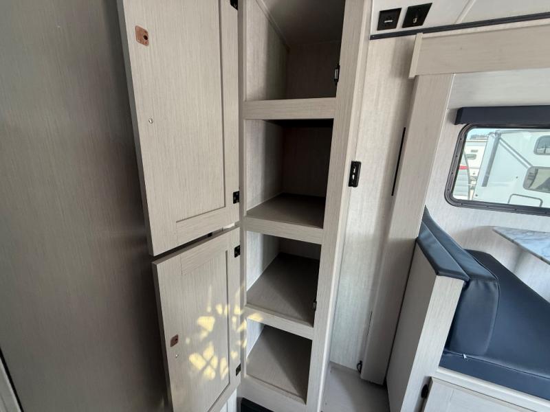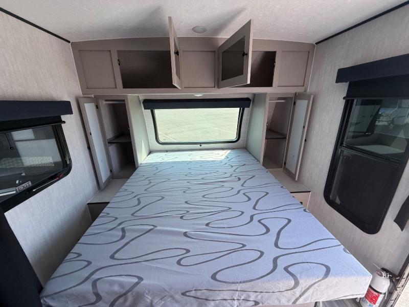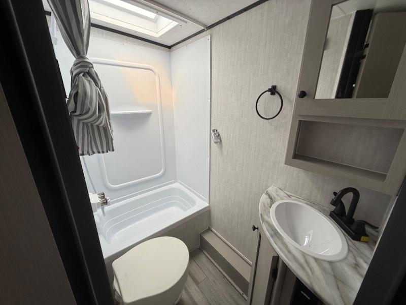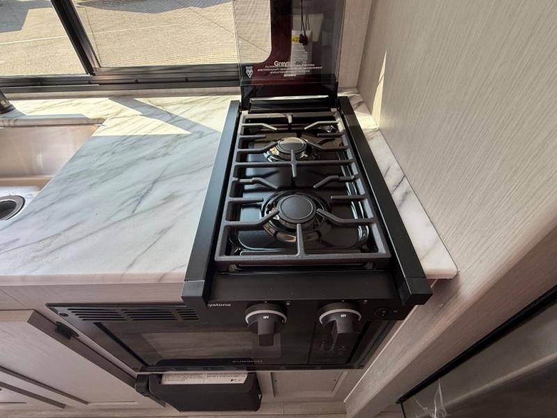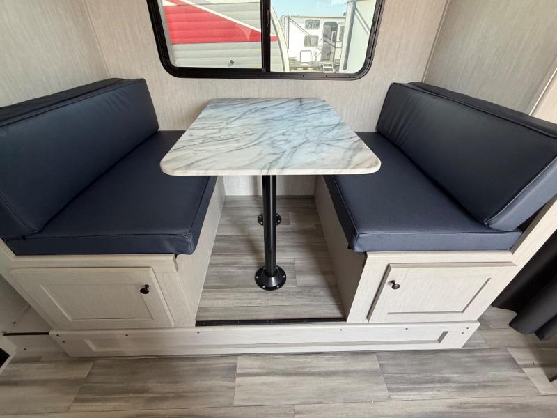 You and a few friends or family members can camp comfortably in this travel trailer! It features a front queen bed with wardrobes on either side to keep your clothes out of the way or you can switch it out for the optional Murphy bed for more versatility. Two others can sleep on the rear corner upper double bed and lower flip up double bed. After you have fried up some eggs on the two burner cooktop and heated up a piece of banana bread in the microwave, you can head to the booth dinette slide to enjoy it. There is even a pantry to store your coffee grounds and snacks. Now that your bellies are full, you can freshen up in the rear corner bathroom with the tub/shower.