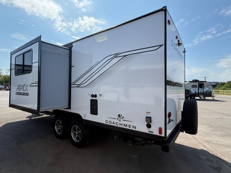 You will find comfort, convenience, and a sturdy construction with each of these Coachmen RV Apex Nano travel trailers! They are held together with an aluma-cage construction, an I-beam chassis, plus vacuum-bonded laminated dual Azdel fiberglass walls for double the protection against the elements. The 200-watt solar panel with a 30 amp control charger is included within the Off-Grid Package, along with two 20 lb. LP tanks, a high velocity power roof vent, plus 12V outlets to keep you powered up. More exterior feature include a hot/cold shower, four stabilizer jacks, a power awning with LED lighting, and magnetic baggage door catches to easily pack and unload your gear. You will love the interior of your Apex Nano with Congoleum residential flooring, one-piece seamless edge countertops, matte black hardware in the galley, and a hand-crafted wood medicine cabinet in the bath.
