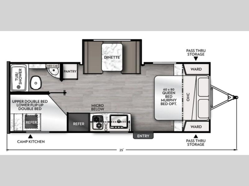 You and a few friends or family members can camp comfortably in this travel trailer! It features a front queen bed with wardrobes on either side to keep your clothes out of the way or you can switch it out for the optional Murphy bed for more versatility. Two others can sleep on the rear corner upper double bed and lower flip up double bed. After you have fried up some eggs on the two burner cooktop and heated up a piece of banana bread in the microwave, you can head to the booth dinette slide to enjoy it. There is even a pantry to store your coffee grounds and snacks. Now that your bellies are full, you can freshen up in the rear corner bathroom with the tub/shower.