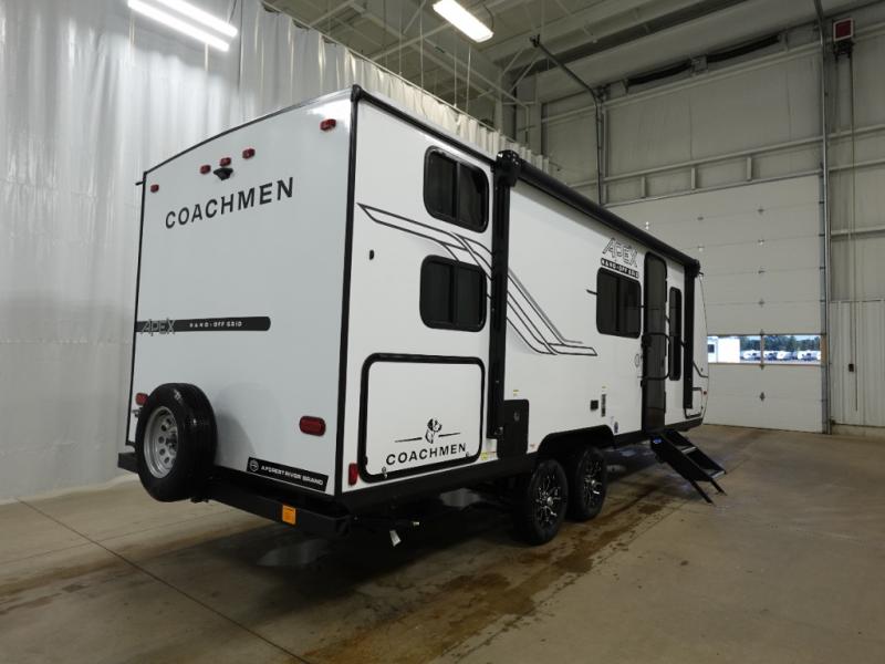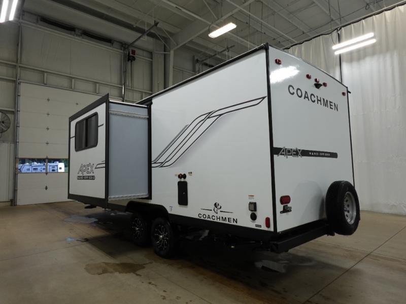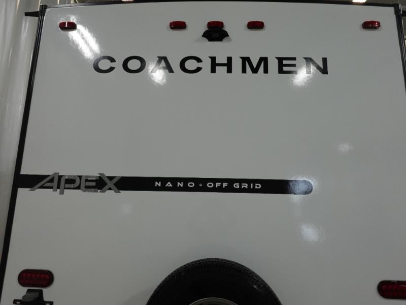 You will find comfort, convenience, and a sturdy construction with each of these Coachmen RV Apex Nano travel trailers! They are held together with an aluma-cage construction, an I-beam chassis, plus vacuum-bonded laminated dual Azdel fiberglass walls for double the protection against the elements. The 200-watt solar panel with a 30 amp control charger is included within the Off-Grid Package, along with two 20 lb. LP tanks, a high velocity power roof vent, plus 12V outlets to keep you powered up. More exterior feature include a hot/cold shower, four stabilizer jacks, a power awning with LED lighting, and magnetic baggage door catches to easily pack and unload your gear. You will love the interior of your Apex Nano with Congoleum residential flooring, one-piece seamless edge countertops, matte black hardware in the galley, and a hand-crafted wood medicine cabinet in the bath.