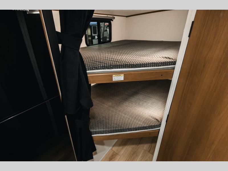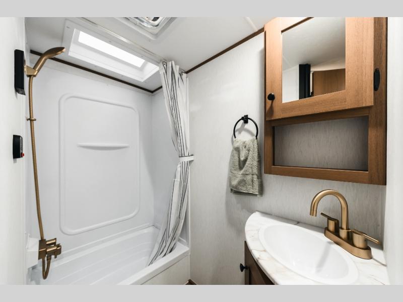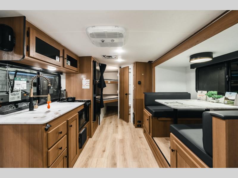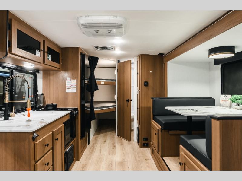 You and a few friends or family members can camp comfortably in this travel trailer! It features a front queen bed with wardrobes on either side to keep your clothes out of the way or you can switch it out for the optional Murphy bed for more versatility. Two others can sleep on the rear corner upper double bed and lower flip up double bed. After you have fried up some eggs on the two burner cooktop and heated up a piece of banana bread in the microwave, you can head to the booth dinette slide to enjoy it. There is even a pantry to store your coffee grounds and snacks. Now that your bellies are full, you can freshen up in the rear corner bathroom with the tub/shower.