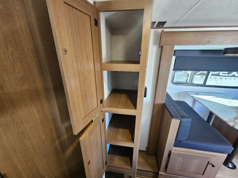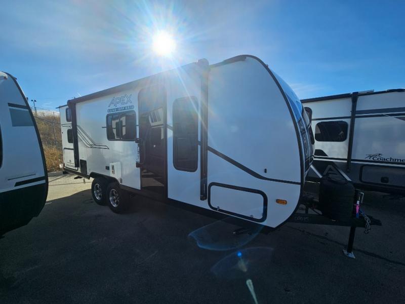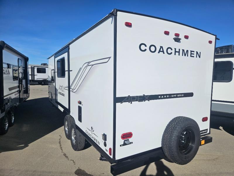 You will find comfort, convenience, and a sturdy construction with each of these Coachmen RV Apex Nano travel trailers! They are held together with an aluma-cage construction, an I-beam chassis, plus vacuum-bonded laminated dual Azdel fiberglass walls for double the protection against the elements. The 400-watt solar panel with a 30 amp control charger is included, along with two 20 lb. LP tanks, a high velocity power roof vent, plus 12V outlets to keep you powered up. More exterior features include a hot/cold shower, four stabilizer jacks, a power awning with LED lighting, and radius thumb latch baggage doors to easily pack and unload your gear. You will love the interior of your Apex Nano with Congoleum residential flooring, one-piece seamless edge countertops, matte black hardware in the galley, and a hand-crafted wood medicine cabinet in the bath.