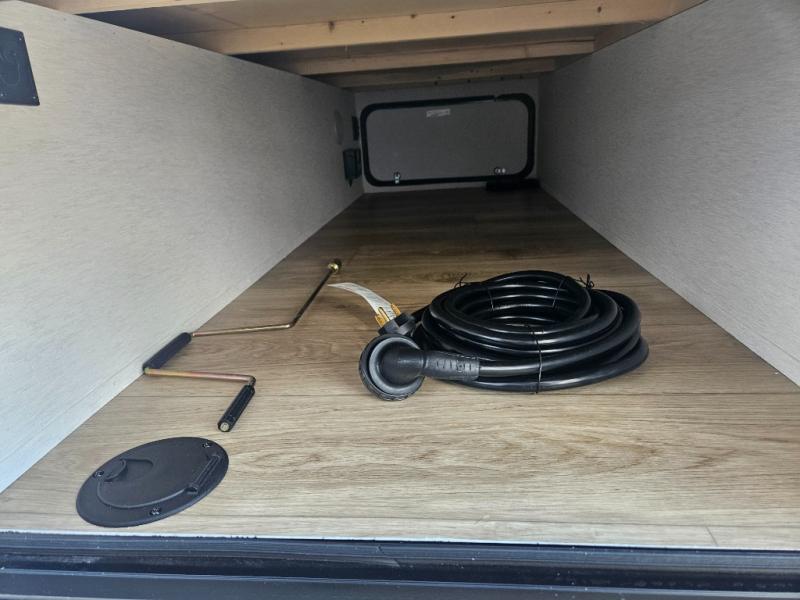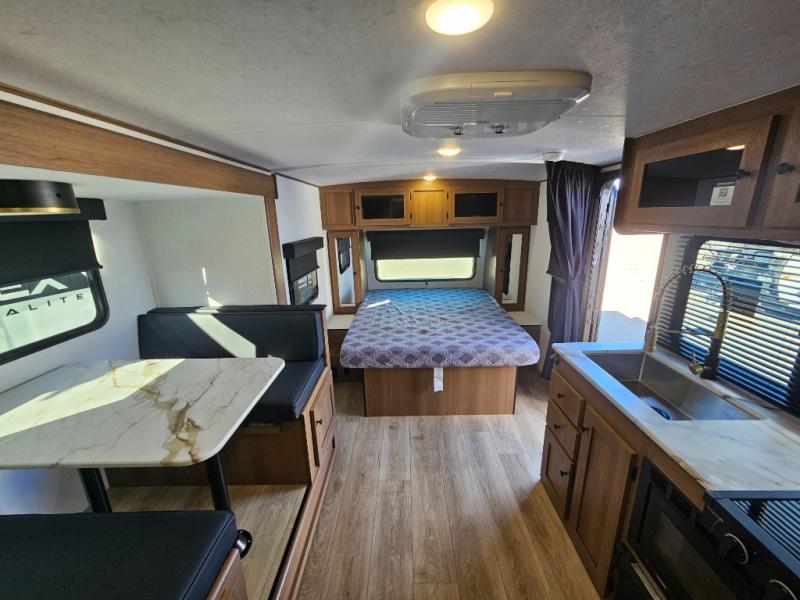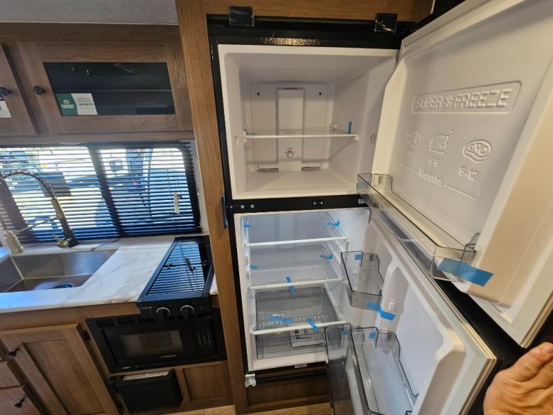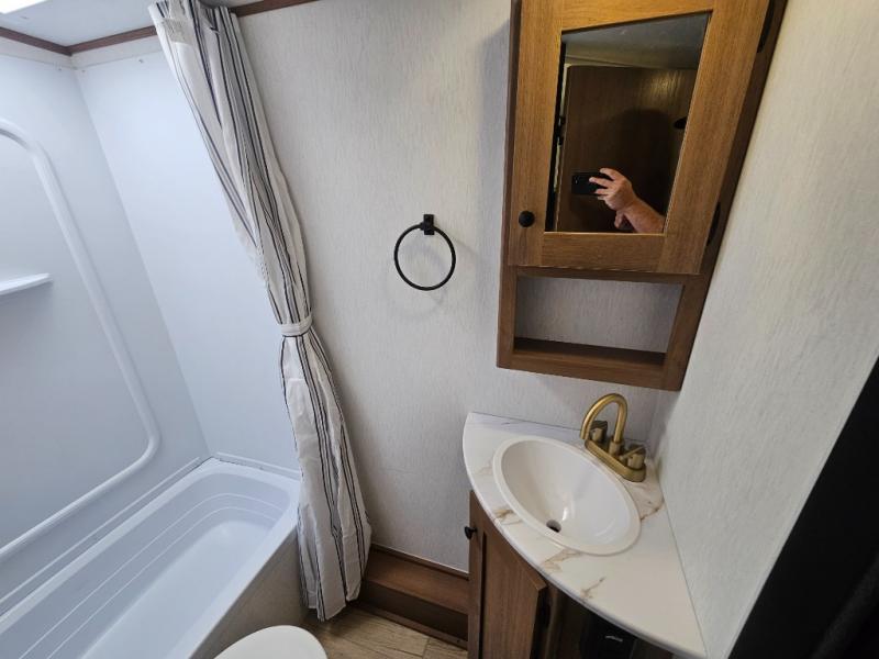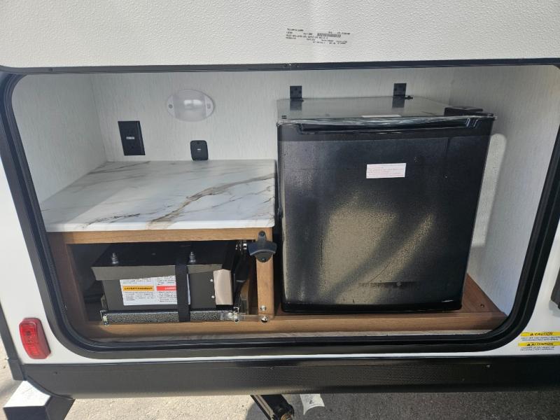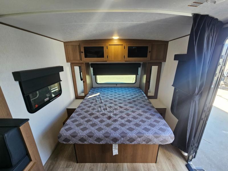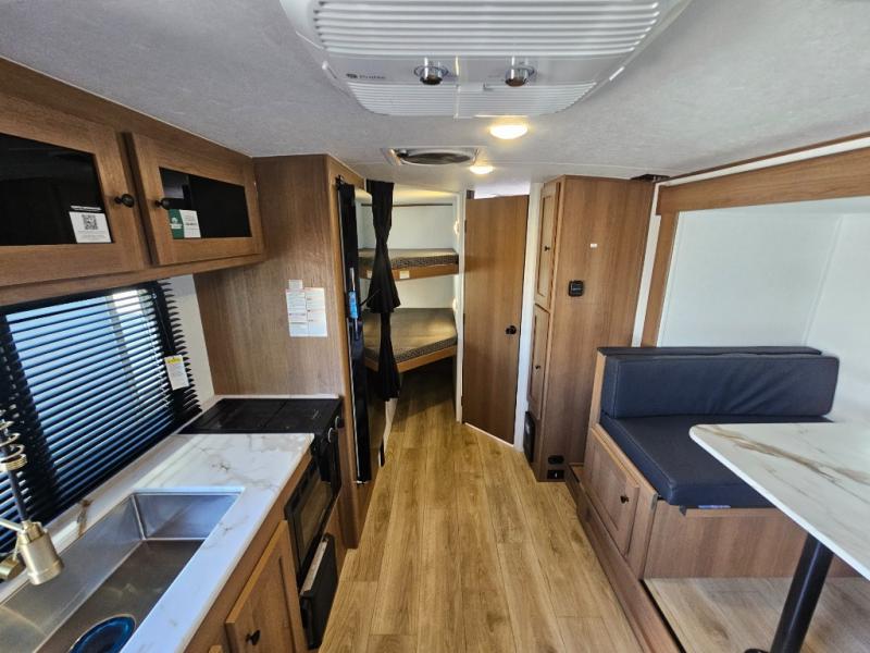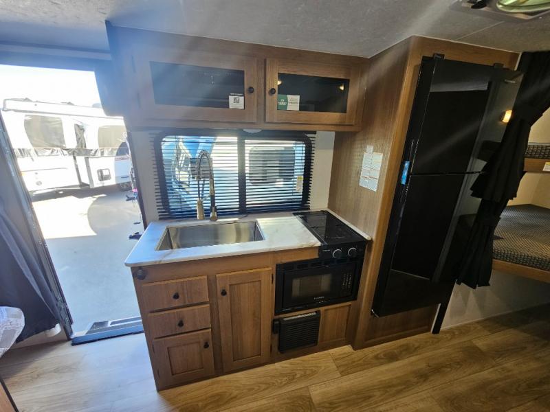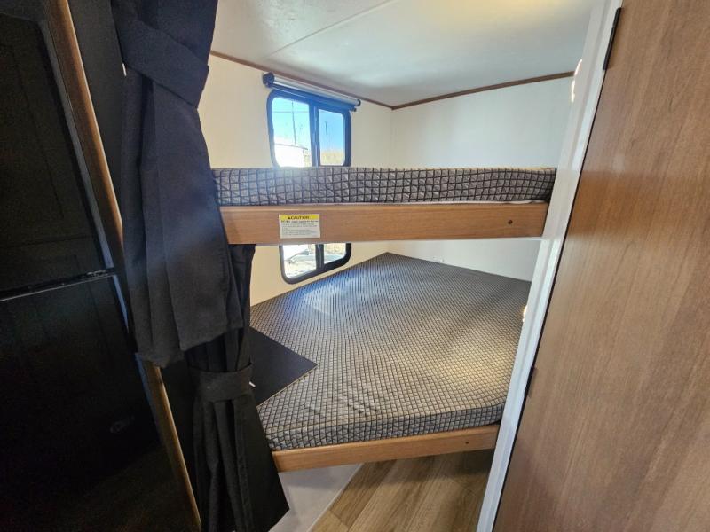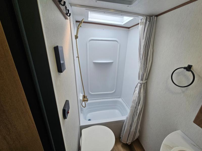 You and a few friends or family members can camp comfortably in this travel trailer! It features a front queen bed with wardrobes on either side to keep your clothes out of the way or you can switch it out for the optional Murphy bed for more versatility. Two others can sleep on the rear corner upper double bed and lower flip up double bed. After you have fried up some eggs on the two burner cooktop and heated up a piece of banana bread in the microwave, you can head to the booth dinette slide to enjoy it. There is even a pantry to store your coffee grounds and snacks. Now that your bellies are full, you can freshen up in the rear corner bathroom with the tub/shower.