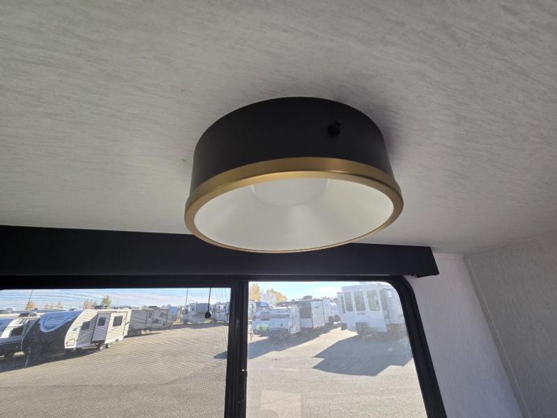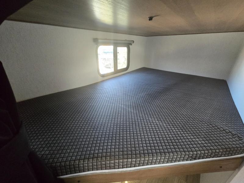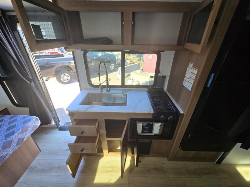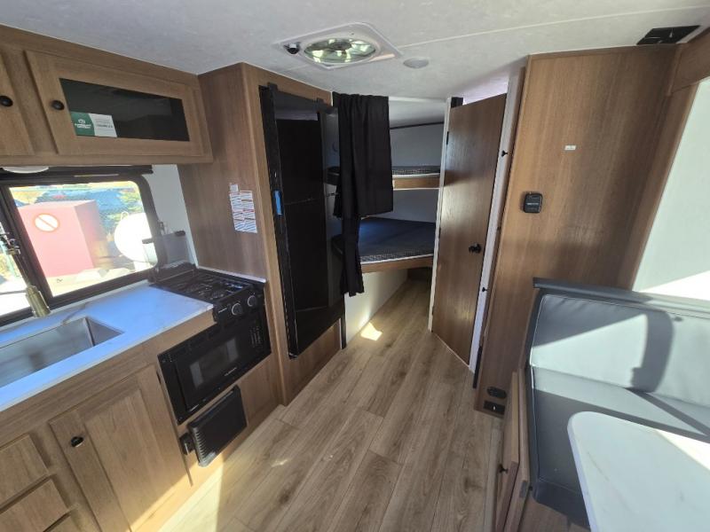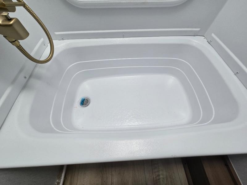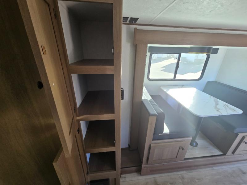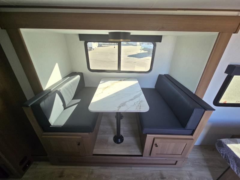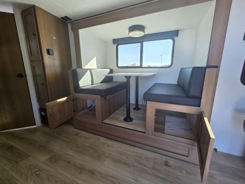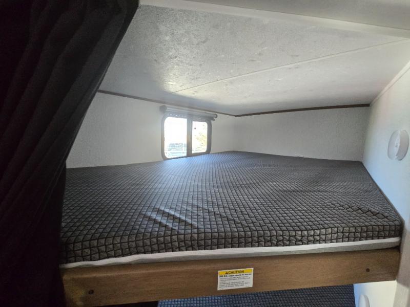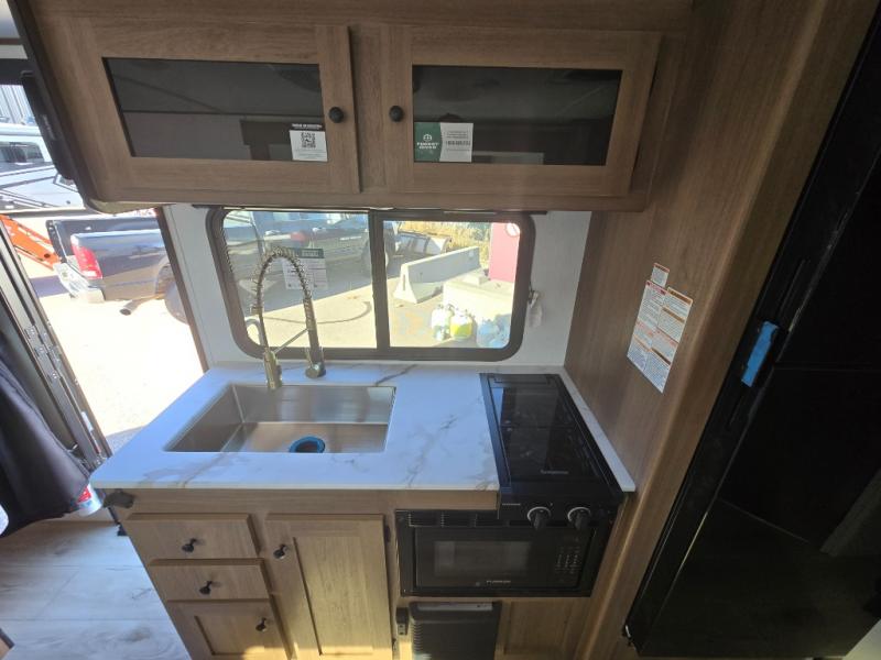 You and a few friends or family members can camp comfortably in this travel trailer! It features a front queen bed with wardrobes on either side to keep your clothes out of the way or you can switch it out for the optional Murphy bed for more versatility. Two others can sleep on the rear corner upper double bed and lower flip up double bed. After you have fried up some eggs on the two burner cooktop and heated up a piece of banana bread in the microwave, you can head to the booth dinette slide to enjoy it. There is even a pantry to store your coffee grounds and snacks. Now that your bellies are full, you can freshen up in the rear corner bathroom with the tub/shower.