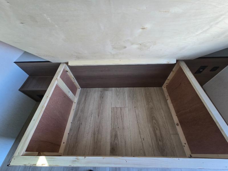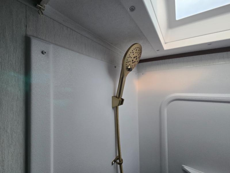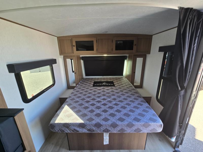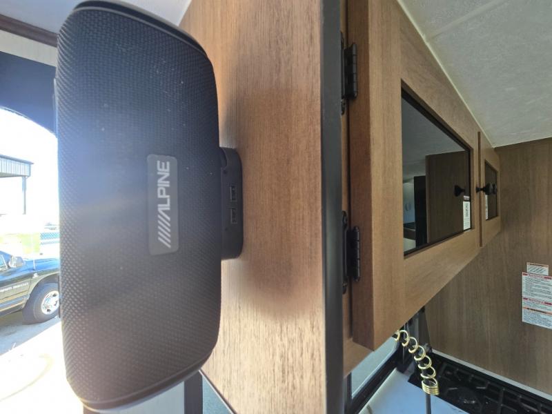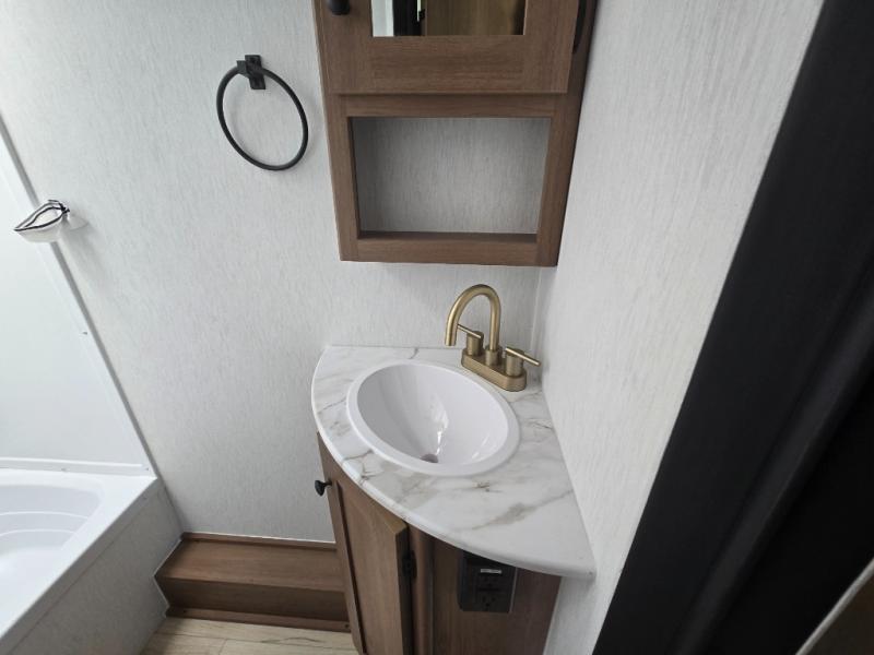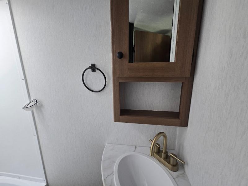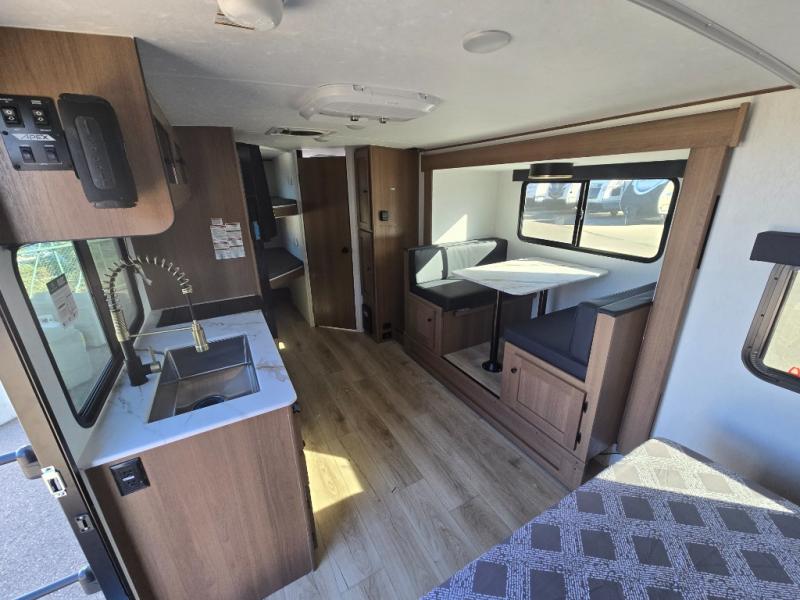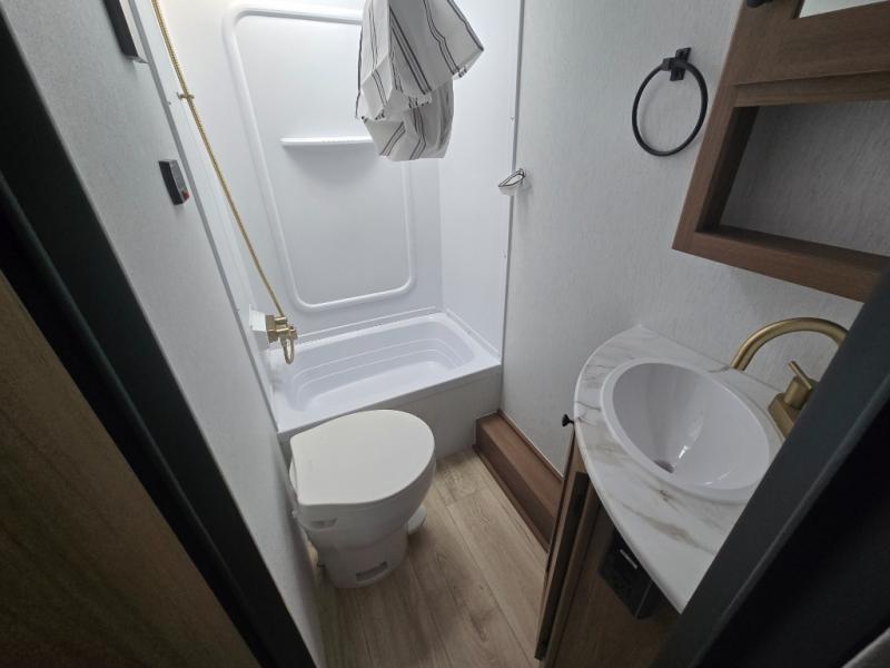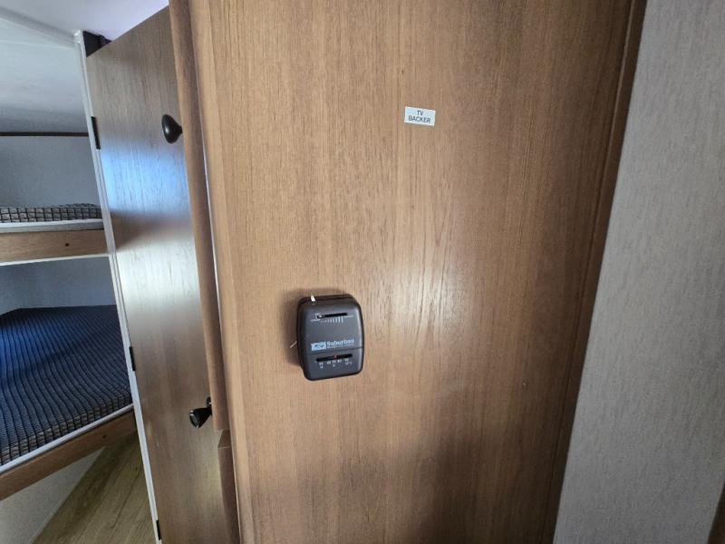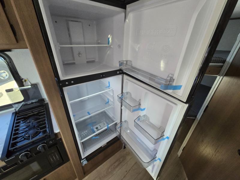 You and a few friends or family members can camp comfortably in this travel trailer! It features a front queen bed with wardrobes on either side to keep your clothes out of the way or you can switch it out for the optional Murphy bed for more versatility. Two others can sleep on the rear corner upper double bed and lower flip up double bed. After you have fried up some eggs on the two burner cooktop and heated up a piece of banana bread in the microwave, you can head to the booth dinette slide to enjoy it. There is even a pantry to store your coffee grounds and snacks. Now that your bellies are full, you can freshen up in the rear corner bathroom with the tub/shower.