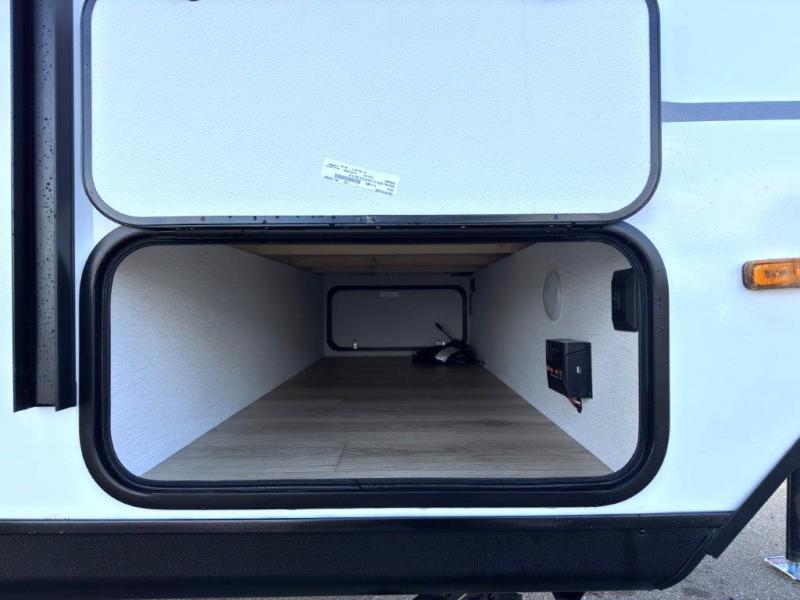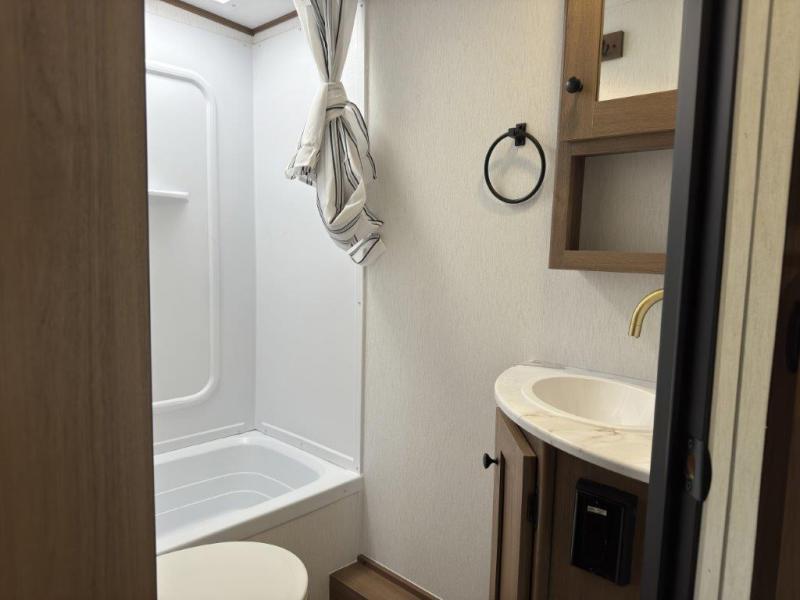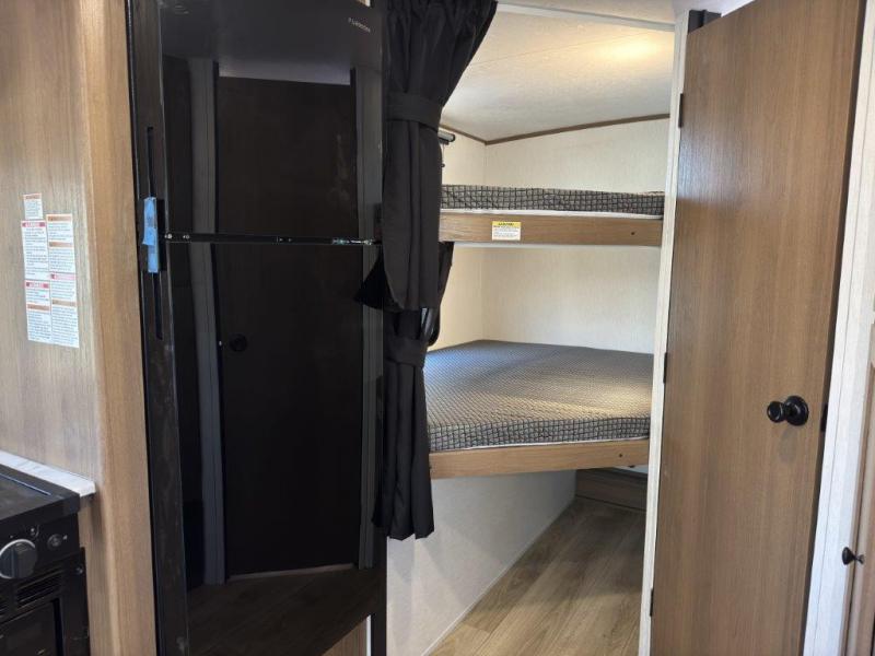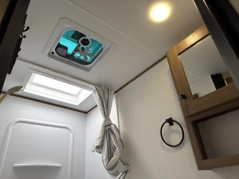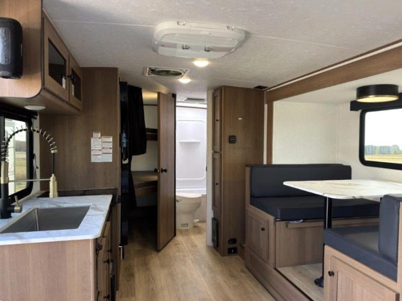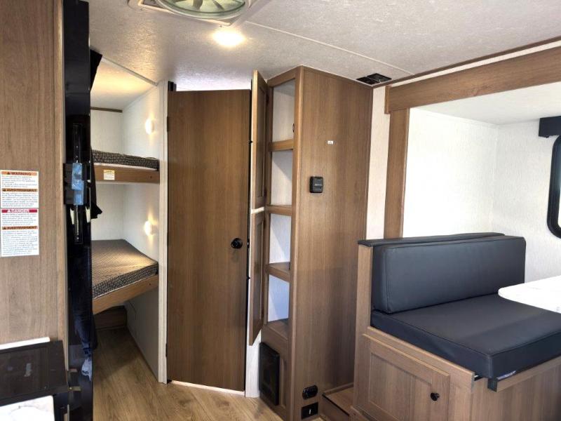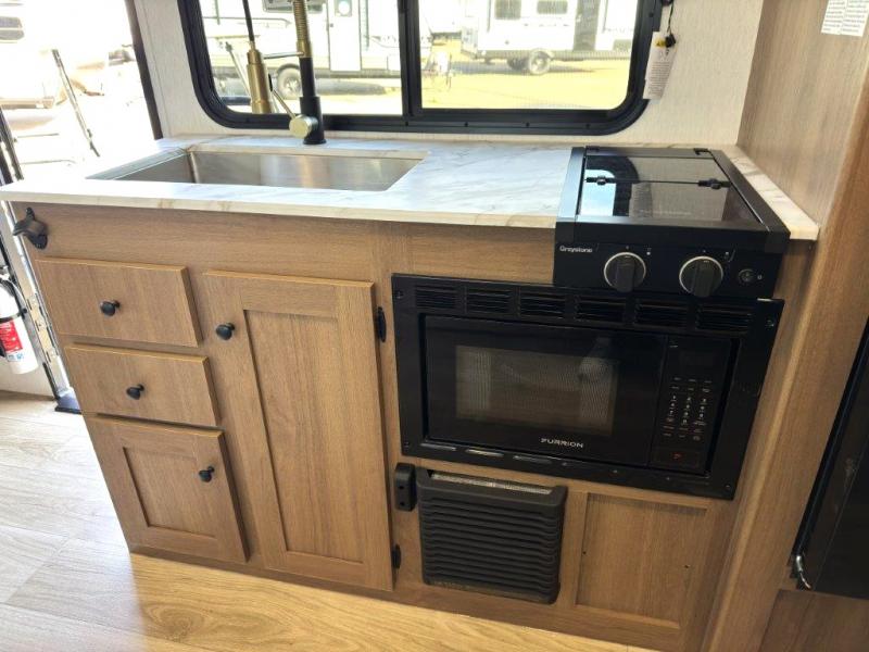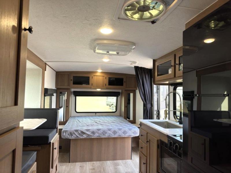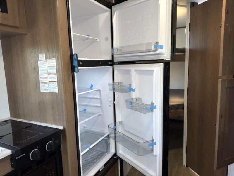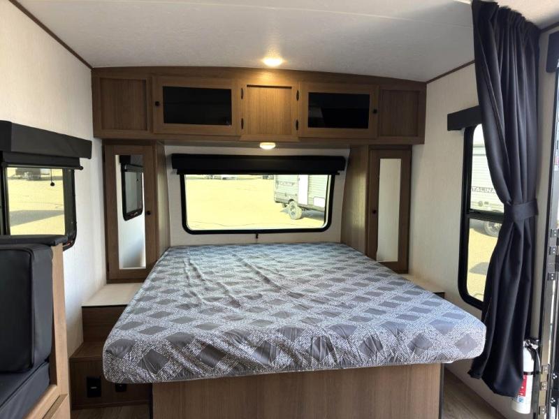 You and a few friends or family members can camp comfortably in this travel trailer! It features a front queen bed with wardrobes on either side to keep your clothes out of the way or you can switch it out for the optional Murphy bed for more versatility. Two others can sleep on the rear corner upper double bed and lower flip up double bed. After you have fried up some eggs on the two burner cooktop and heated up a piece of banana bread in the microwave, you can head to the booth dinette slide to enjoy it. There is even a pantry to store your coffee grounds and snacks. Now that your bellies are full, you can freshen up in the rear corner bathroom with the tub/shower.