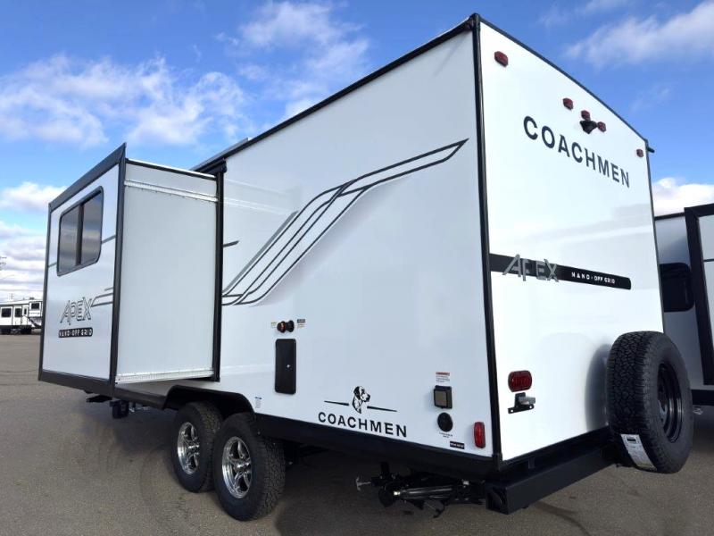 You will find comfort, convenience, and a sturdy construction with each of these Coachmen RV Apex Nano travel trailers! They are held together with an aluma-cage construction, an I-beam chassis, plus vacuum-bonded laminated dual Azdel fiberglass walls for double the protection against the elements. The 200-watt solar panel with a 30 amp control charger is included within the Off-Grid Package, along with two 20 lb. LP tanks, a high velocity power roof vent, plus 12V outlets to keep you powered up. More exterior feature include a hot/cold shower, four stabilizer jacks, a power awning with LED lighting, and magnetic baggage door catches to easily pack and unload your gear. You will love the interior of your Apex Nano with Congoleum residential flooring, one-piece seamless edge countertops, matte black hardware in the galley, and a hand-crafted wood medicine cabinet in the bath.