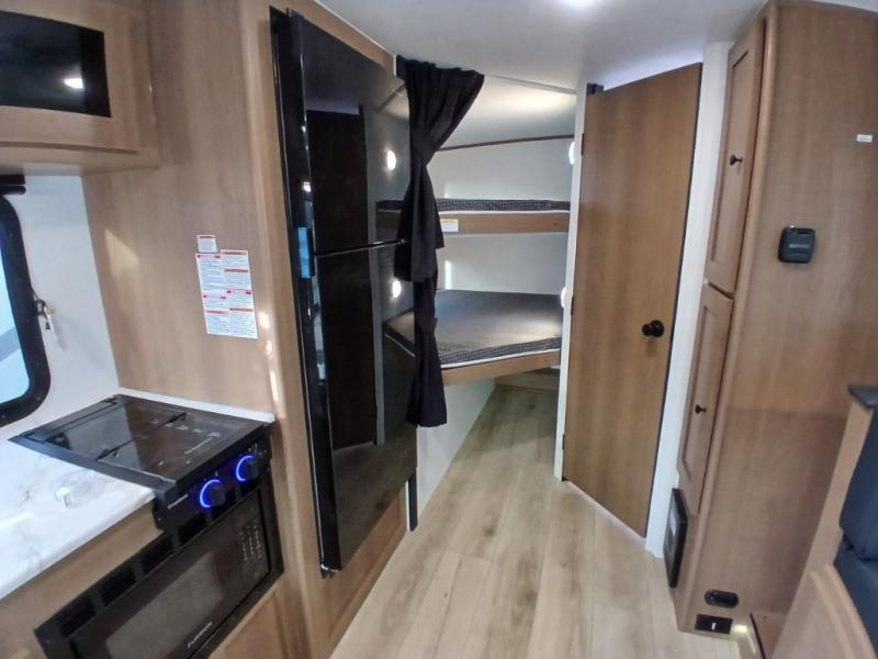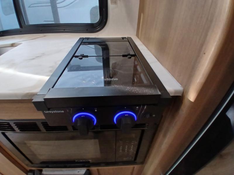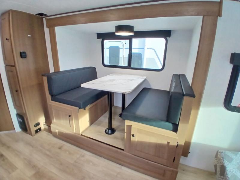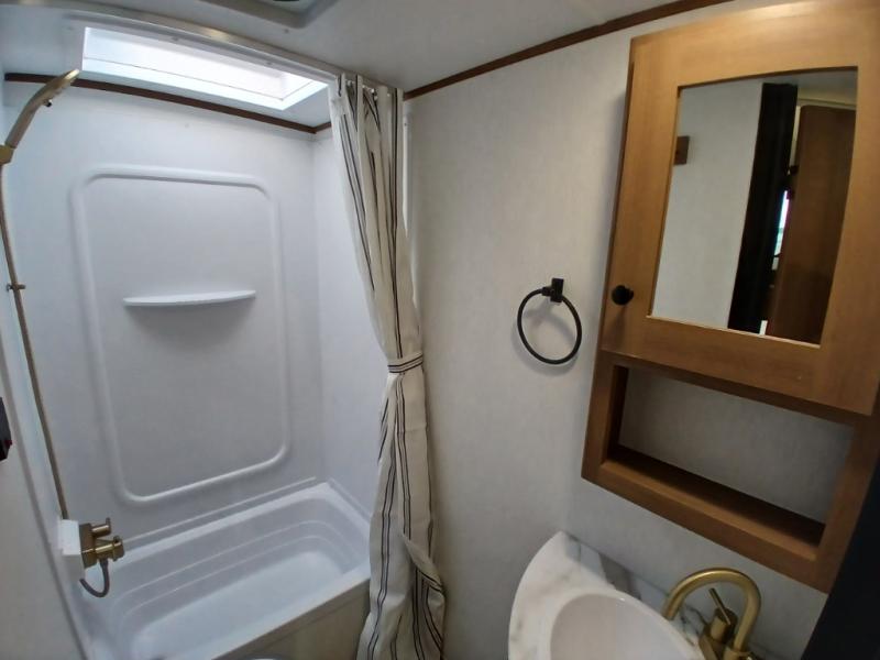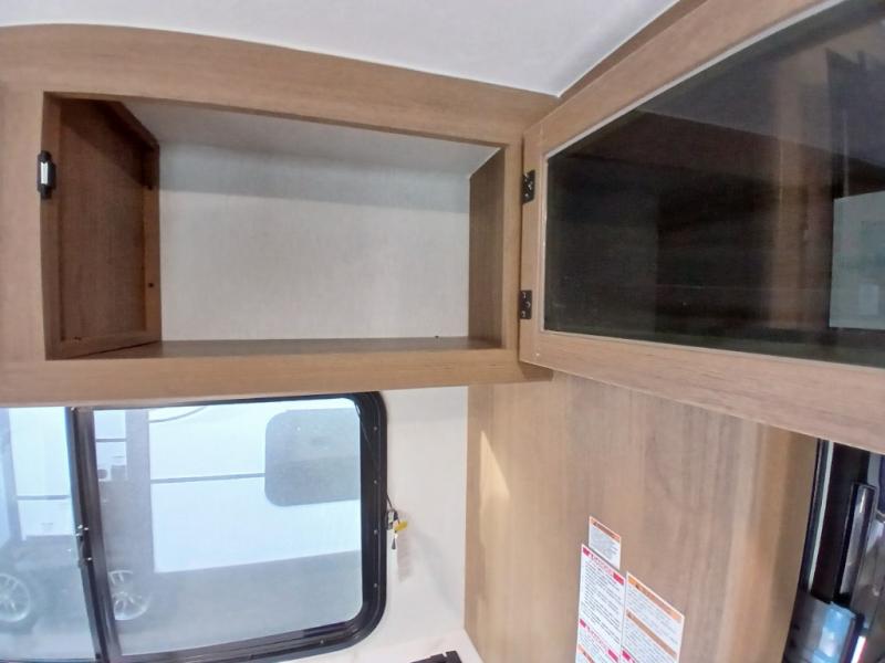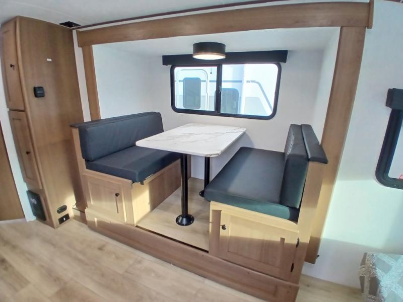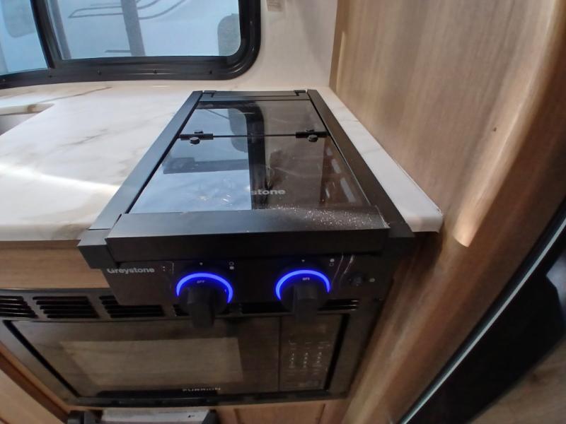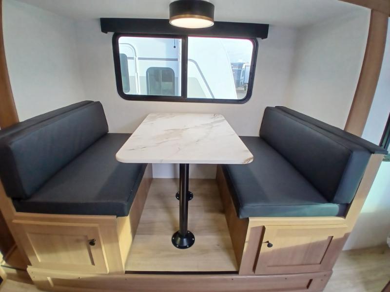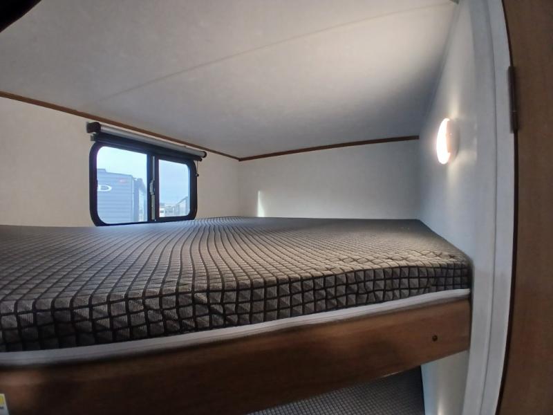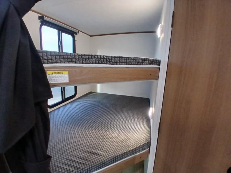You and a few friends or family members can camp comfortably in this travel trailer! It features a front queen bed with wardrobes on either side to keep your clothes out of the way or you can switch it out for the optional Murphy bed for more versatility. Two others can sleep on the rear corner upper double bed and lower flip up double bed. After you have fried up some eggs on the two burner cooktop and heated up a piece of banana bread in the microwave, you can head to the booth dinette slide to enjoy it. There is even a pantry to store your coffee grounds and snacks. Now that your bellies are full, you can freshen up in the rear corner bathroom with the tub/shower.