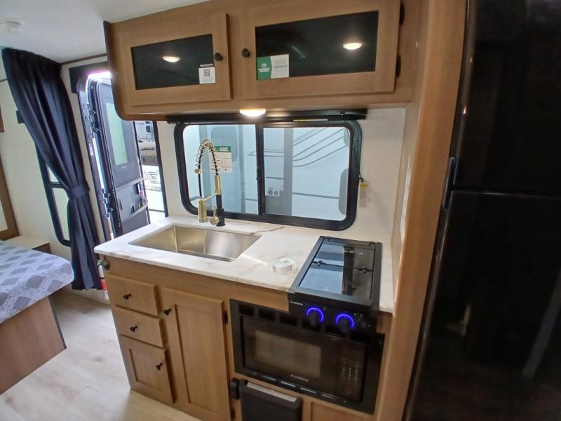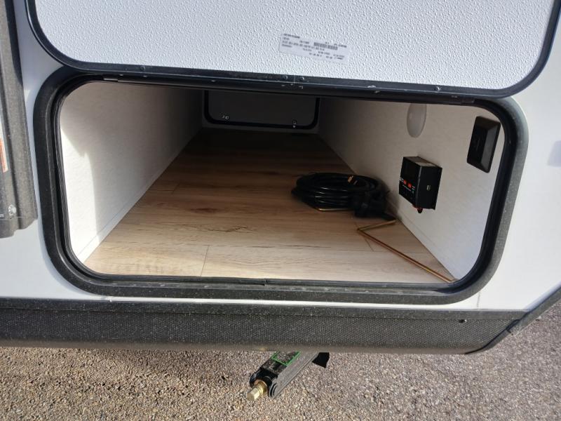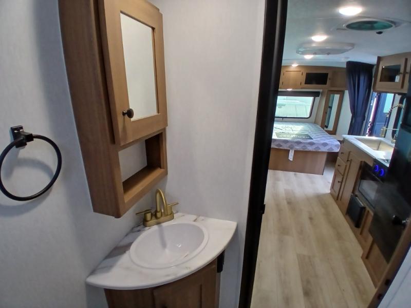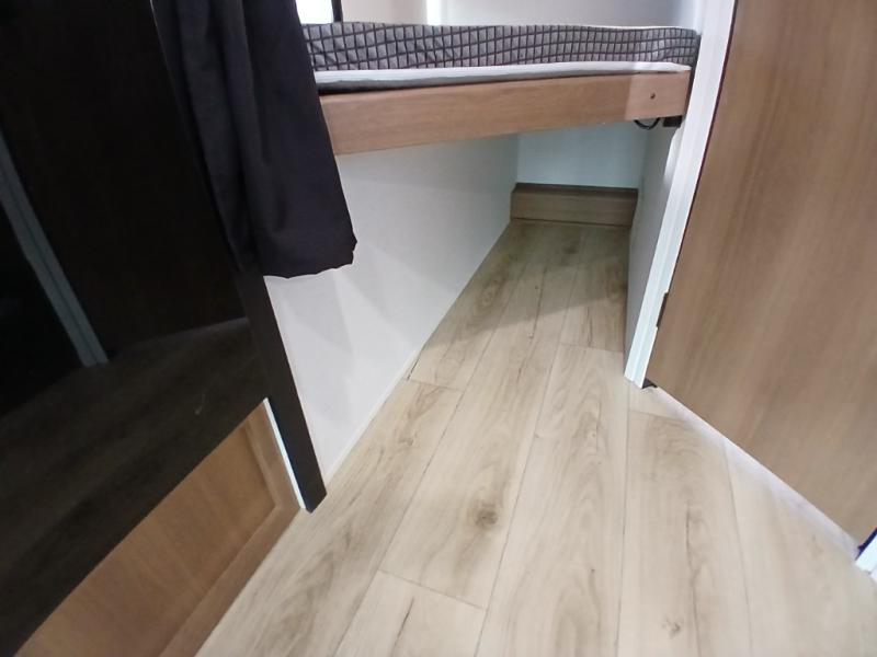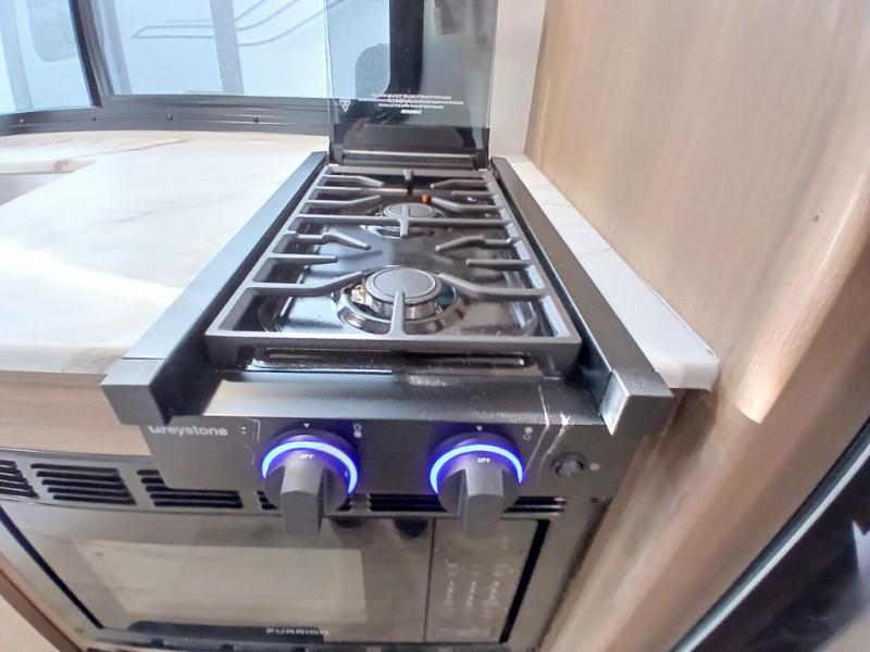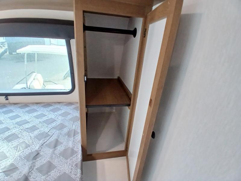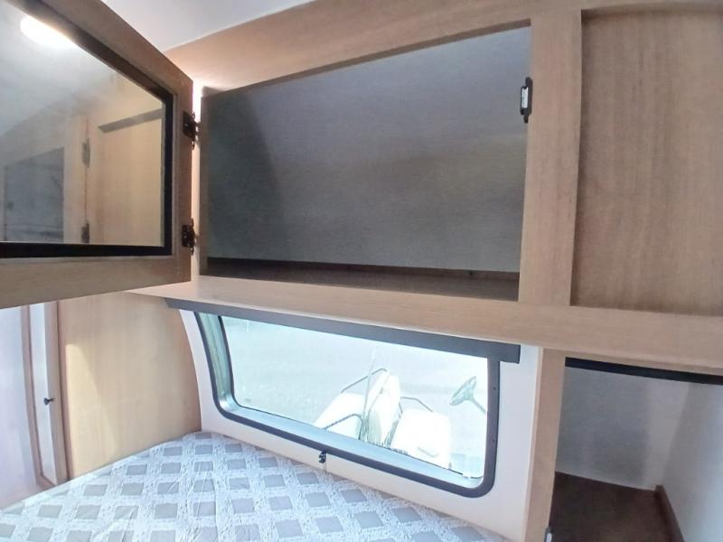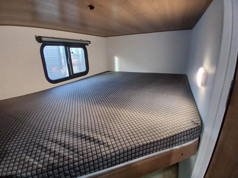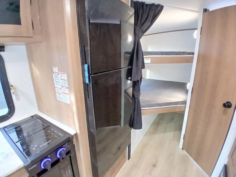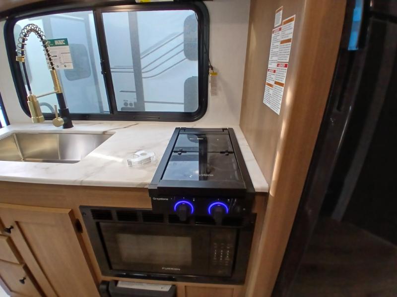 You and a few friends or family members can camp comfortably in this travel trailer! It features a front queen bed with wardrobes on either side to keep your clothes out of the way or you can switch it out for the optional Murphy bed for more versatility. Two others can sleep on the rear corner upper double bed and lower flip up double bed. After you have fried up some eggs on the two burner cooktop and heated up a piece of banana bread in the microwave, you can head to the booth dinette slide to enjoy it. There is even a pantry to store your coffee grounds and snacks. Now that your bellies are full, you can freshen up in the rear corner bathroom with the tub/shower.
