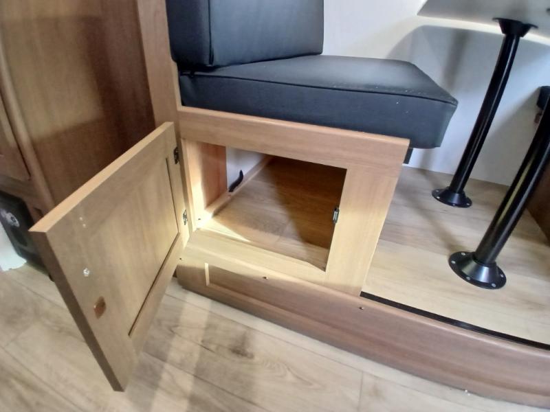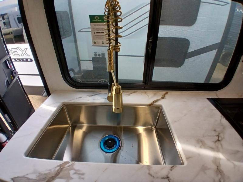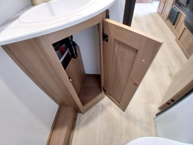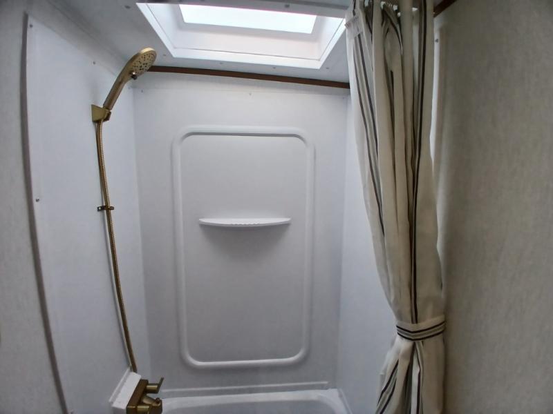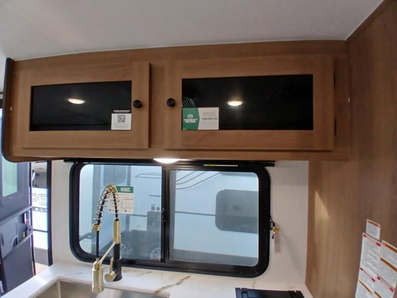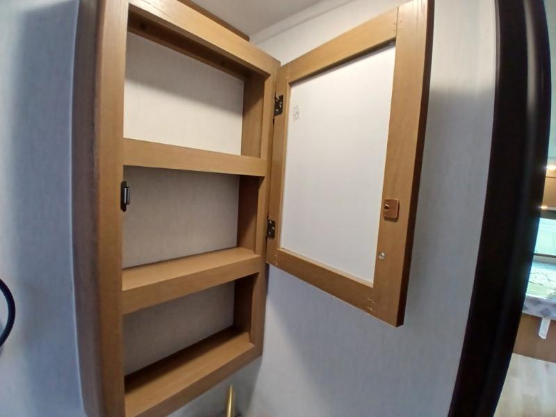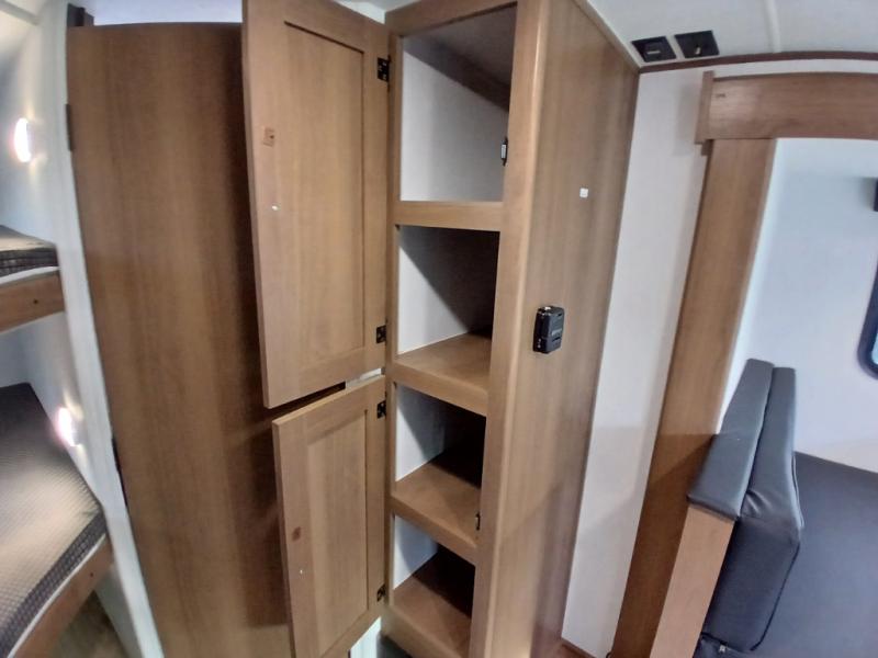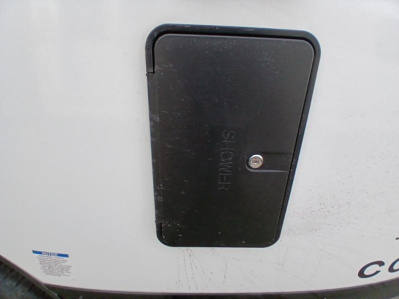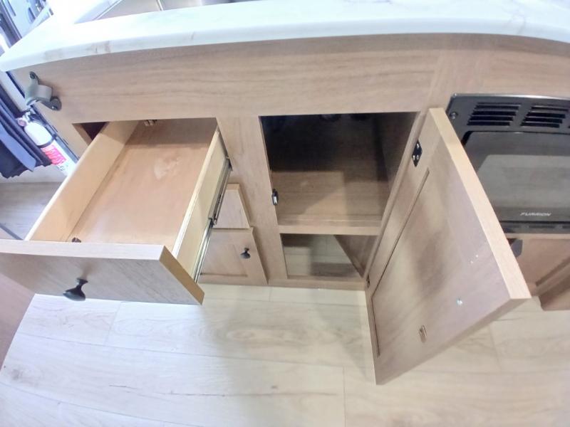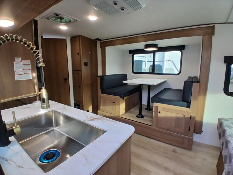 You and a few friends or family members can camp comfortably in this travel trailer! It features a front queen bed with wardrobes on either side to keep your clothes out of the way or you can switch it out for the optional Murphy bed for more versatility. Two others can sleep on the rear corner upper double bed and lower flip up double bed. After you have fried up some eggs on the two burner cooktop and heated up a piece of banana bread in the microwave, you can head to the booth dinette slide to enjoy it. There is even a pantry to store your coffee grounds and snacks. Now that your bellies are full, you can freshen up in the rear corner bathroom with the tub/shower.