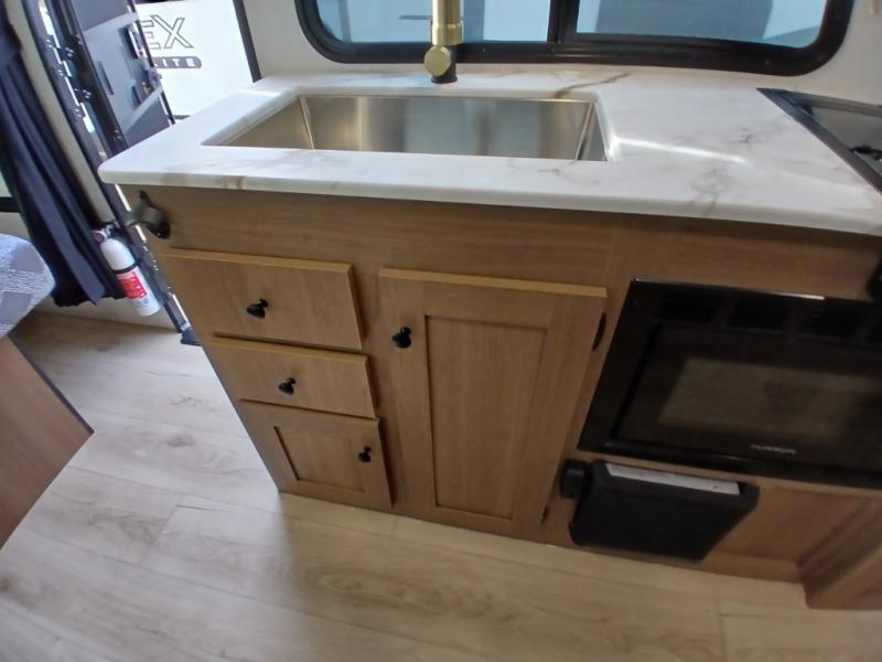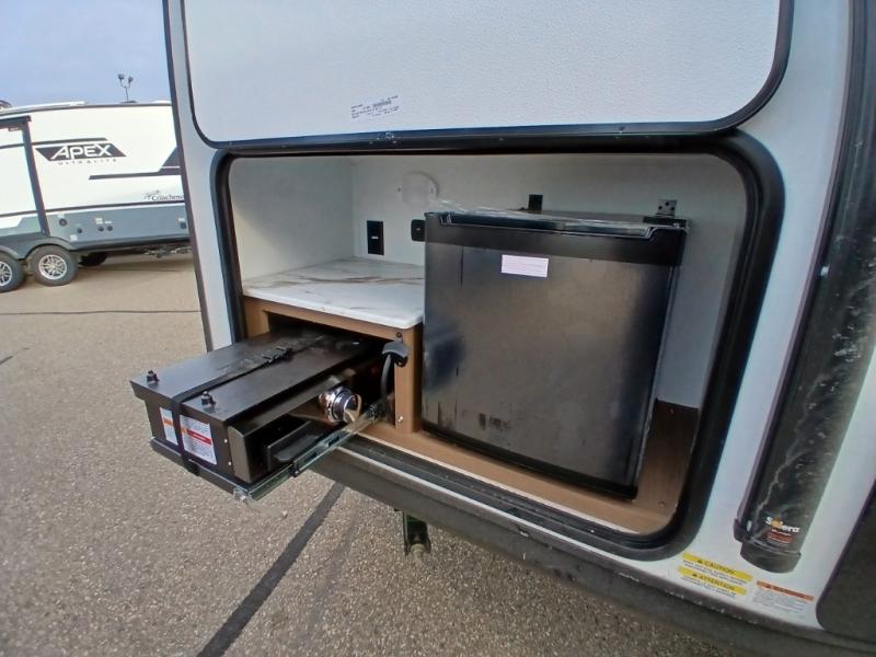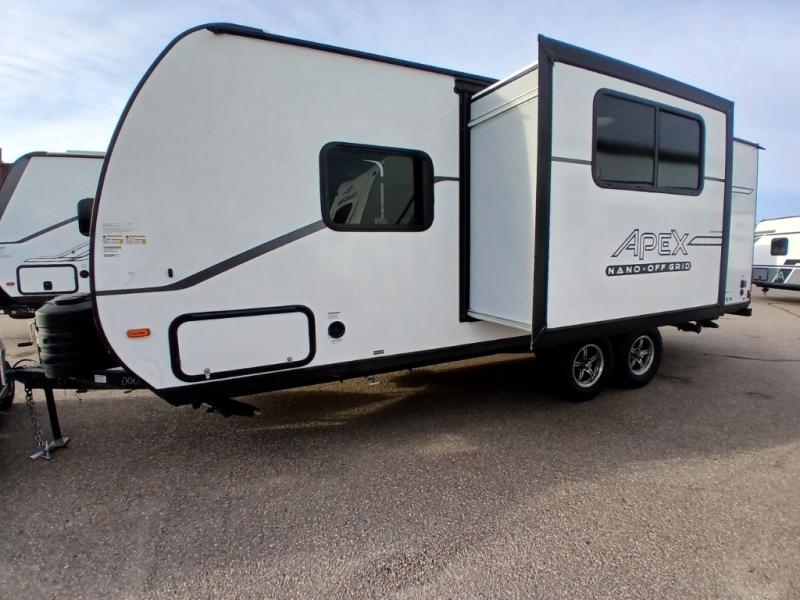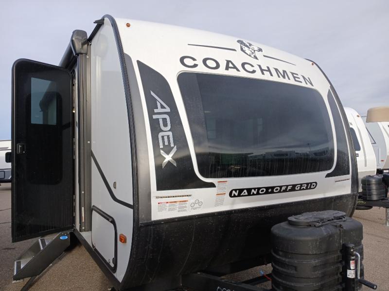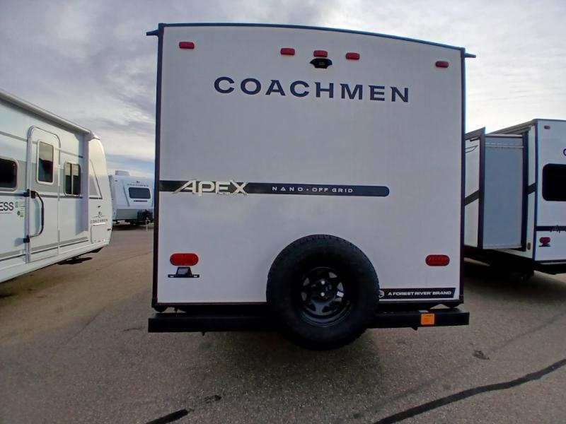 You will find comfort, convenience, and a sturdy construction with each of these Coachmen RV Apex Nano travel trailers! They are held together with an aluma-cage construction, an I-beam chassis, plus vacuum-bonded laminated dual Azdel fiberglass walls for double the protection against the elements. The 400-watt solar panel with a 30 amp control charger is included, along with two 20 lb. LP tanks, a high velocity power roof vent, plus 12V outlets to keep you powered up. More exterior features include a hot/cold shower, four stabilizer jacks, a power awning with LED lighting, and radius thumb latch baggage doors to easily pack and unload your gear. You will love the interior of your Apex Nano with Congoleum residential flooring, one-piece seamless edge countertops, matte black hardware in the galley, and a hand-crafted wood medicine cabinet in the bath.