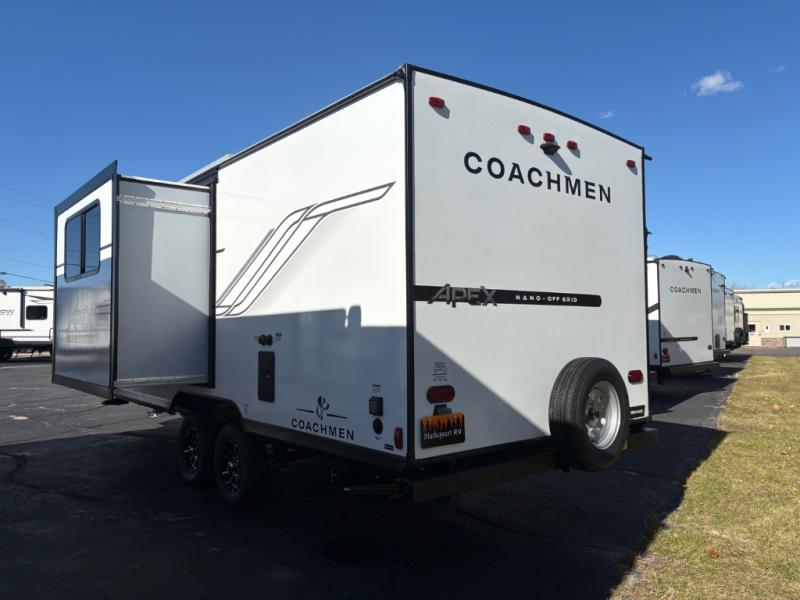 You will find comfort, convenience, and a sturdy construction with each of these Coachmen RV Apex Nano travel trailers! They are held together with an aluma-cage construction, an I-beam chassis, plus vacuum-bonded laminated dual Azdel fiberglass walls for double the protection against the elements. The 400-watt solar panel with a 30 amp control charger is included, along with two 20 lb. LP tanks, a high velocity power roof vent, plus 12V outlets to keep you powered up. More exterior features include a hot/cold shower, four stabilizer jacks, a power awning with LED lighting, and radius thumb latch baggage doors to easily pack and unload your gear. You will love the interior of your Apex Nano with Congoleum residential flooring, one-piece seamless edge countertops, matte black hardware in the galley, and a hand-crafted wood medicine cabinet in the bath.