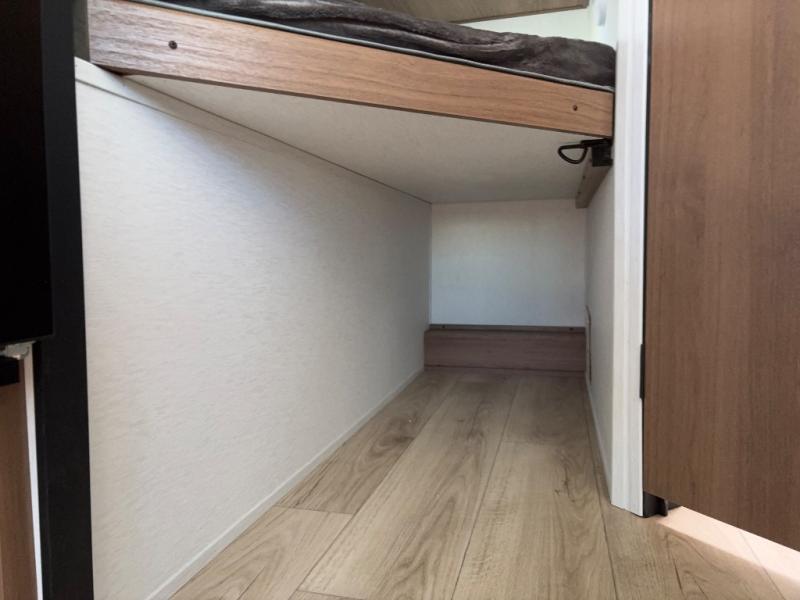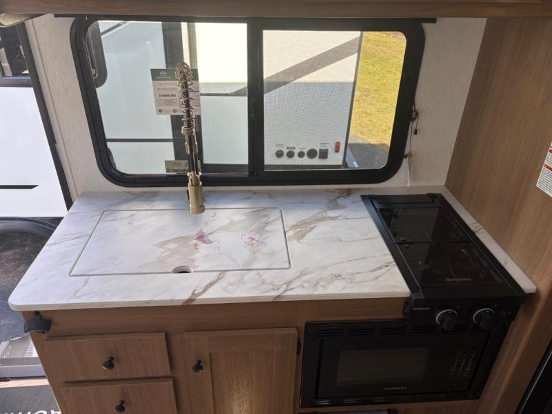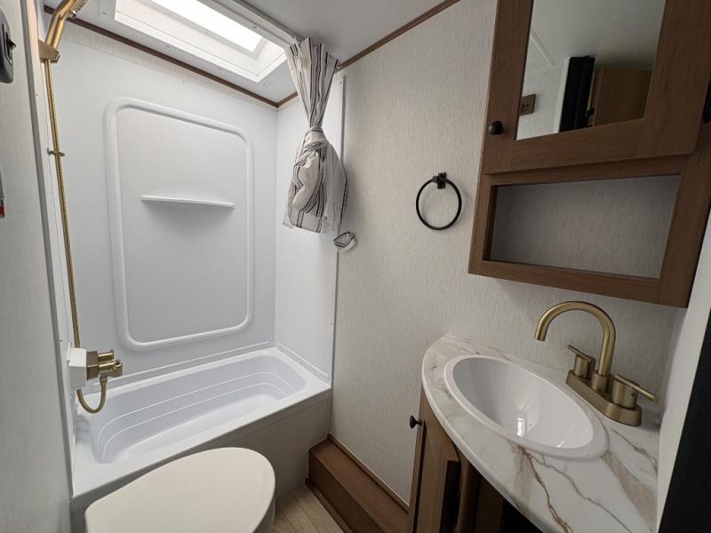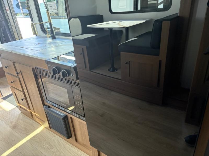 You and a few friends or family members can camp comfortably in this travel trailer! It features a front queen bed with wardrobes on either side to keep your clothes out of the way or you can switch it out for the optional Murphy bed for more versatility. Two others can sleep on the rear corner upper double bed and lower flip up double bed. After you have fried up some eggs on the two burner cooktop and heated up a piece of banana bread in the microwave, you can head to the booth dinette slide to enjoy it. There is even a pantry to store your coffee grounds and snacks. Now that your bellies are full, you can freshen up in the rear corner bathroom with the tub/shower.