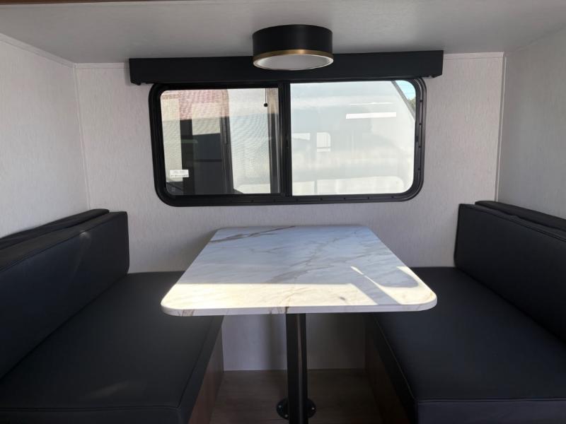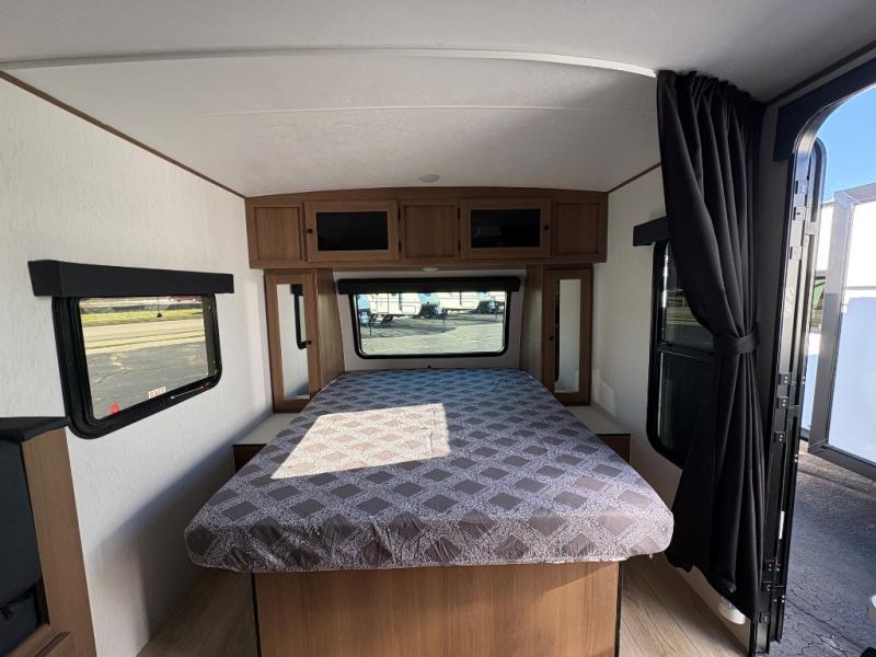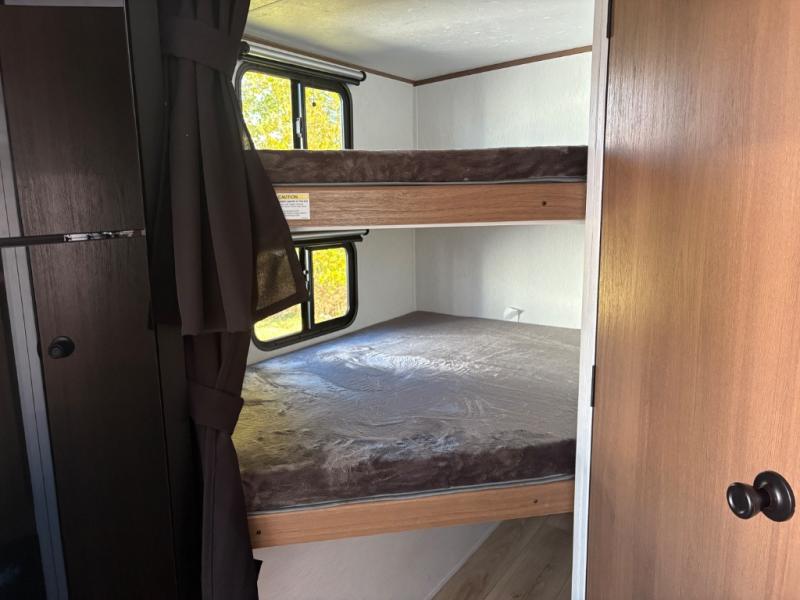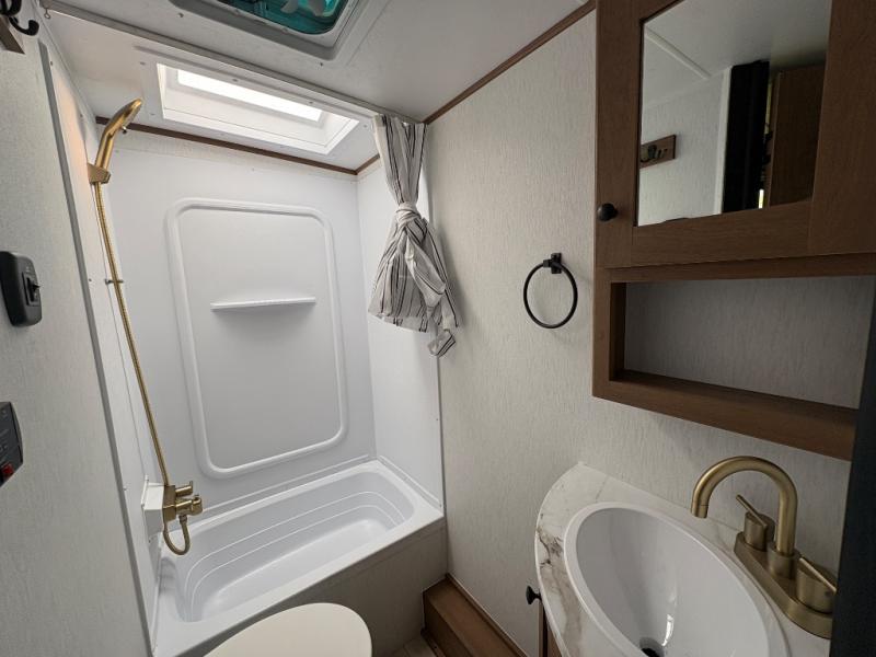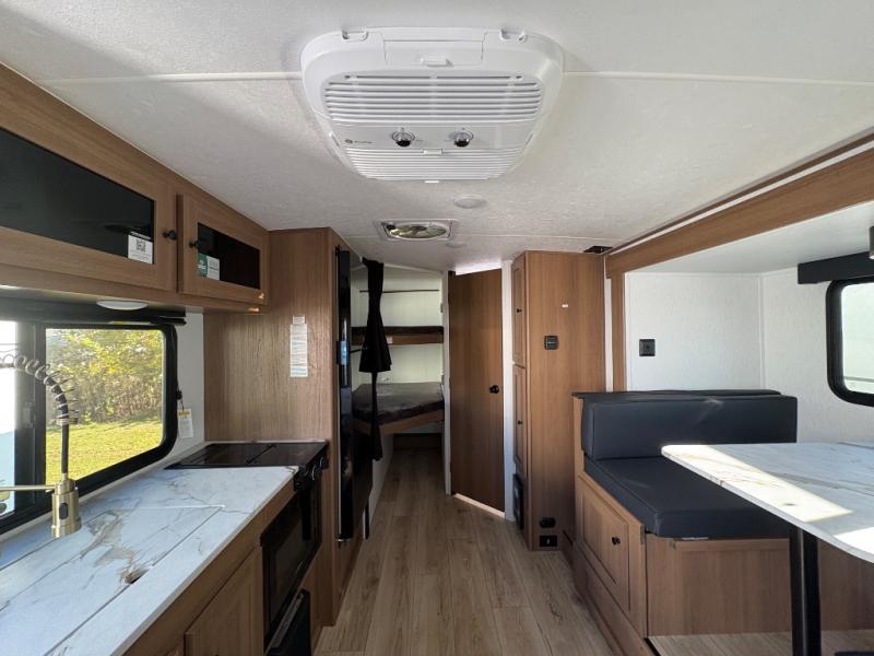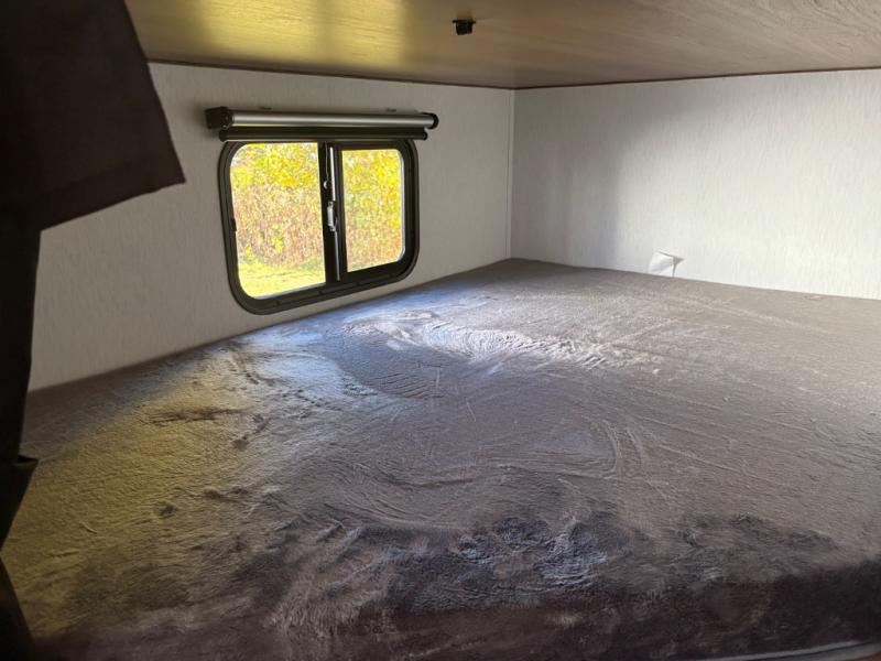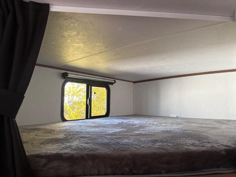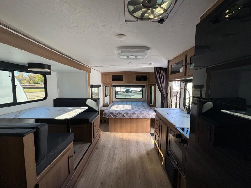 You and a few friends or family members can camp comfortably in this travel trailer! It features a front queen bed with wardrobes on either side to keep your clothes out of the way or you can switch it out for the optional Murphy bed for more versatility. Two others can sleep on the rear corner upper double bed and lower flip up double bed. After you have fried up some eggs on the two burner cooktop and heated up a piece of banana bread in the microwave, you can head to the booth dinette slide to enjoy it. There is even a pantry to store your coffee grounds and snacks. Now that your bellies are full, you can freshen up in the rear corner bathroom with the tub/shower.