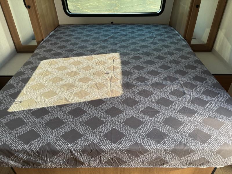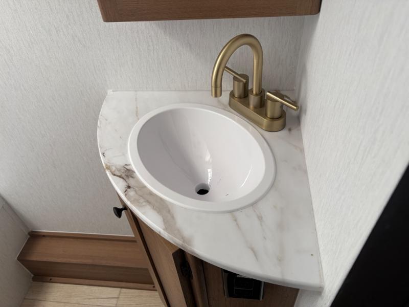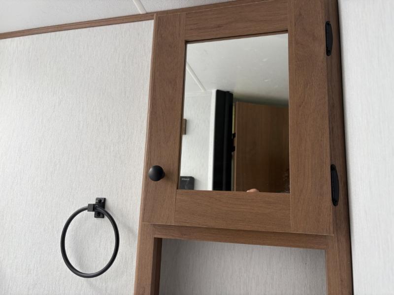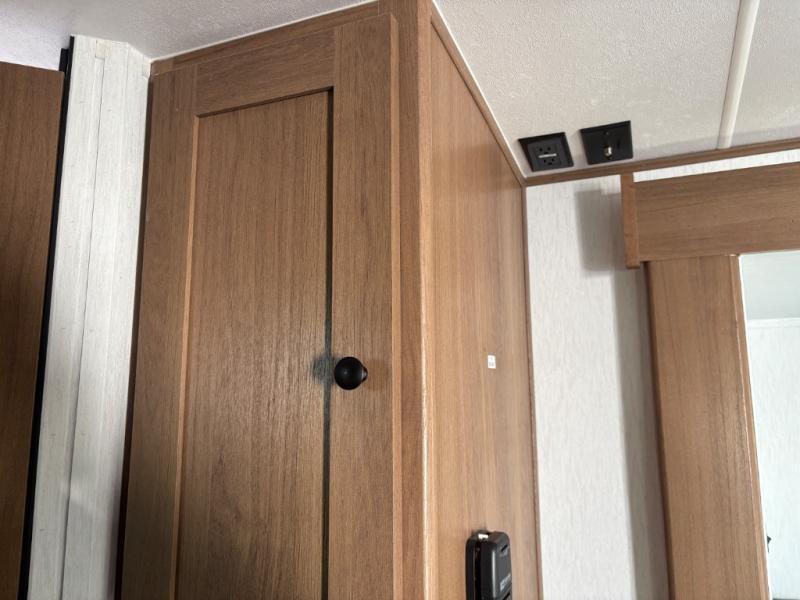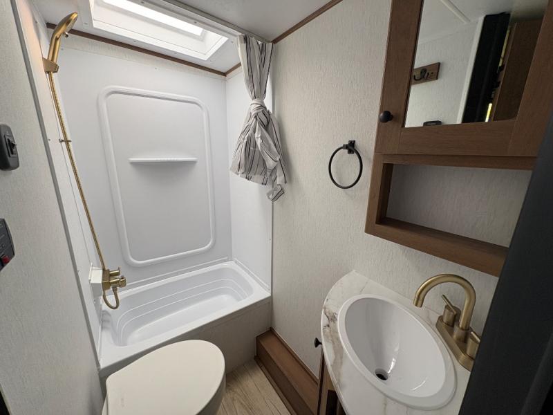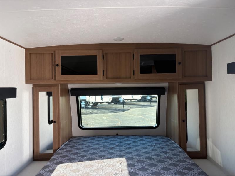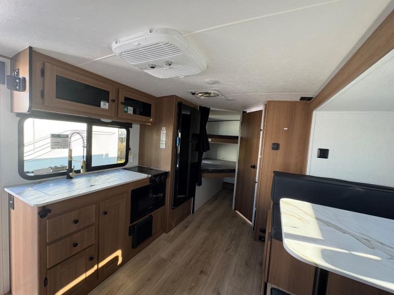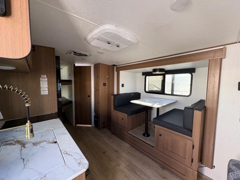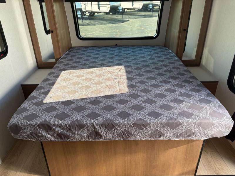 You and a few friends or family members can camp comfortably in this travel trailer! It features a front queen bed with wardrobes on either side to keep your clothes out of the way or you can switch it out for the optional Murphy bed for more versatility. Two others can sleep on the rear corner upper double bed and lower flip up double bed. After you have fried up some eggs on the two burner cooktop and heated up a piece of banana bread in the microwave, you can head to the booth dinette slide to enjoy it. There is even a pantry to store your coffee grounds and snacks. Now that your bellies are full, you can freshen up in the rear corner bathroom with the tub/shower.