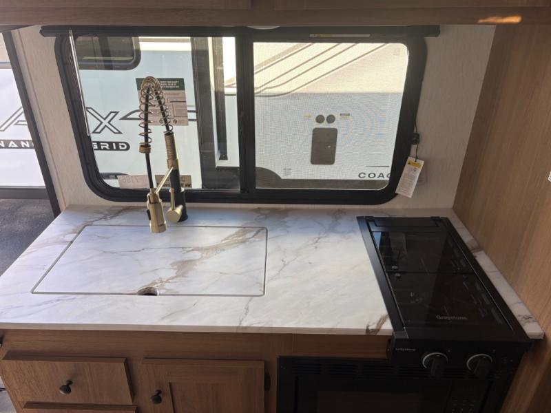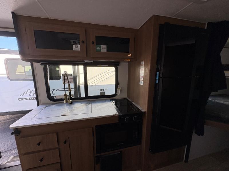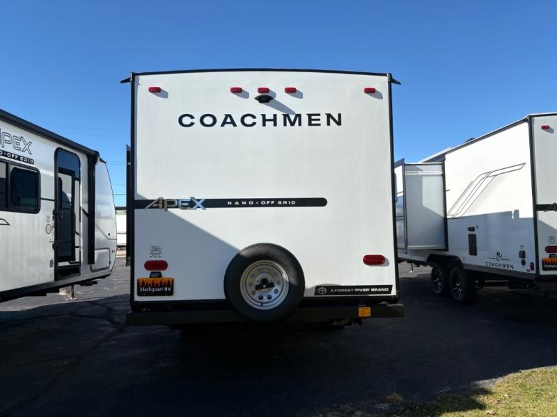 You will find comfort, convenience, and a sturdy construction with each of these Coachmen RV Apex Nano travel trailers! They are held together with an aluma-cage construction, an I-beam chassis, plus vacuum-bonded laminated dual Azdel fiberglass walls for double the protection against the elements. The 400-watt solar panel with a 30 amp control charger is included, along with two 20 lb. LP tanks, a high velocity power roof vent, plus 12V outlets to keep you powered up. More exterior features include a hot/cold shower, four stabilizer jacks, a power awning with LED lighting, and radius thumb latch baggage doors to easily pack and unload your gear. You will love the interior of your Apex Nano with Congoleum residential flooring, one-piece seamless edge countertops, matte black hardware in the galley, and a hand-crafted wood medicine cabinet in the bath.