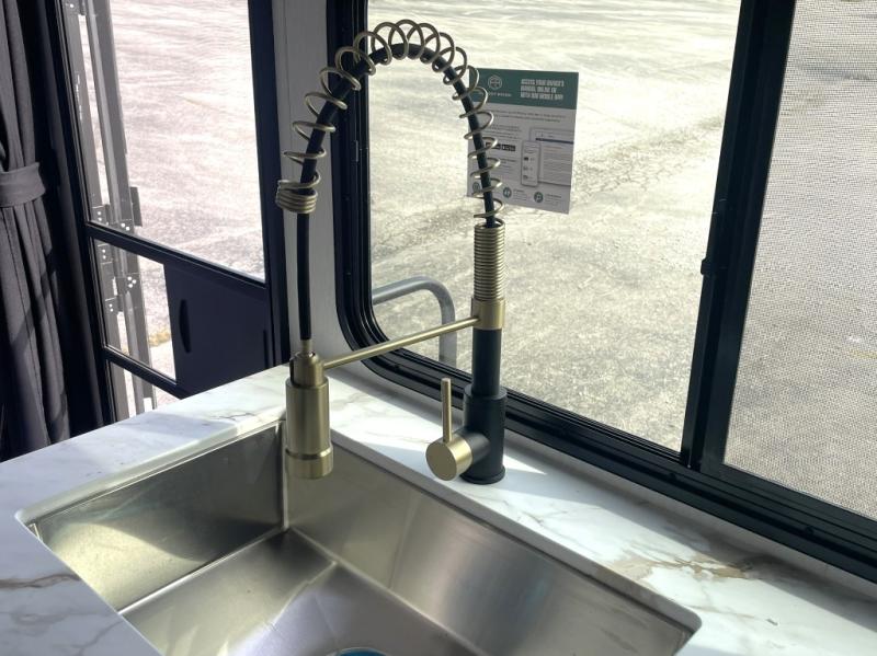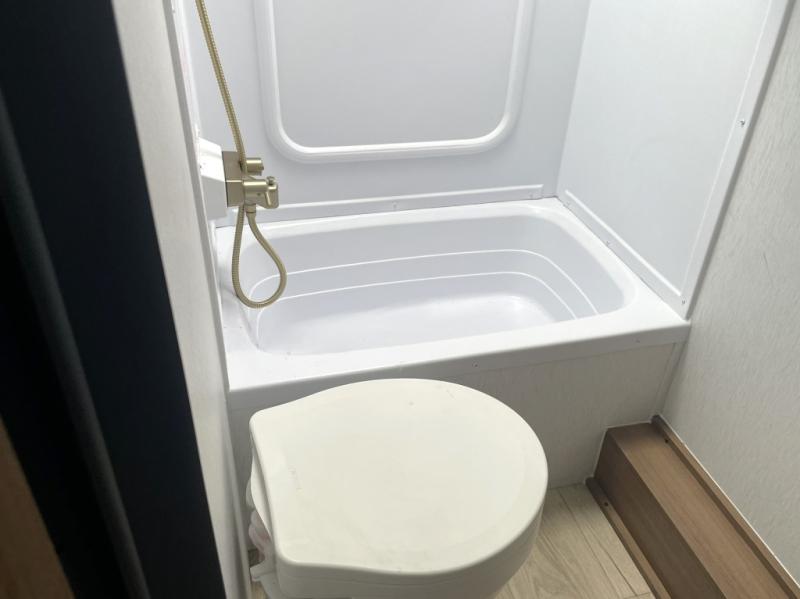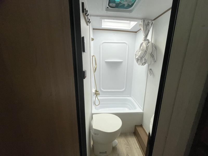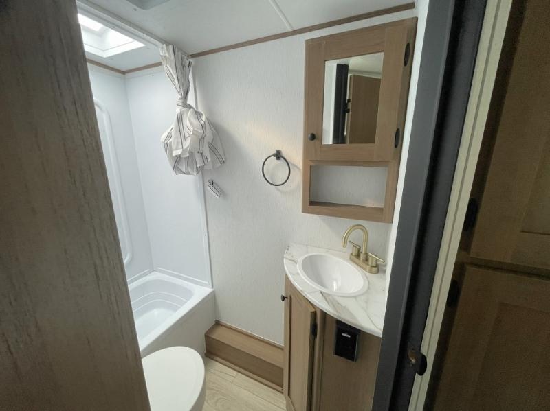 Comfortable Interior Finishes: Includes Congoleum residential flooring, seamless countertops, matte black galley hardware, and a hand-crafted medicine cabinet, creating a cozy and modern feel.