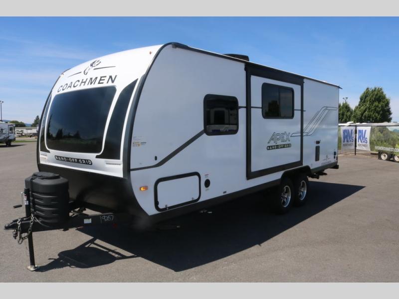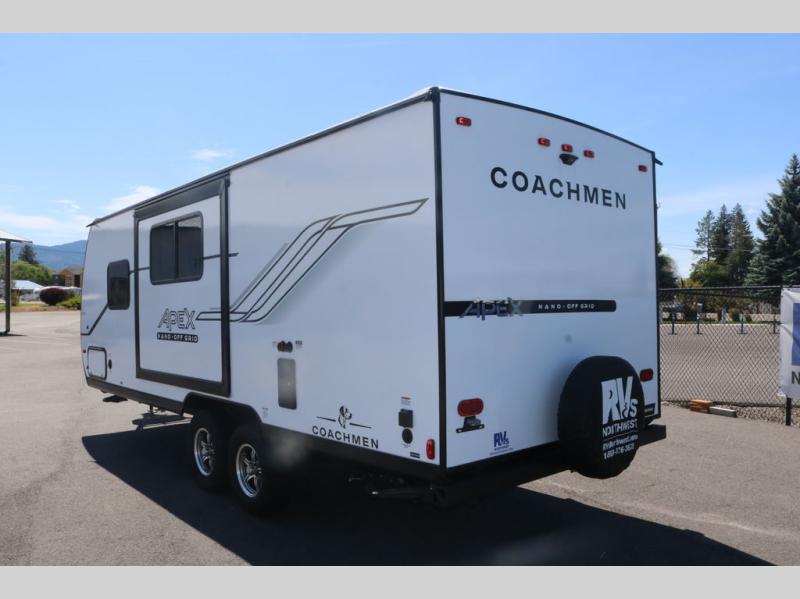 You will find comfort, convenience, and a sturdy construction with each of these Coachmen RV Apex Nano travel trailers! They are held together with an aluma-cage construction, an I-beam chassis, plus vacuum-bonded laminated dual Azdel fiberglass walls for double the protection against the elements. The 400-watt solar panel with a 30 amp control charger is included, along with two 20 lb. LP tanks, a high velocity power roof vent, plus 12V outlets to keep you powered up. More exterior features include a hot/cold shower, four stabilizer jacks, a power awning with LED lighting, and radius thumb latch baggage doors to easily pack and unload your gear. You will love the interior of your Apex Nano with Congoleum residential flooring, one-piece seamless edge countertops, matte black hardware in the galley, and a hand-crafted wood medicine cabinet in the bath.