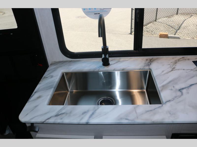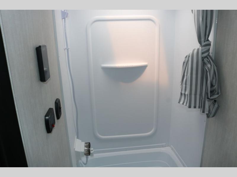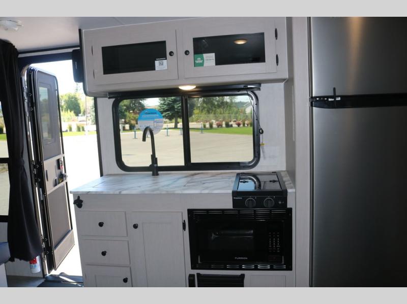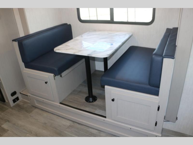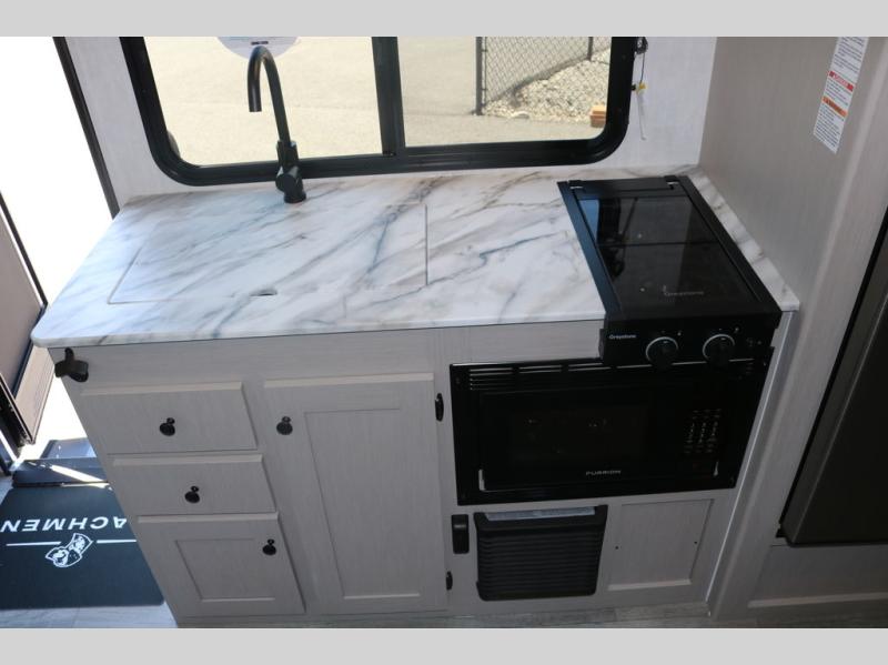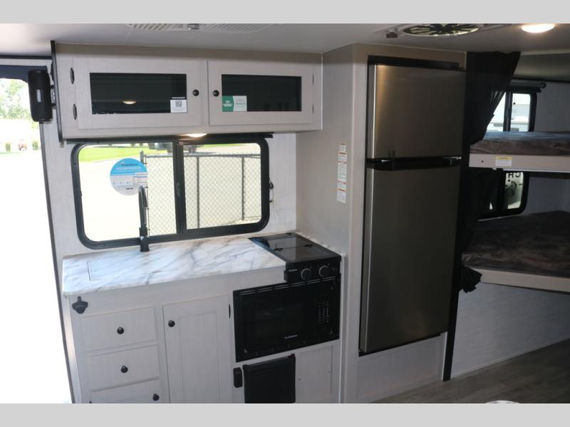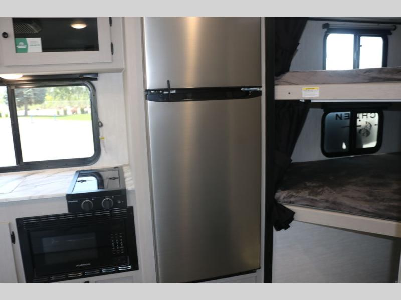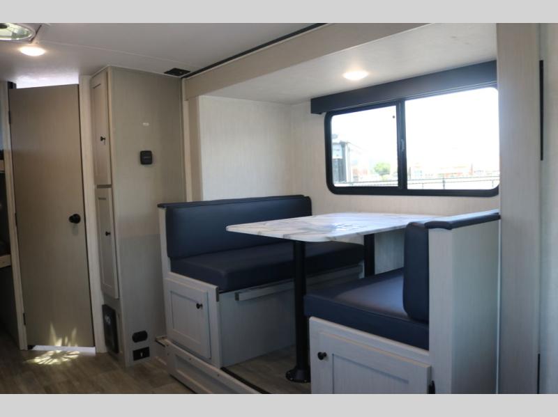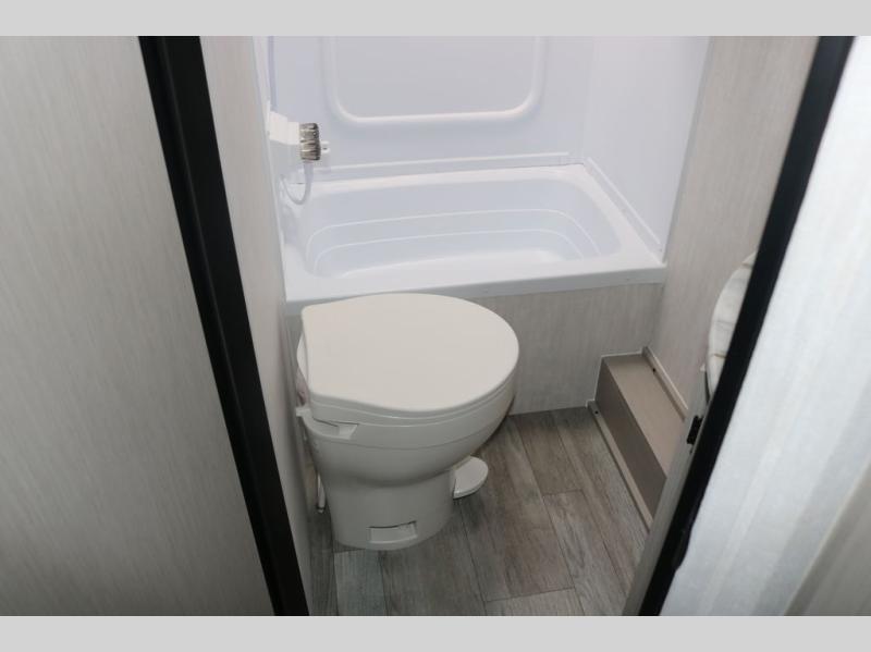 You and a few friends or family members can camp comfortably in this travel trailer! It features a front queen bed with wardrobes on either side to keep your clothes out of the way or you can switch it out for the optional Murphy bed for more versatility. Two others can sleep on the rear corner upper double bed and lower flip up double bed. After you have fried up some eggs on the two burner cooktop and heated up a piece of banana bread in the microwave, you can head to the booth dinette slide to enjoy it. There is even a pantry to store your coffee grounds and snacks. Now that your bellies are full, you can freshen up in the rear corner bathroom with the tub/shower.