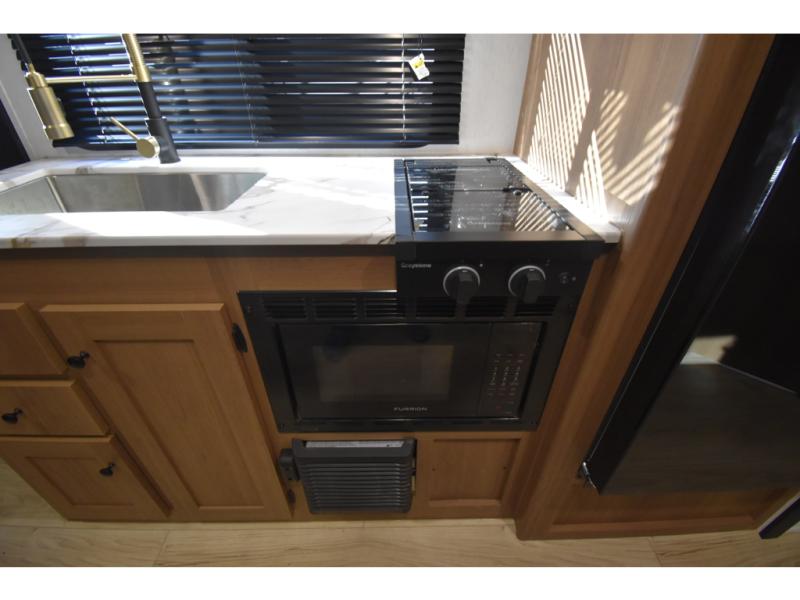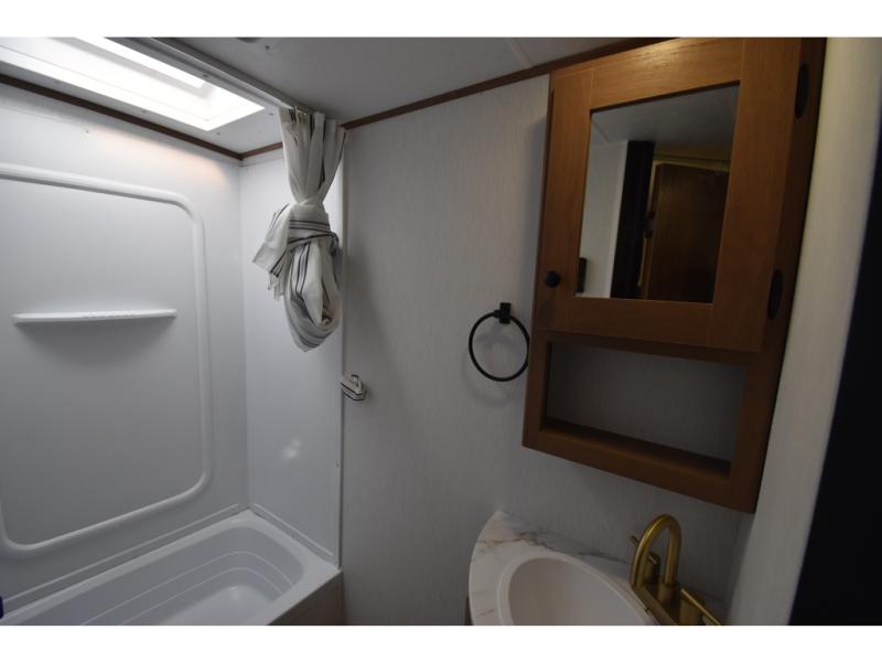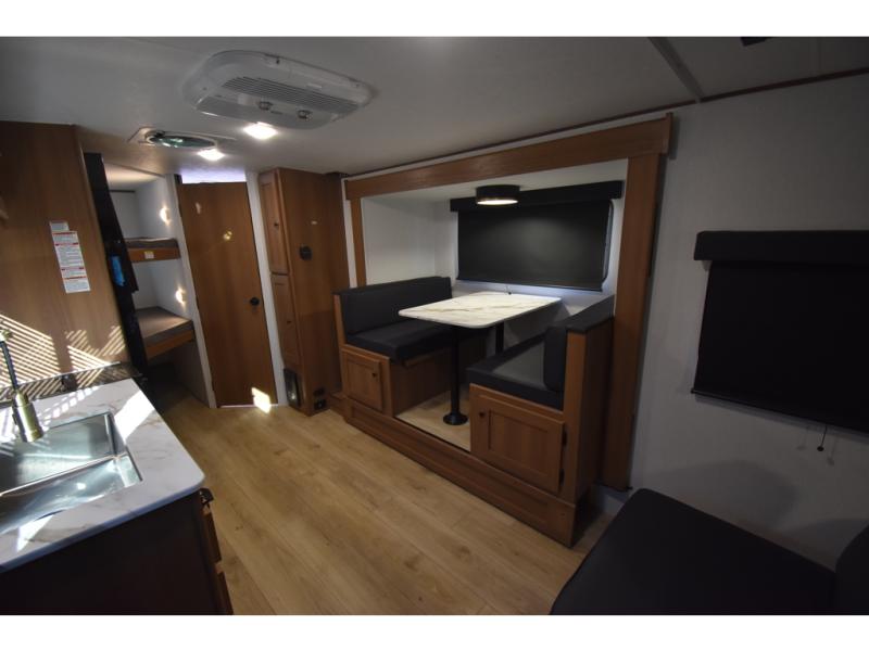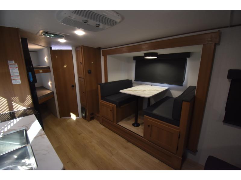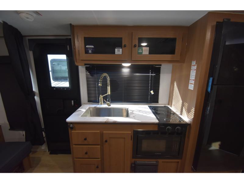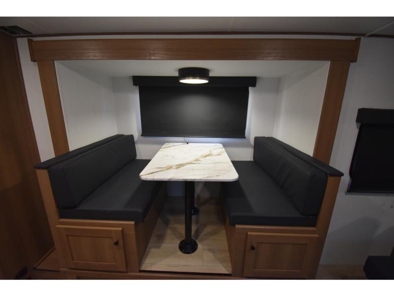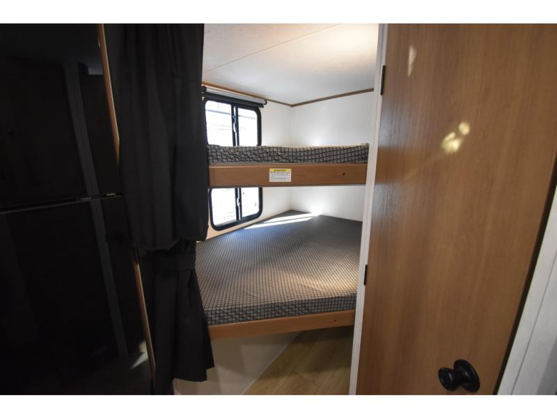 You and a few friends or family members can camp comfortably in this travel trailer! It features a front queen bed with wardrobes on either side to keep your clothes out of the way or you can switch it out for the optional Murphy bed for more versatility. Two others can sleep on the rear corner upper double bed and lower flip up double bed. After you have fried up some eggs on the two burner cooktop and heated up a piece of banana bread in the microwave, you can head to the booth dinette slide to enjoy it. There is even a pantry to store your coffee grounds and snacks. Now that your bellies are full, you can freshen up in the rear corner bathroom with the tub/shower.