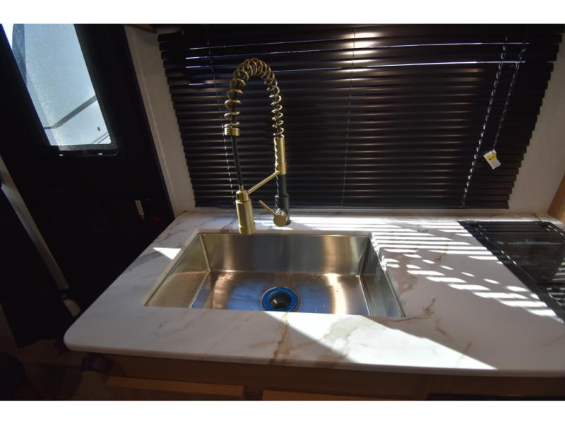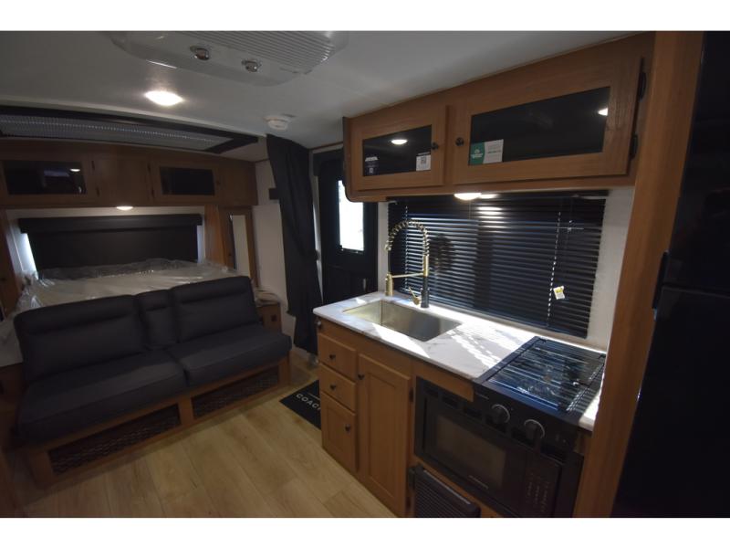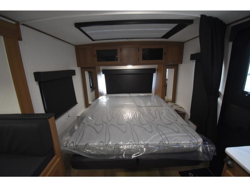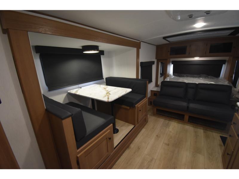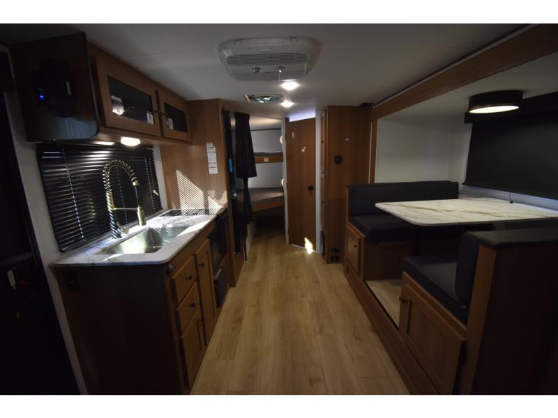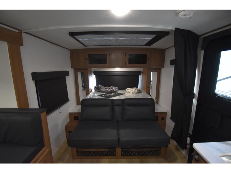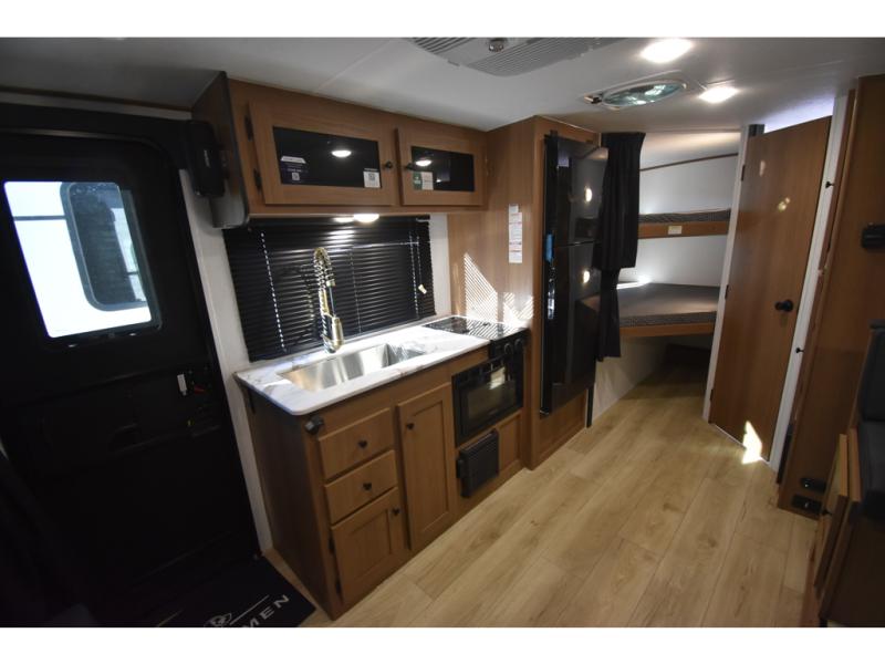 You and a few friends or family members can camp comfortably in this travel trailer! It features a front queen bed with wardrobes on either side to keep your clothes out of the way or you can switch it out for the optional Murphy bed for more versatility. Two others can sleep on the rear corner upper double bed and lower flip up double bed. After you have fried up some eggs on the two burner cooktop and heated up a piece of banana bread in the microwave, you can head to the booth dinette slide to enjoy it. There is even a pantry to store your coffee grounds and snacks. Now that your bellies are full, you can freshen up in the rear corner bathroom with the tub/shower.