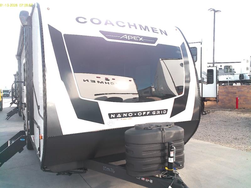 You will find comfort, convenience, and a sturdy construction with each of these Coachmen RV Apex Nano travel trailers! They are held together with an aluma-cage construction, an I-beam chassis, plus vacuum-bonded laminated dual Azdel fiberglass walls for double the protection against the elements. The 400-watt solar panel with a 30 amp control charger is included, along with two 20 lb. LP tanks, a high velocity power roof vent, plus 12V outlets to keep you powered up. More exterior features include a hot/cold shower, four stabilizer jacks, a power awning with LED lighting, and radius thumb latch baggage doors to easily pack and unload your gear. You will love the interior of your Apex Nano with Congoleum residential flooring, one-piece seamless edge countertops, matte black hardware in the galley, and a hand-crafted wood medicine cabinet in the bath.