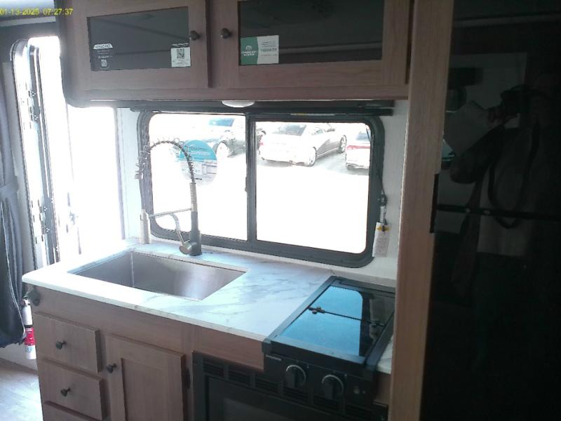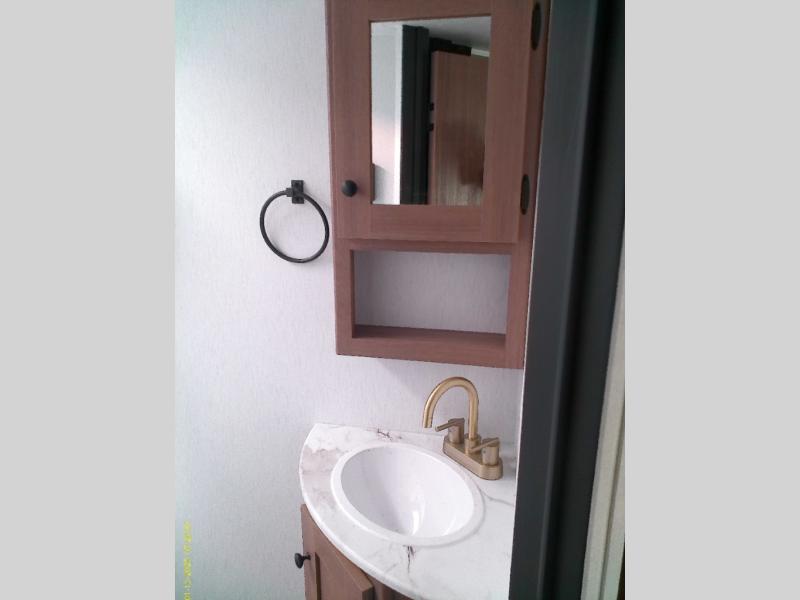 You and a few friends or family members can camp comfortably in this travel trailer! It features a front queen bed with wardrobes on either side to keep your clothes out of the way or you can switch it out for the optional Murphy bed for more versatility. Two others can sleep on the rear corner upper double bed and lower flip up double bed. After you have fried up some eggs on the two burner cooktop and heated up a piece of banana bread in the microwave, you can head to the booth dinette slide to enjoy it. There is even a pantry to store your coffee grounds and snacks. Now that your bellies are full, you can freshen up in the rear corner bathroom with the tub/shower.
