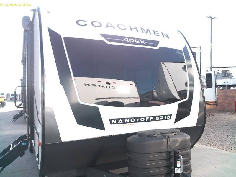 You will find comfort, convenience, and a sturdy construction with each of these Coachmen RV Apex Nano travel trailers! They are held together with an aluma-cage construction, an I-beam chassis, plus vacuum-bonded laminated dual Azdel fiberglass walls for double the protection against the elements. The 400-watt solar panel with a 30 amp control charger is included, along with two 20 lb. LP tanks, a high velocity power roof vent, plus 12V outlets to keep you powered up. More exterior features include a hot/cold shower, four stabilizer jacks, a power awning with LED lighting, and radius thumb latch baggage doors to easily pack and unload your gear. You will love the interior of your Apex Nano with Congoleum residential flooring, one-piece seamless edge countertops, matte black hardware in the galley, and a hand-crafted wood medicine cabinet in the bath.