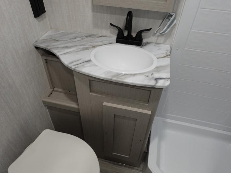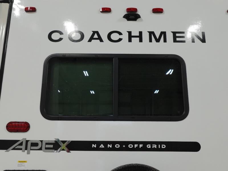 You will find comfort, convenience, and a sturdy construction with each of these Coachmen RV Apex Nano travel trailers! They are held together with an aluma-cage construction, an I-beam chassis, plus vacuum-bonded laminated dual Azdel fiberglass walls for double the protection against the elements. The 200-watt solar panel with a 30 amp control charger is included within the Off-Grid Package, along with two 20 lb. LP tanks, a high velocity power roof vent, plus 12V outlets to keep you powered up. More exterior feature include a hot/cold shower, four stabilizer jacks, a power awning with LED lighting, and magnetic baggage door catches to easily pack and unload your gear. You will love the interior of your Apex Nano with Congoleum residential flooring, one-piece seamless edge countertops, matte black hardware in the galley, and a hand-crafted wood medicine cabinet in the bath.