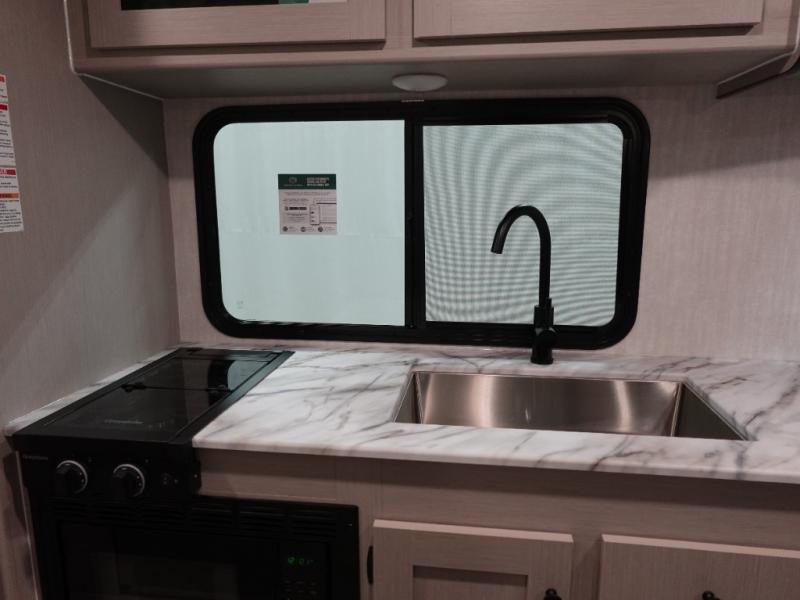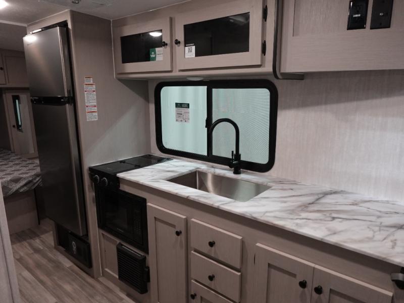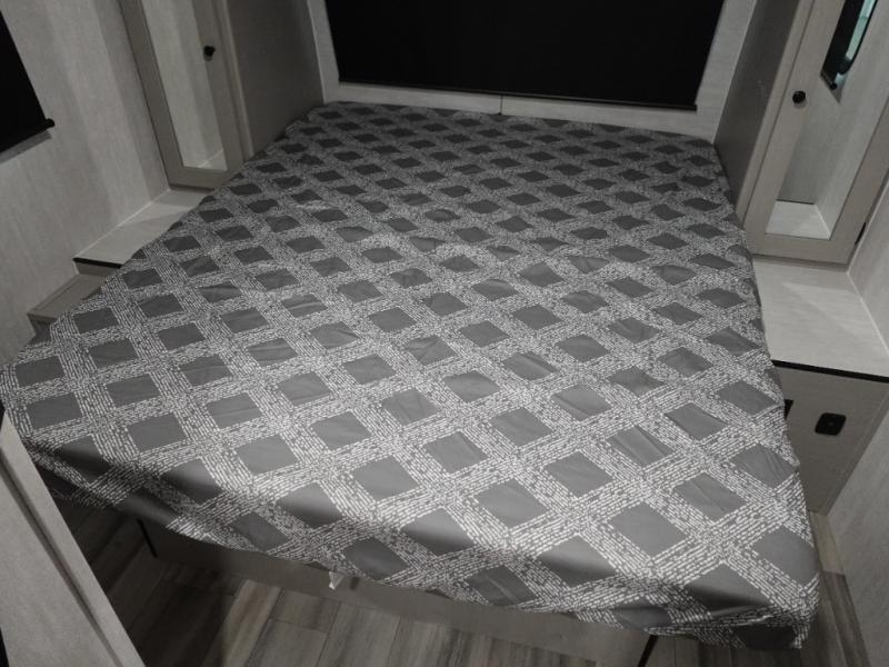 Escape the hustle and bustle of everyday life with this travel trailer! You will start each morning feeling recharged after sleeping on the front queen bed with wardrobes on either side to keep your clothes looking nice. The full bathroom has a neo-angled shower for you to freshen up and a medicine cabinet to store your toiletries. The sofa slide is across from the entertainment center for a comfortable movie night if you add your own TV, or you can play some card games at the rear booth dinette with an end table on one side.