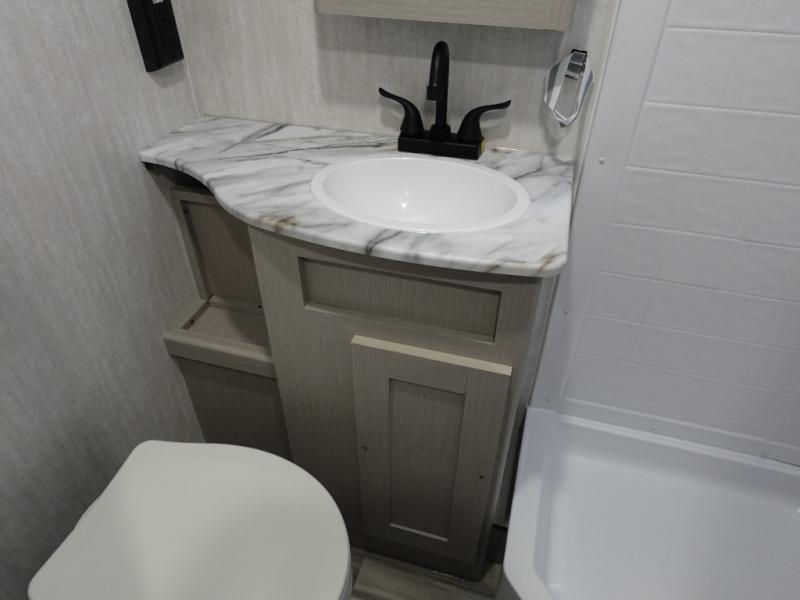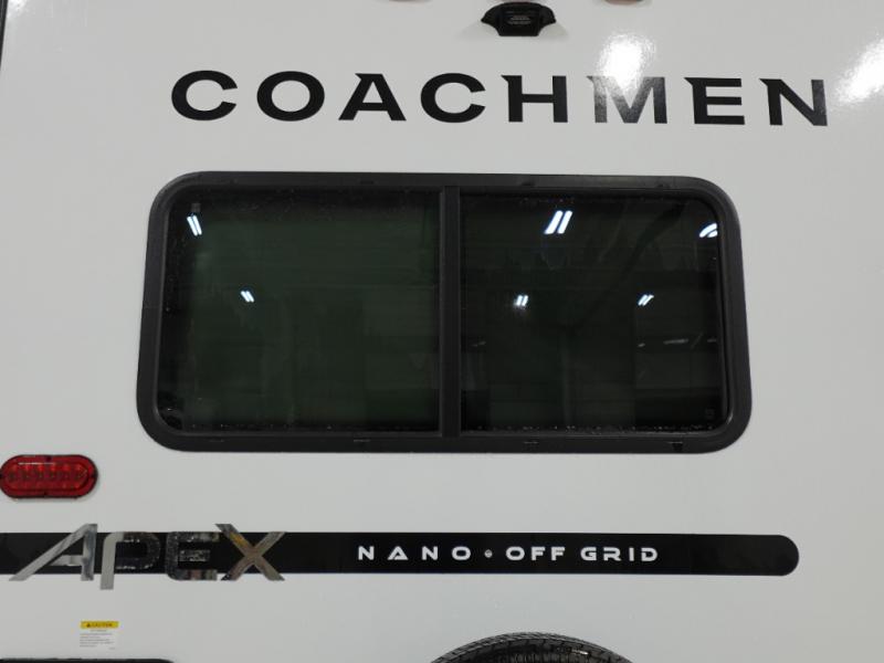 You will find comfort, convenience, and a sturdy construction with each of these Coachmen RV Apex Nano travel trailers! They are held together with an aluma-cage construction, an I-beam chassis, plus vacuum-bonded laminated dual Azdel fiberglass walls for double the protection against the elements. The 200-watt solar panel with a 30 amp control charger is included within the Off-Grid Package, along with two 20 lb. LP tanks, a high velocity power roof vent, plus 12V outlets to keep you powered up. More exterior feature include a hot/cold shower, four stabilizer jacks, a power awning with LED lighting, and magnetic baggage door catches to easily pack and unload your gear. You will love the interior of your Apex Nano with Congoleum residential flooring, one-piece seamless edge countertops, matte black hardware in the galley, and a hand-crafted wood medicine cabinet in the bath.