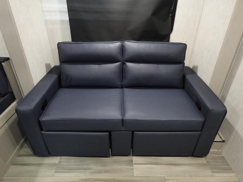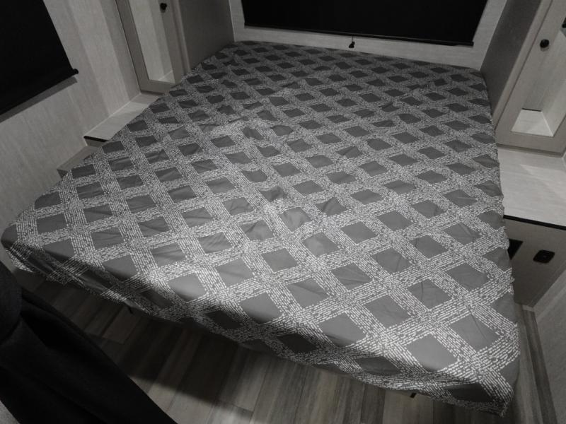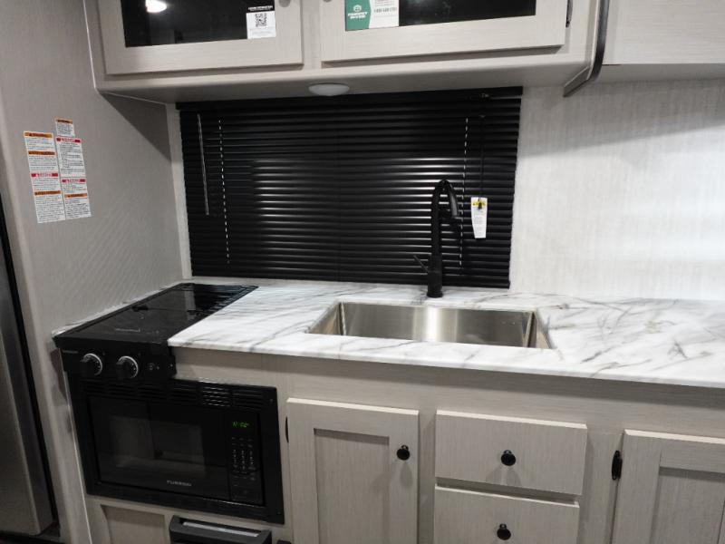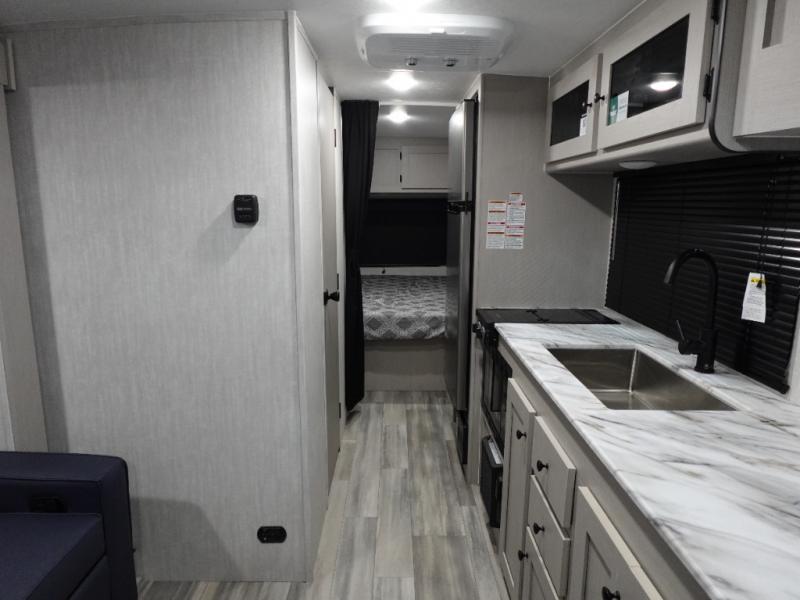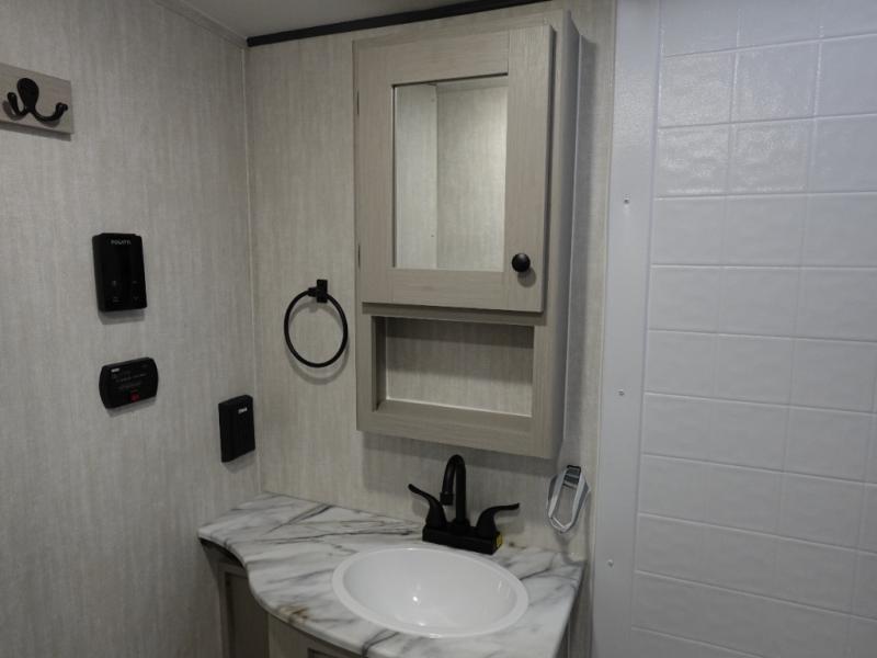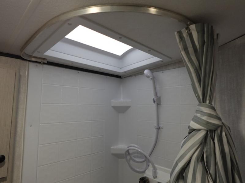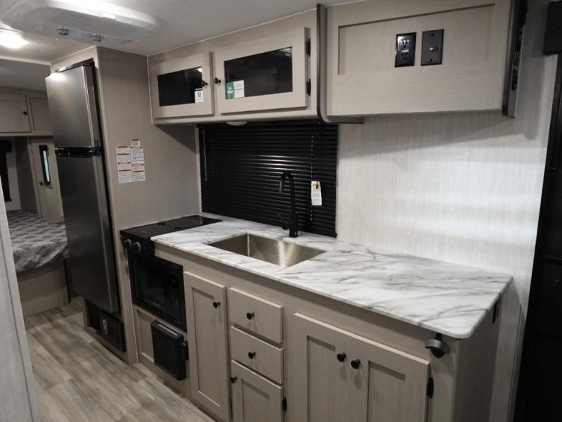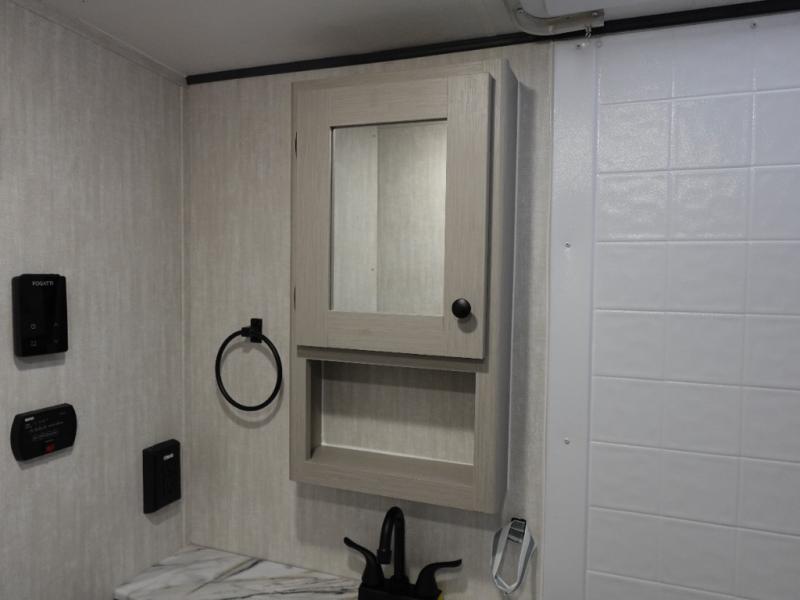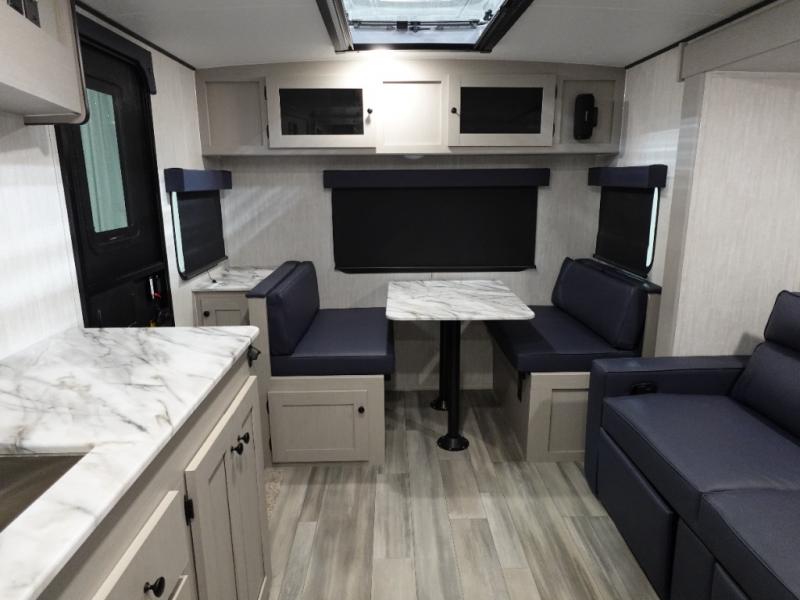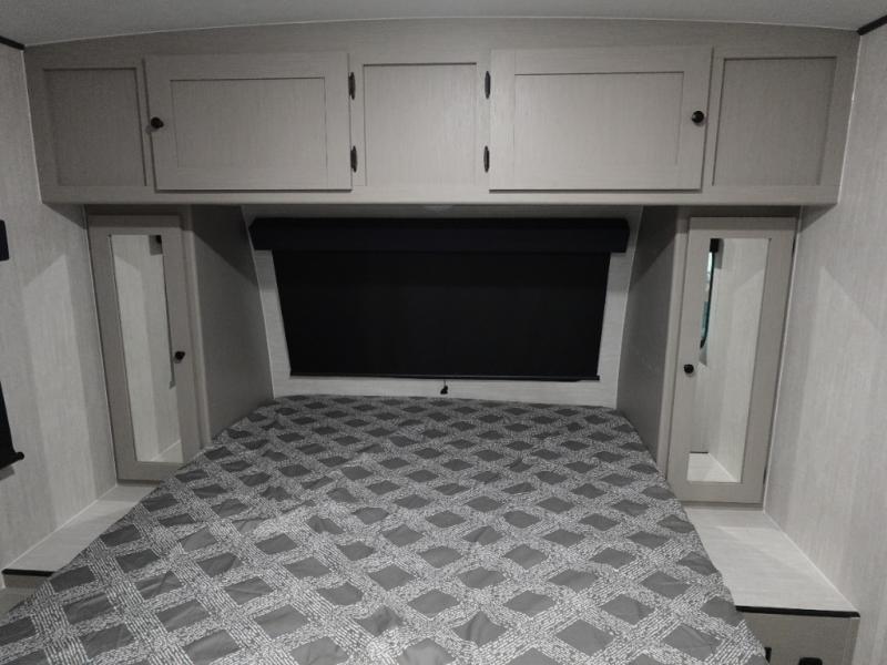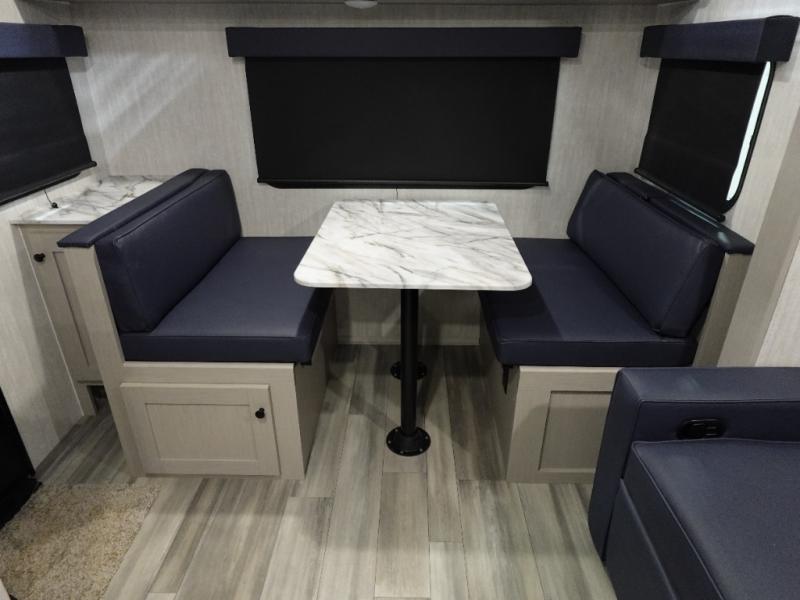 Escape the hustle and bustle of everyday life with this travel trailer! You will start each morning feeling recharged after sleeping on the front queen bed with wardrobes on either side to keep your clothes looking nice. The full bathroom has a neo-angled shower for you to freshen up and a medicine cabinet to store your toiletries. The sofa slide is across from the entertainment center for a comfortable movie night if you add your own TV, or you can play some card games at the rear booth dinette with an end table on one side.