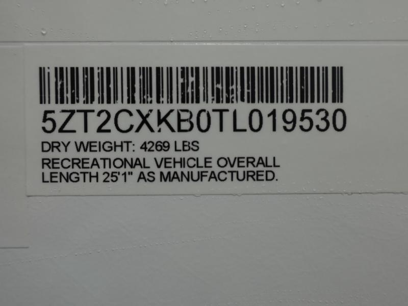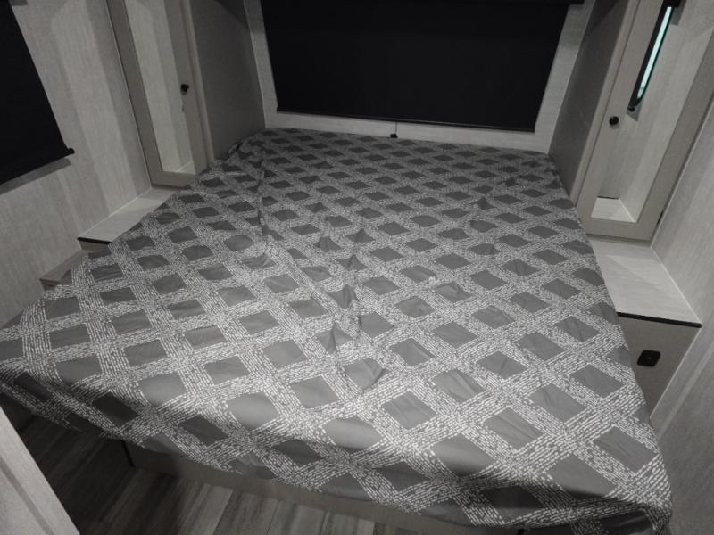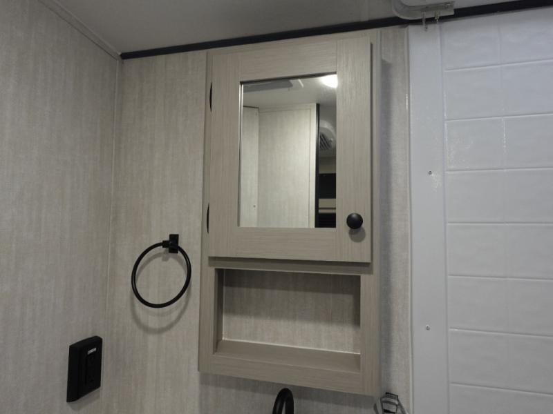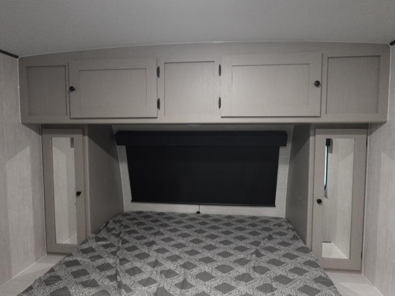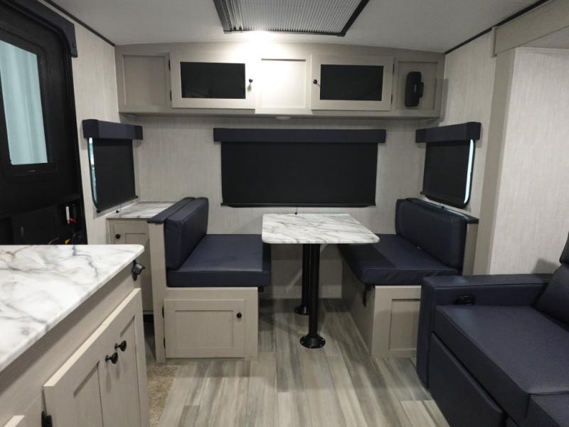Escape the hustle and bustle of everyday life with this travel trailer! You will start each morning feeling recharged after sleeping on the front queen bed with wardrobes on either side to keep your clothes looking nice. The full bathroom has a neo-angled shower for you to freshen up and a medicine cabinet to store your toiletries. The sofa slide is across from the entertainment center for a comfortable movie night if you add your own TV, or you can play some card games at the rear booth dinette with an end table on one side.
