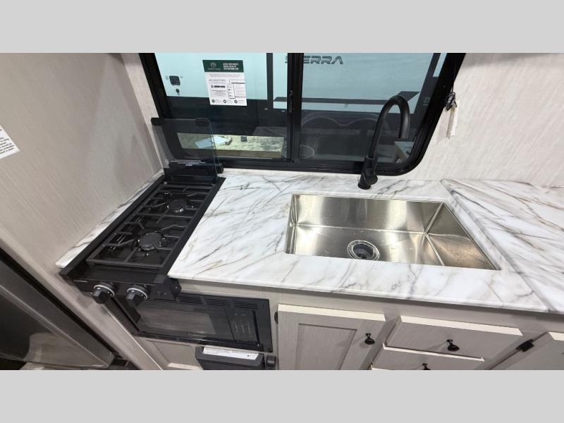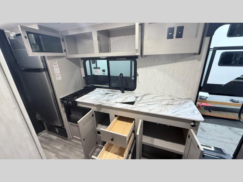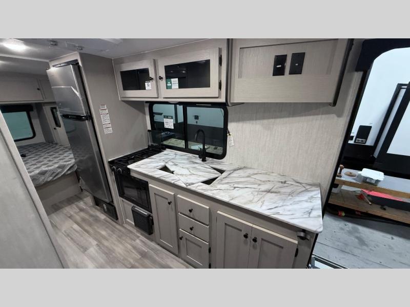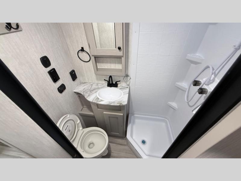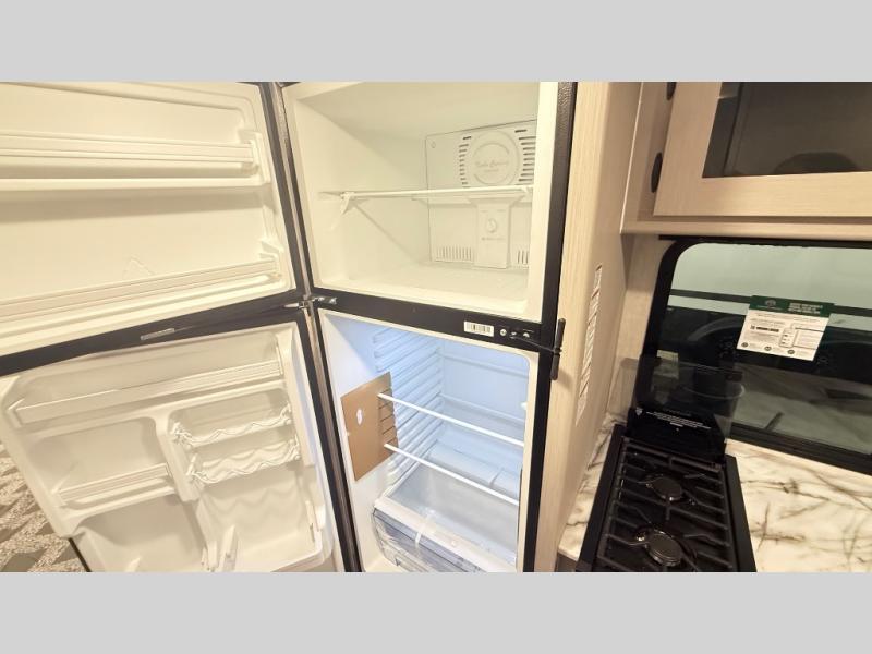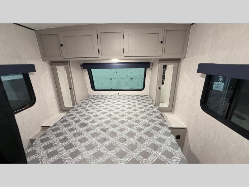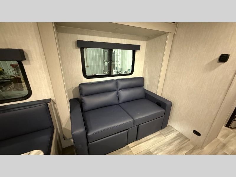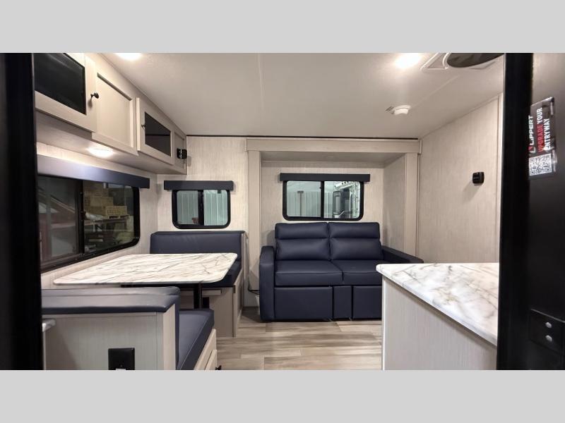 Escape the hustle and bustle of everyday life with this travel trailer! You will start each morning feeling recharged after sleeping on the front queen bed with wardrobes on either side to keep your clothes looking nice. The full bathroom has a neo-angled shower for you to freshen up and a medicine cabinet to store your toiletries. The sofa slide is across from the entertainment center for a comfortable movie night if you add your own TV, or you can play some card games at the rear booth dinette with an end table on one side.