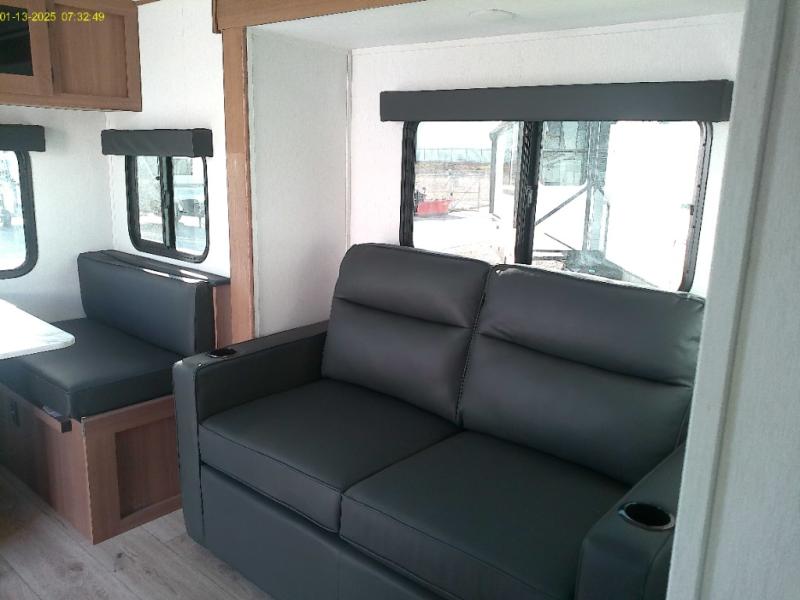 Escape the hustle and bustle of everyday life with this travel trailer! You will start each morning feeling recharged after sleeping on the front queen bed with wardrobes on either side to keep your clothes looking nice. The full bathroom has a neo-angled shower for you to freshen up and a medicine cabinet to store your toiletries, along with a foot flush toilet for convenience. The sofa slide is across from the entertainment center for a comfortable movie night if you add your own TV, or you can play some card games at the rear booth dinette with an end table on one side, that can also work as extra-sleeping space if you were to need it.