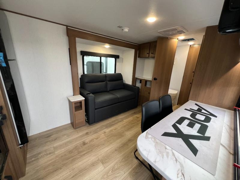 You will find comfort, convenience, and a sturdy construction with each of these Coachmen RV Apex Nano travel trailers! They are held together with an aluma-cage construction, an I-beam chassis, plus vacuum-bonded laminated dual Azdel fiberglass walls for double the protection against the elements. The 400-watt solar panel with a 30 amp control charger is included, along with two 20 lb. LP tanks, a high velocity power roof vent, plus 12V outlets to keep you powered up. More exterior features include a hot/cold shower, four stabilizer jacks, a power awning with LED lighting, and radius thumb latch baggage doors to easily pack and unload your gear. You will love the interior of your Apex Nano with Congoleum residential flooring, one-piece seamless edge countertops, matte black hardware in the galley, and a hand-crafted wood medicine cabinet in the bath.