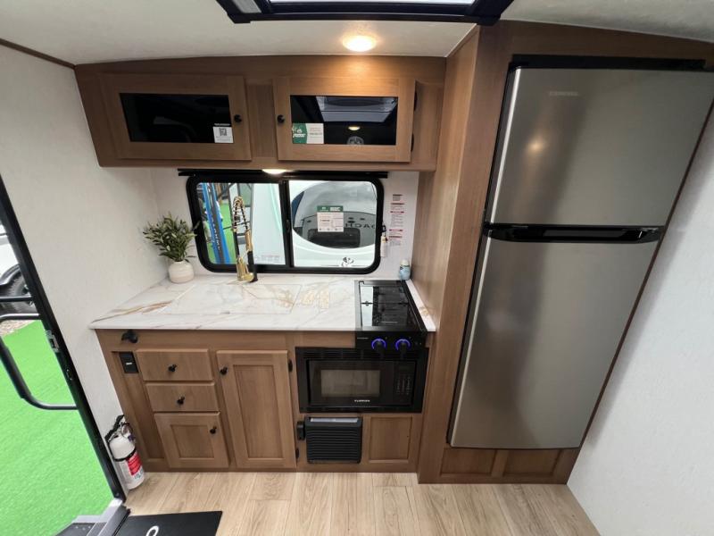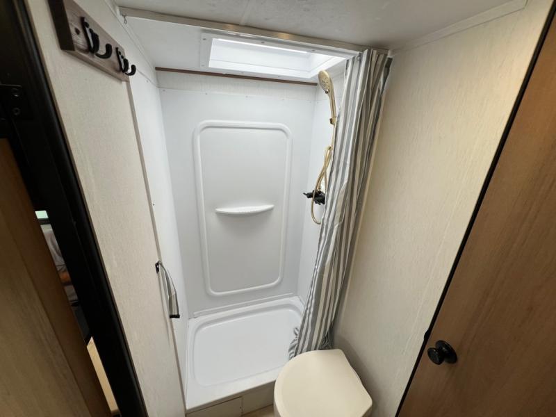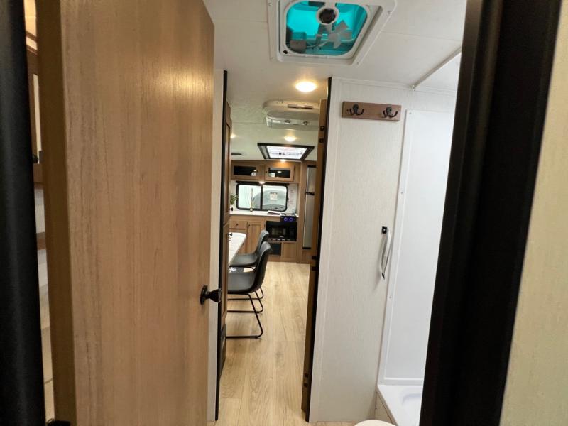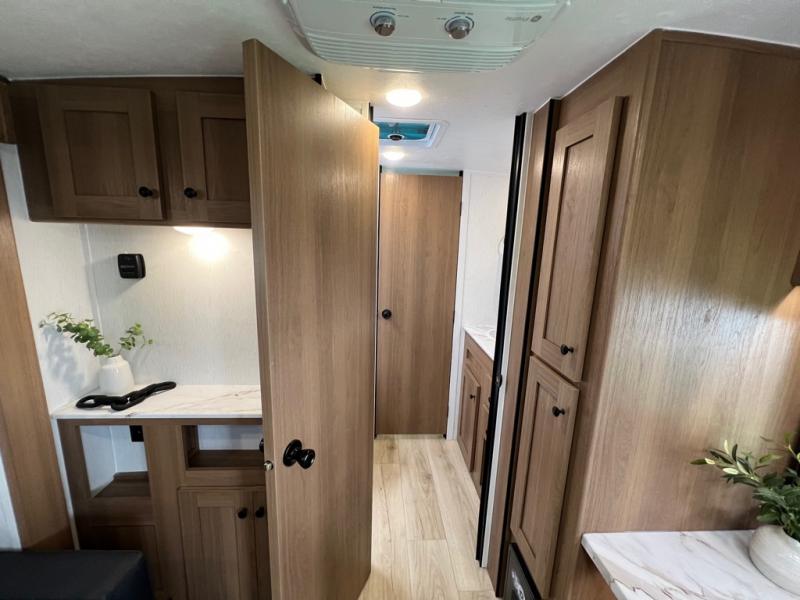 As you step inside, you’re welcomed by a spacious rear kitchen that spans the full width of the trailer, making meal prep both convenient and enjoyable. The kitchen is equipped with a stainless-steel sink featuring a flush mount cover for added counter space, a 2-burner cooktop, an air fryer microwave, and a 10 cu. ft. refrigerator, perfect for storing all your groceries. A pantry adds even more storage for dry goods and kitchen essentials. Just in front of the kitchen, a Bar-V counter with chairs offers a great spot to dine, work, or relax with company. Across from the counter, a comfortable sofa slide provides a cozy lounging area and can also convert into an extra sleeping space when needed. Moving forward, the walk-through bathroom features a shower, a skylight for natural light, and a foot flush toilet for added convenience. At the front of the trailer, the private bedroom includes a queen bed flanked by wardrobes on each side, offering both comfort and practical storage for all your essentials.