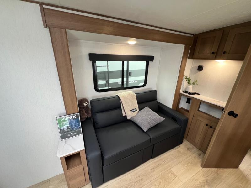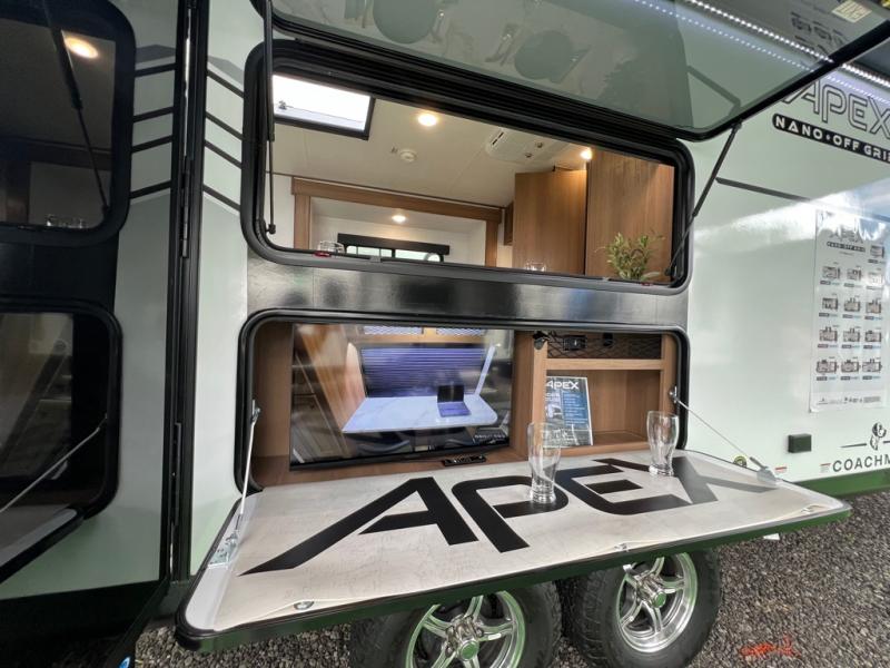 You will find comfort, convenience, and a sturdy construction with each of these Coachmen RV Apex Nano travel trailers! They are held together with an aluma-cage construction, an I-beam chassis, plus vacuum-bonded laminated dual Azdel fiberglass walls for double the protection against the elements. The 400-watt solar panel with a 30 amp control charger is included, along with two 20 lb. LP tanks, a high velocity power roof vent, plus 12V outlets to keep you powered up. More exterior features include a hot/cold shower, four stabilizer jacks, a power awning with LED lighting, and radius thumb latch baggage doors to easily pack and unload your gear. You will love the interior of your Apex Nano with Congoleum residential flooring, one-piece seamless edge countertops, matte black hardware in the galley, and a hand-crafted wood medicine cabinet in the bath.