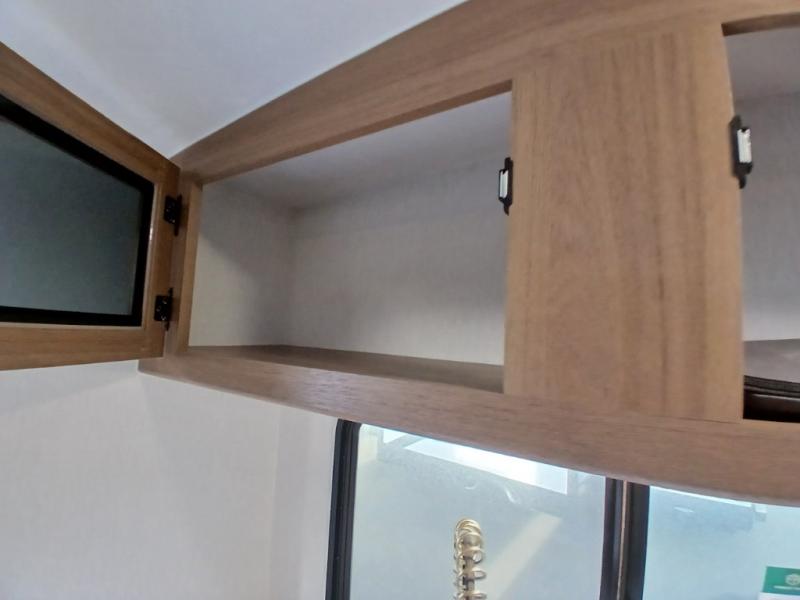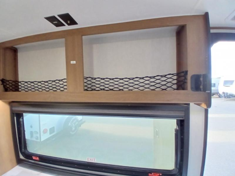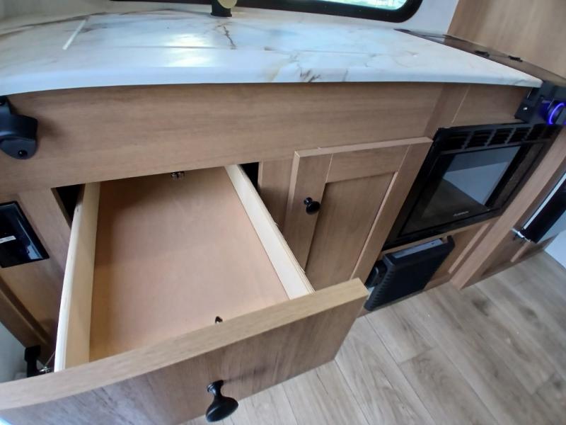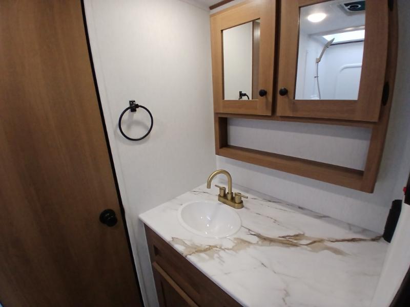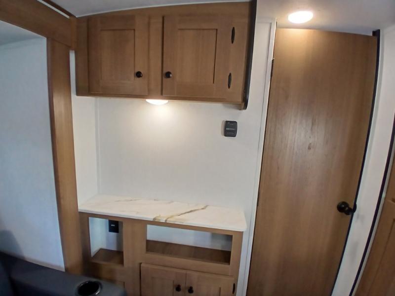 As you step inside, you’re welcomed by a spacious rear kitchen that spans the full width of the trailer, making meal prep both convenient and enjoyable. The kitchen is equipped with a stainless-steel sink featuring a flush mount cover for added counter space, a 2-burner cooktop, an air fryer microwave, and a 10 cu. ft. refrigerator, perfect for storing all your groceries. A pantry adds even more storage for dry goods and kitchen essentials. Just in front of the kitchen, a Bar-V counter with chairs offers a great spot to dine, work, or relax with company. Across from the counter, a comfortable sofa slide provides a cozy lounging area and can also convert into an extra sleeping space when needed. Moving forward, the walk-through bathroom features a shower, a skylight for natural light, and a foot flush toilet for added convenience. At the front of the trailer, the private bedroom includes a queen bed flanked by wardrobes on each side, offering both comfort and practical storage for all your essentials.