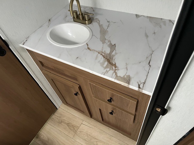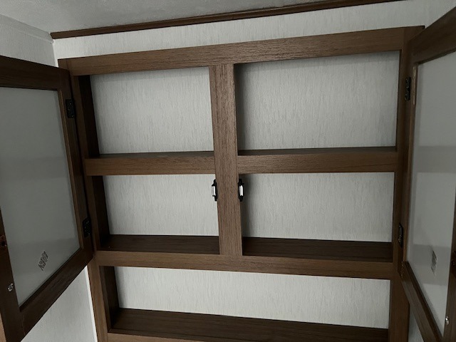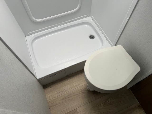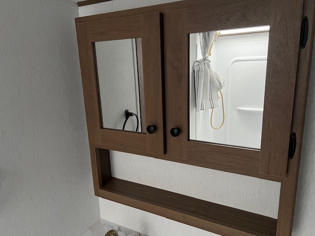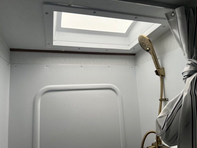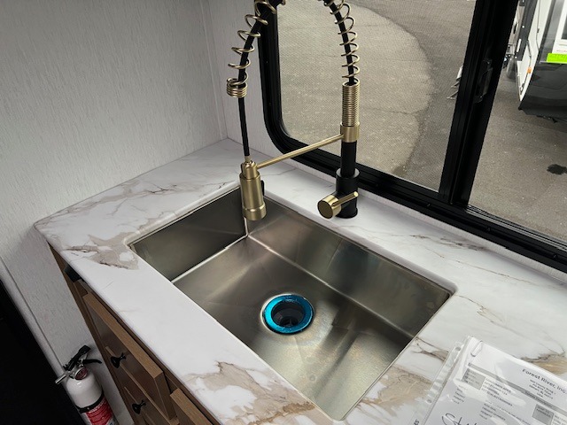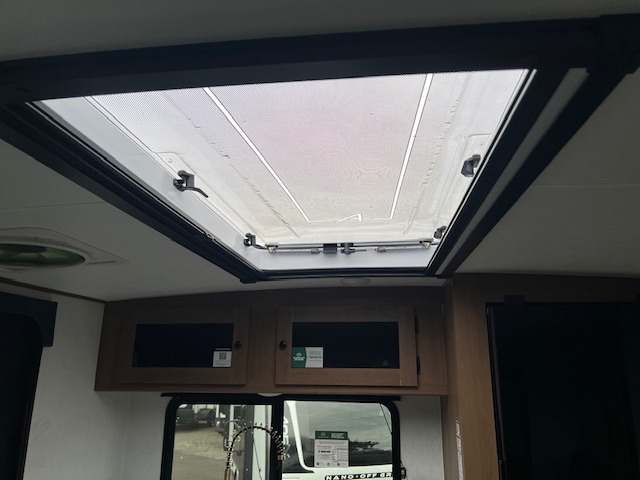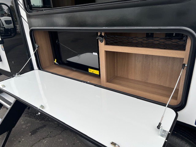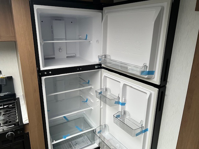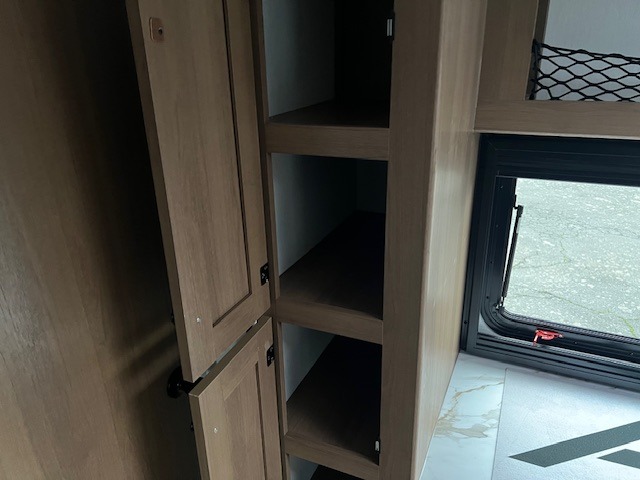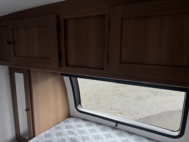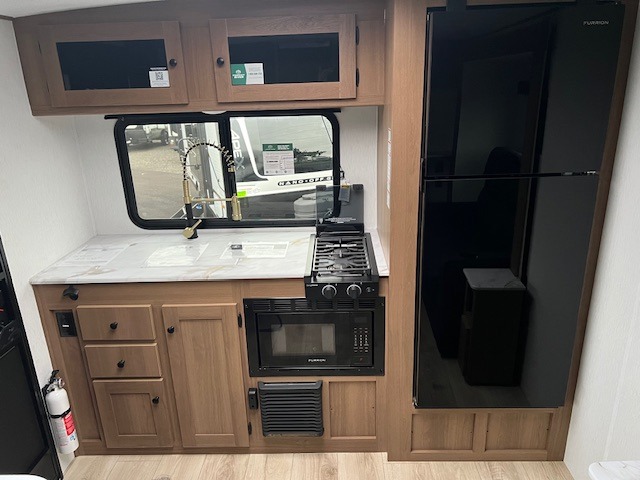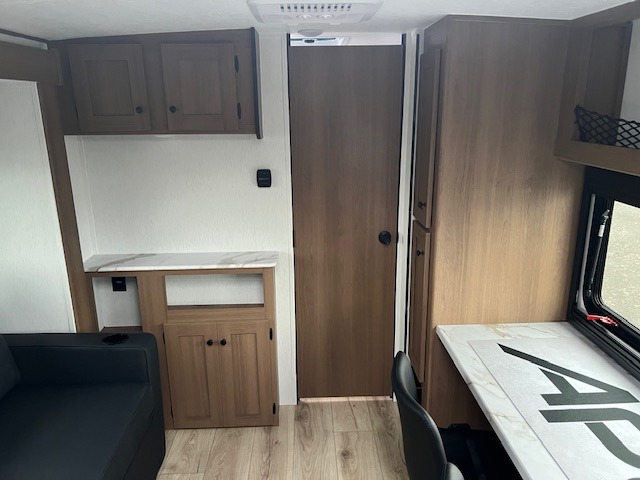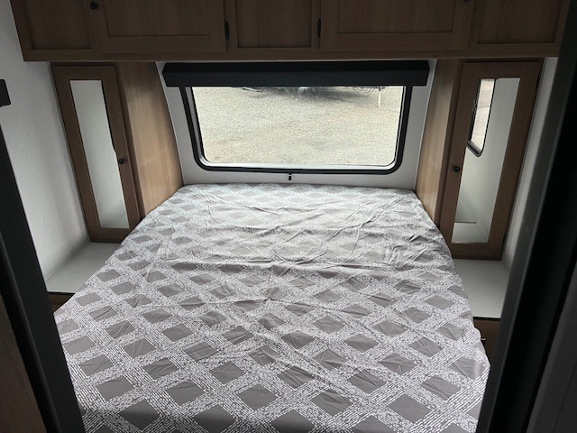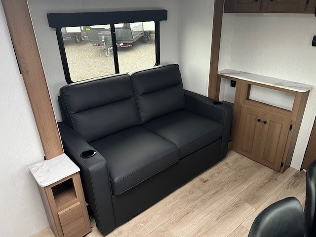 As you step inside, you’re welcomed by a spacious rear kitchen that spans the full width of the trailer, making meal prep both convenient and enjoyable. The kitchen is equipped with a stainless-steel sink featuring a flush mount cover for added counter space, a 2-burner cooktop, an air fryer microwave, and a 10 cu. ft. refrigerator, perfect for storing all your groceries. A pantry adds even more storage for dry goods and kitchen essentials. Just in front of the kitchen, a Bar-V counter with chairs offers a great spot to dine, work, or relax with company. Across from the counter, a comfortable sofa slide provides a cozy lounging area and can also convert into an extra sleeping space when needed. Moving forward, the walk-through bathroom features a shower, a skylight for natural light, and a foot flush toilet for added convenience. At the front of the trailer, the private bedroom includes a queen bed flanked by wardrobes on each side, offering both comfort and practical storage for all your essentials.